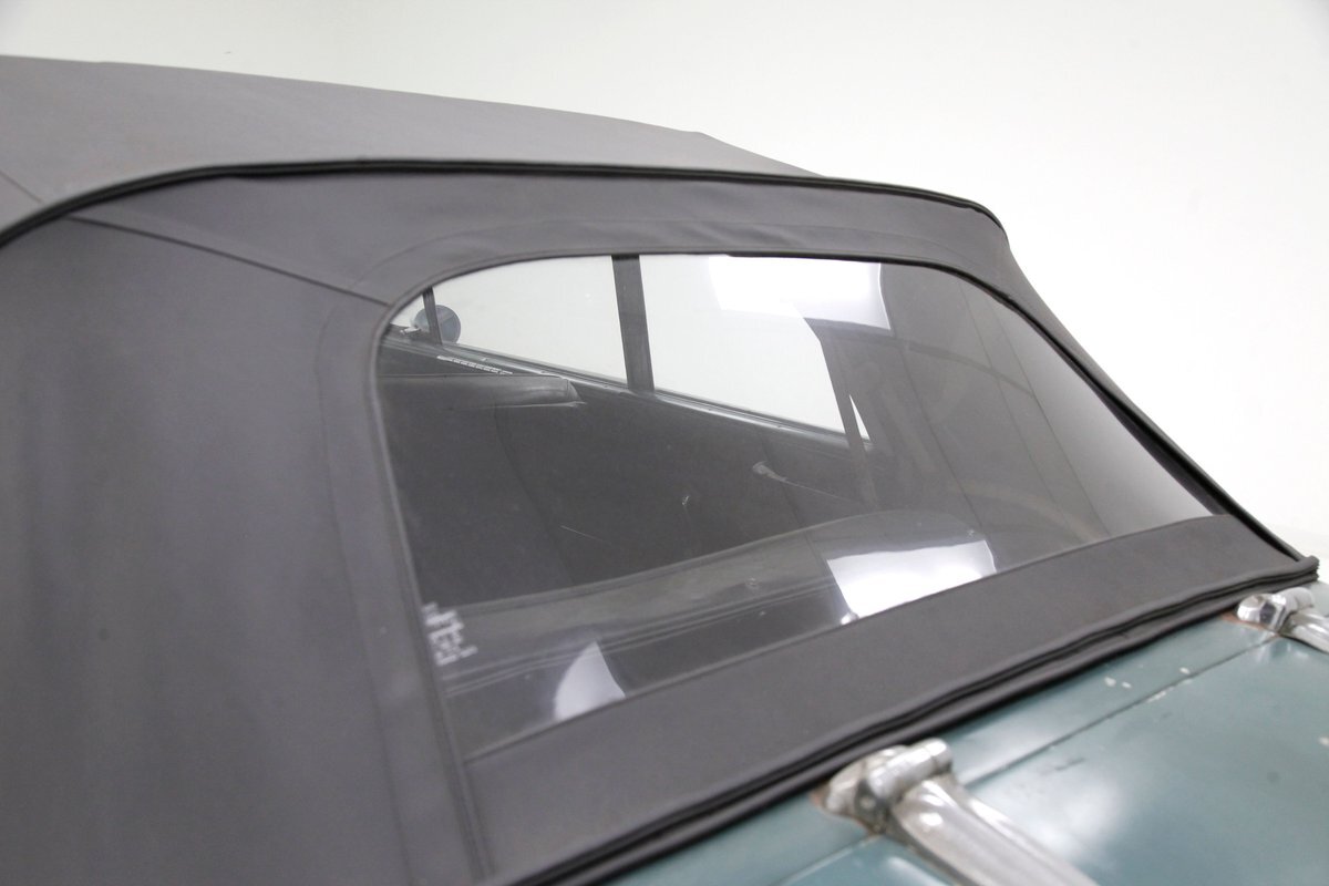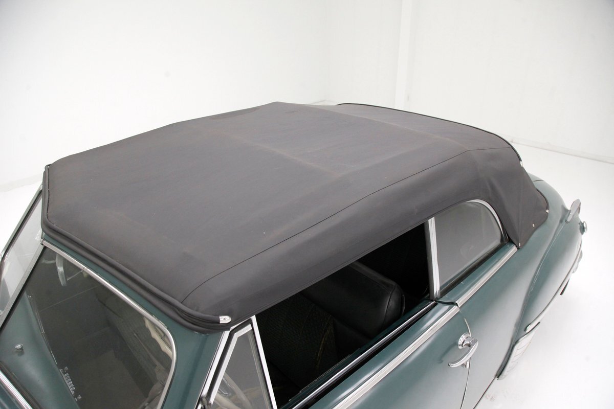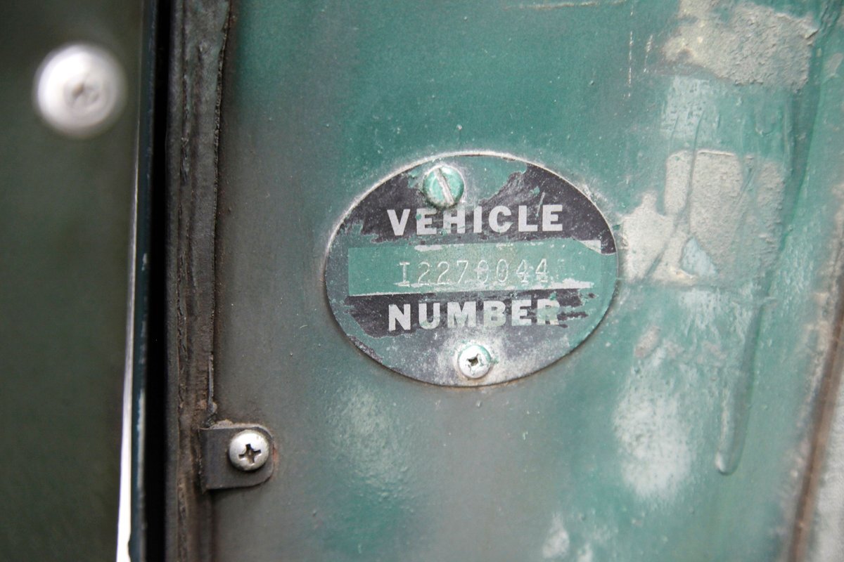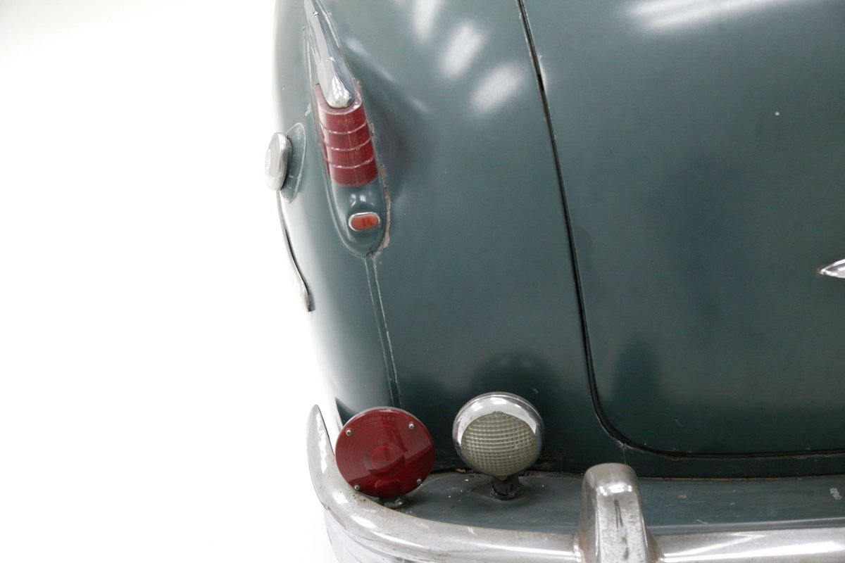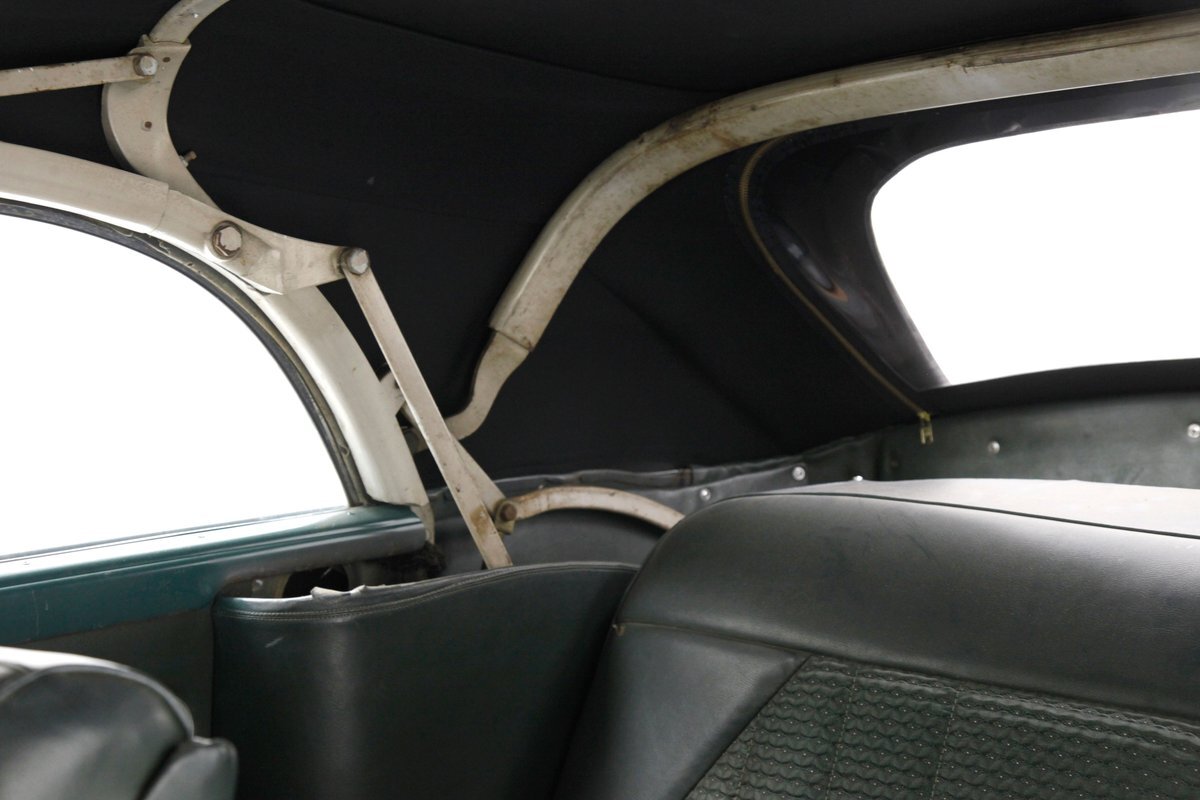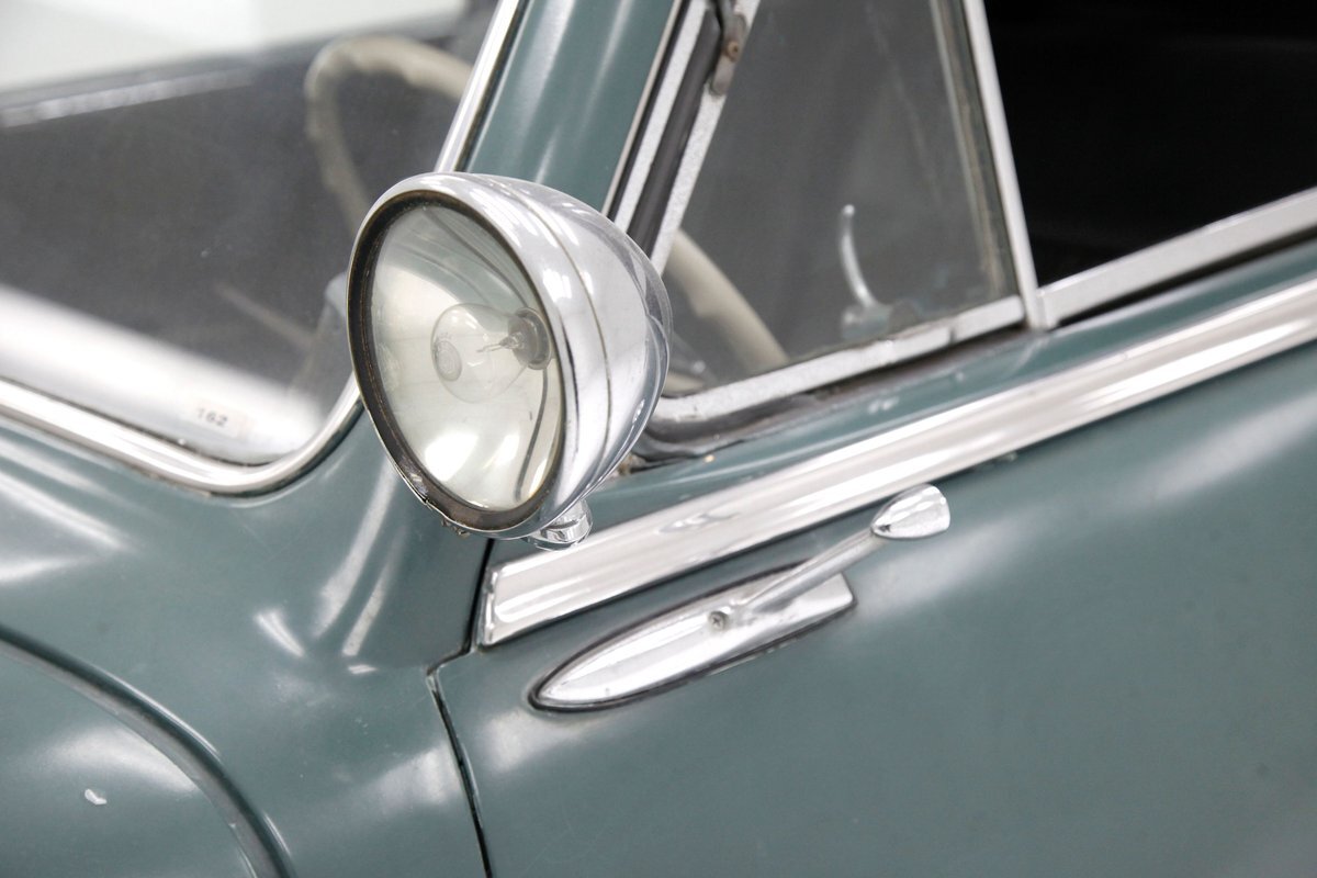 This snazzy design harkens back to a simpler time and can best be described as a presentable example with dull but intact paint and shiny chrome embellishments. Its nose utilizes a mild V formation in triplicate plus 1 for the grille, and a bumper below that is showing light tarnish in this framing. Big wide integrated front fenders flare inward as they move from the door panels to the front where they meet in a peaked hood with a single spear racing back toward the windshield. All this and more steel is bathed in Kitchener Green. Inclusions, signs of body work and bubbling is noted in the finish putting this car into the category of a 20 footer. A split windshield fronts the newer tear free black canvas top which floats above the 2 doors this car has available for the passengers and we note a clear plastic rear window. All rocker trimmings are solid and shiny and support the slab sided doors on either side. The rear design of this car curves downward gracefully, and has a single V-shaped tail light emanating from each rear fender with chrome trimmed spear on top and a curved bumper on the bottom. Nicely preserved big dog dish wheel covers are wrapped by wide white bias ply tires all around.