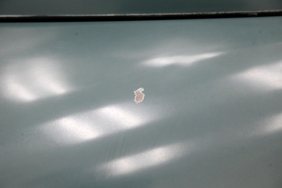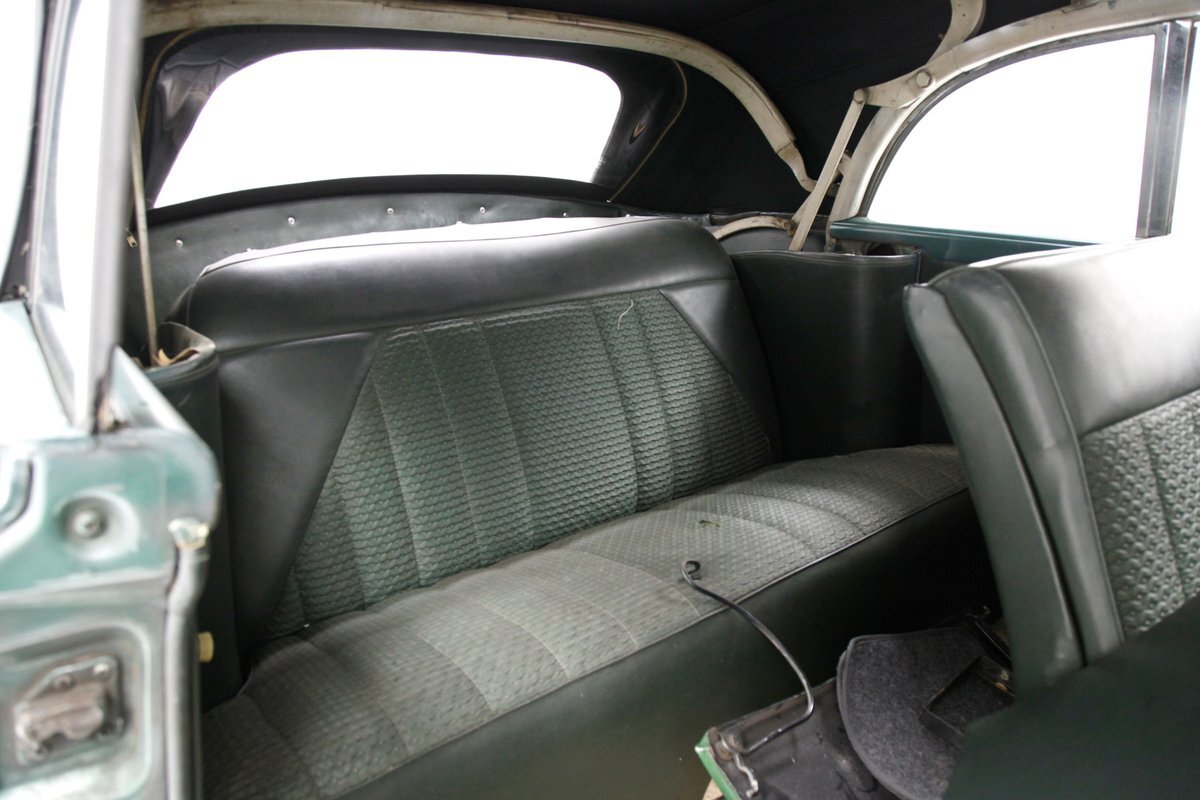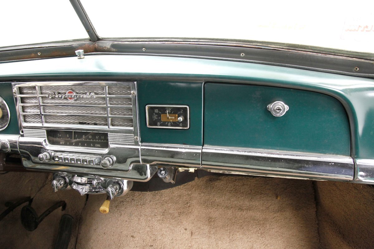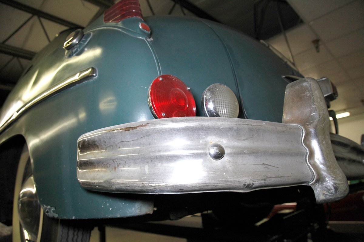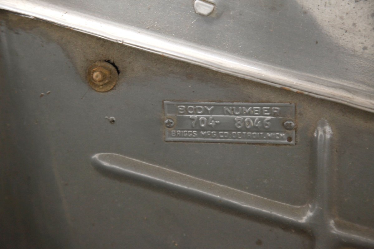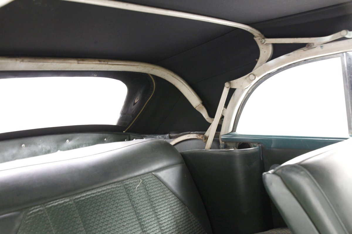 This snazzy design harkens back to a simpler time and can best be described as a presentable example with dull but intact paint and shiny chrome embellishments. Its nose utilizes a mild V formation in triplicate plus 1 for the grille, and a bumper below that is showing light tarnish in this framing. Big wide integrated front fenders flare inward as they move from the door panels to the front where they meet in a peaked hood with a single spear racing back toward the windshield. All this and more steel is bathed in Kitchener Green. Inclusions, signs of body work and bubbling is noted in the finish putting this car into the category of a 20 footer. A split windshield fronts the newer tear free black canvas top which floats above the 2 doors this car has available for the passengers and we note a clear plastic rear window. All rocker trimmings are solid and shiny and support the slab sided doors on either side. The rear design of this car curves downward gracefully, and has a single V-shaped tail light emanating from each rear fender with chrome trimmed spear on top and a curved bumper on the bottom. Nicely preserved big dog dish wheel covers are wrapped by wide white bias ply tires all around.