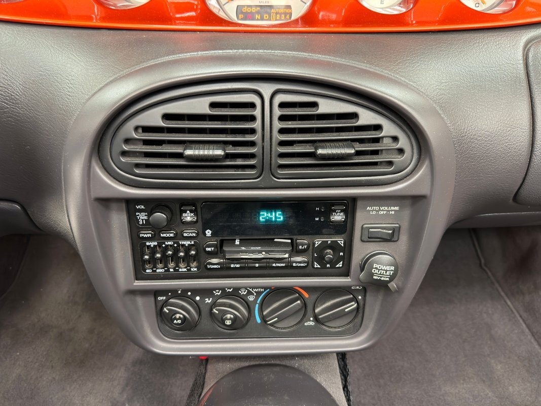 On the door panels we find more customization in the form of body colored insert and speakers, and custom door pockets. Chrome door sill covers have been added. Black leather bucket seats are in fine condition and provide a comfortable perch, embossed with the Prowler logo and topped with headrests dressed in chrome. Behind the seats, speakers and an 8" subwoofer. The steering wheel wears a leather cover and shares real estate on the column with a tachometer and transmission temperature gauge. All other gauges, including the speedometer, are found in a body colored panel in the center of the dashboard. A chrome knob tops the shifter which sits in a chrome base in the center console behind the AM/FM/cassette radio with CD changer and A/C controls in the standard center stack. Black low pile carpet covers the floor and looks fresh, and the trunk is also lined but there is limited room for storage.