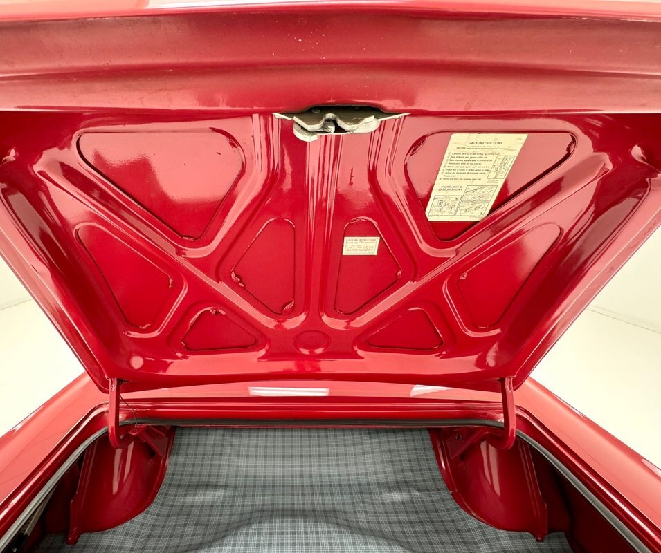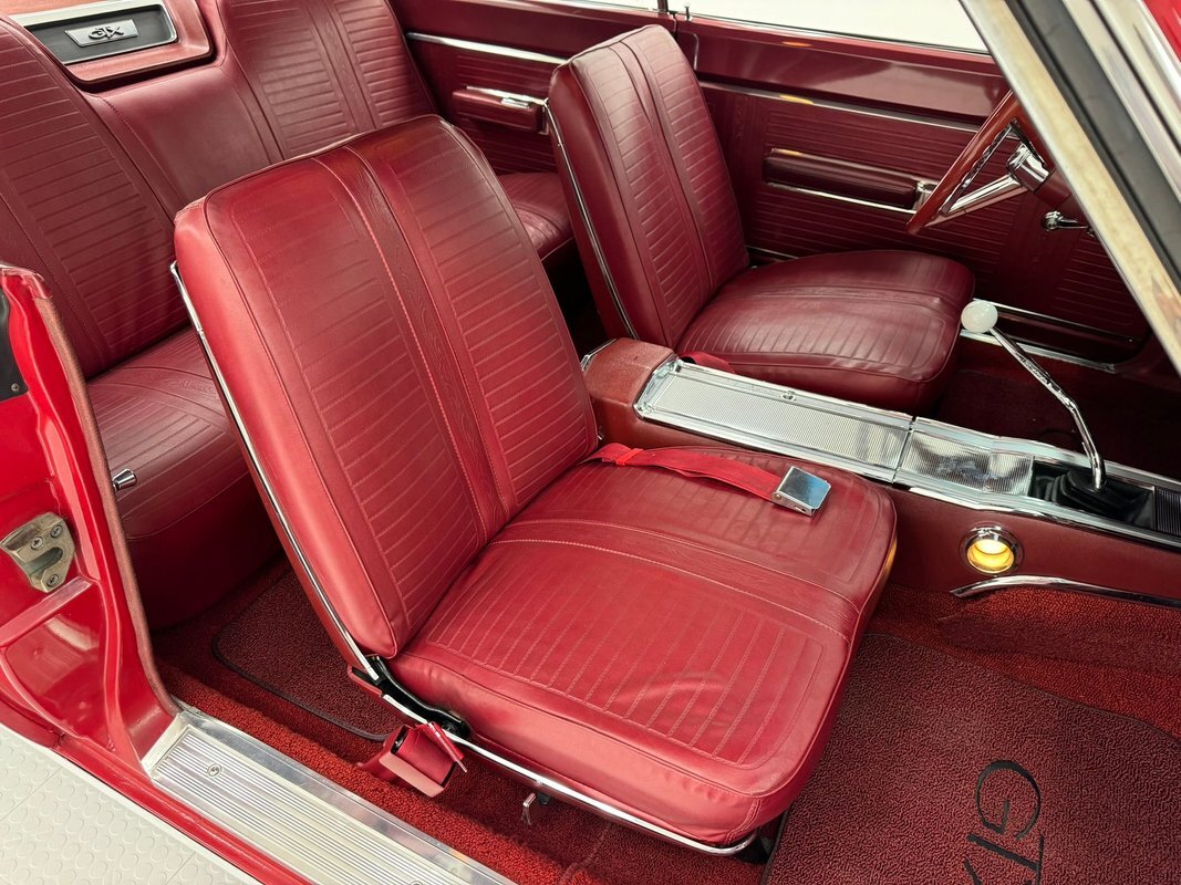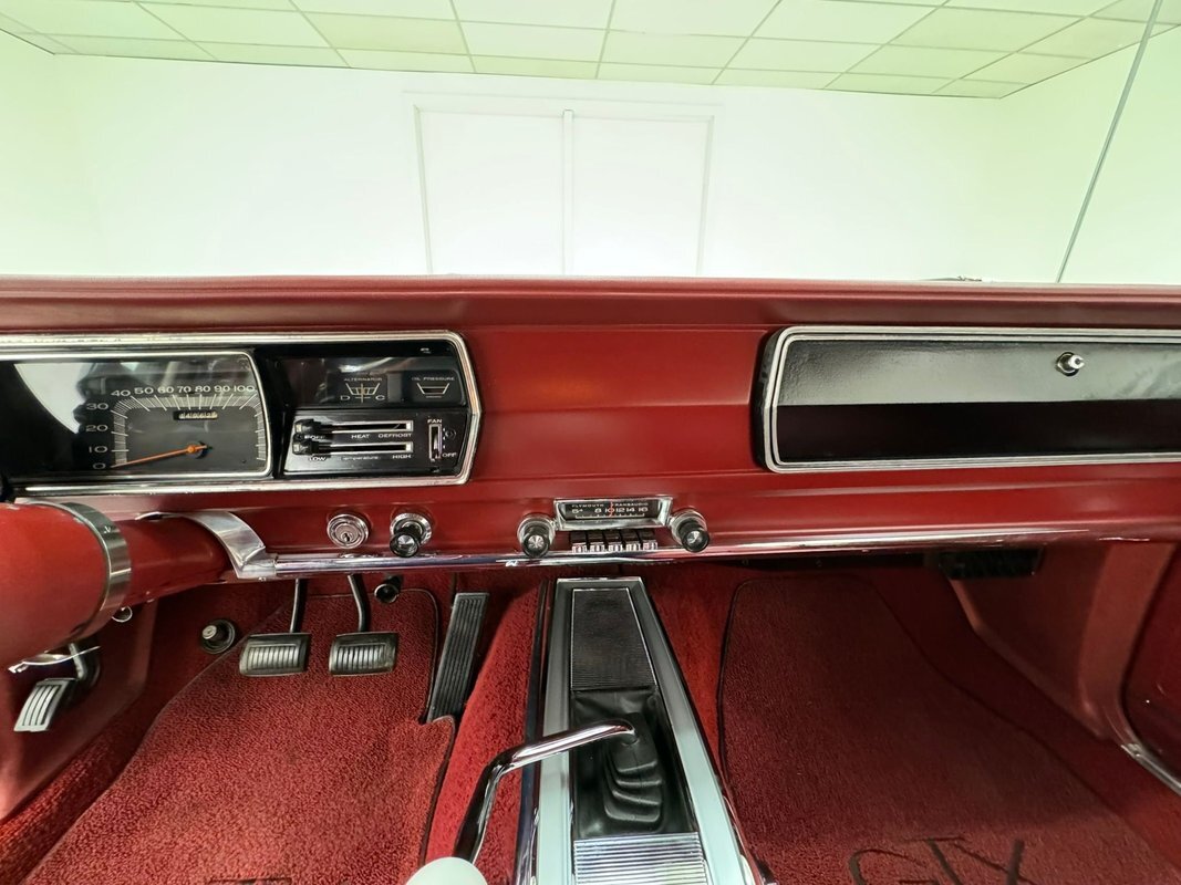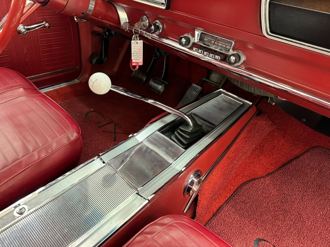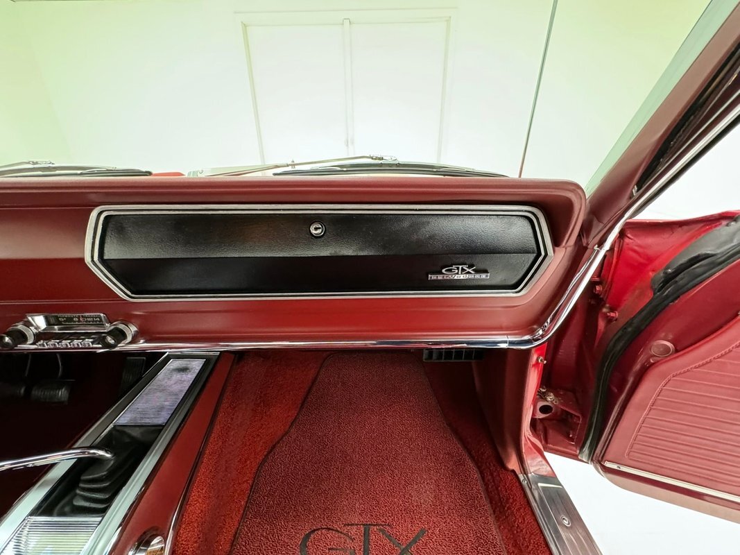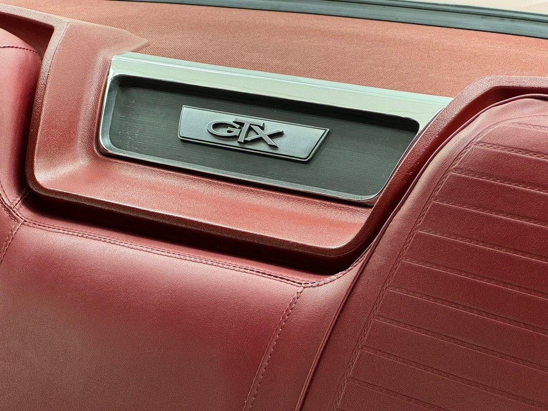 Minty mint door panels with painted top rails leading to red vinyl inserts stamped within patterns greet us with the opening of the doors. The armrest and door actuator are on the same plane while the window crank and mirror "pivot rod" are well within reach. The red premium bucket seats are here presenting very nicely with patterned vinyl. The rear bench has a fantastic center dip that reveals a GTX emblem, for those times when you look in your rear-view mirror at the competition and are affirmed in your choice of vehicle. The red plastic steering wheel has a horn ring with views of the column-mounted tachometer. The rest of the dash is standard and original, and one cannot help notice the 150 mph speedometer! An AM radio is embedded in the dash, this was long before head units came into play and the radio was just part of the car. The metal and plastic center console is an impeccable ode to the 60's and the only place showing any wear with a few scratches in the plating. The shifter is the joystick that makes this beast go! The low pile red carpet and stitched headliner, both perfect! The trunk is immaculate and has the plaid mat so common in this time period. The trunk lid retains original decals. Chef's kiss for that!