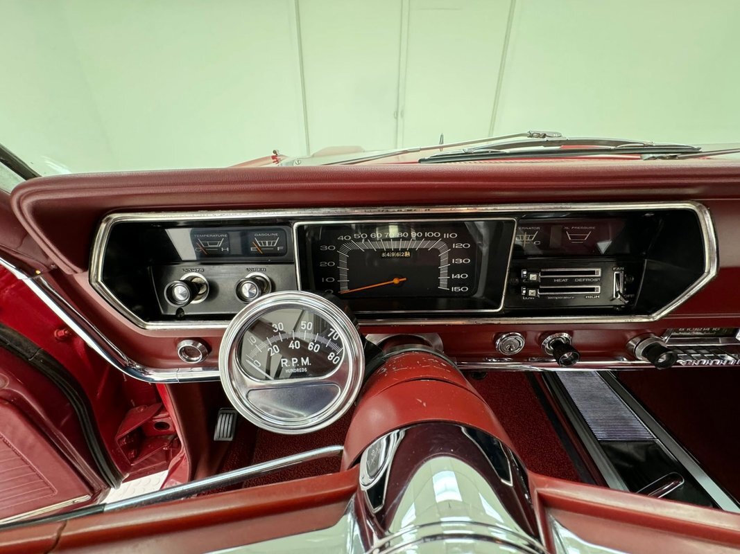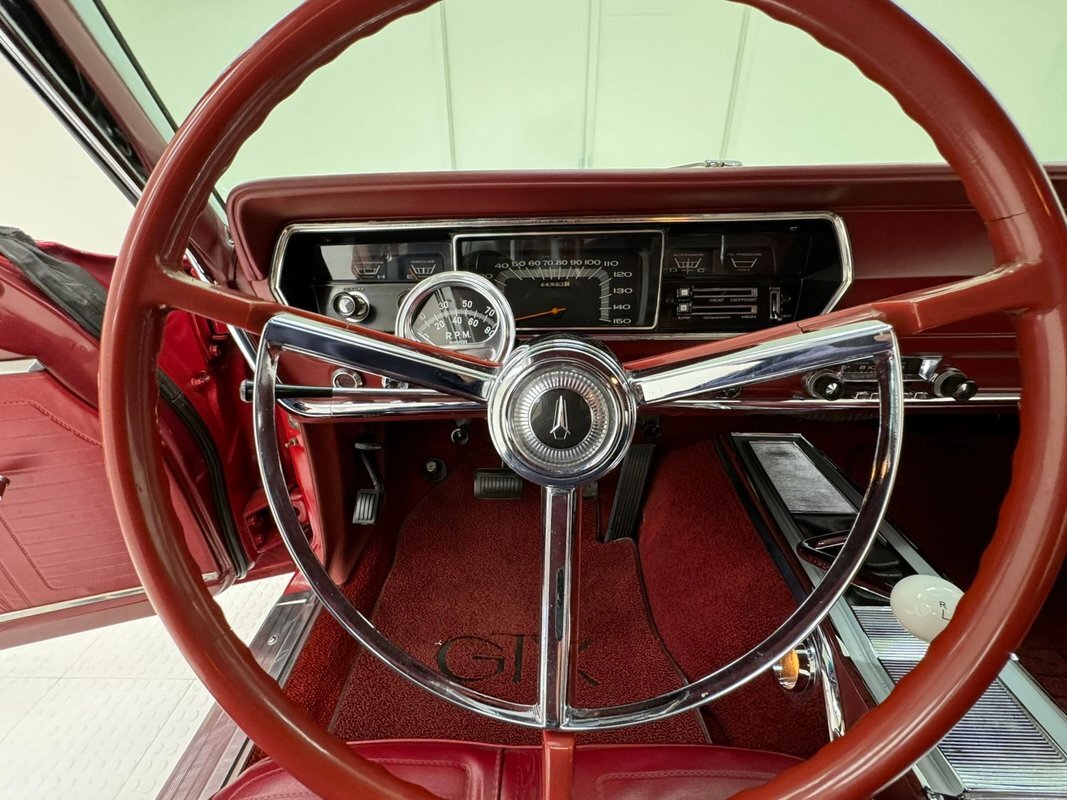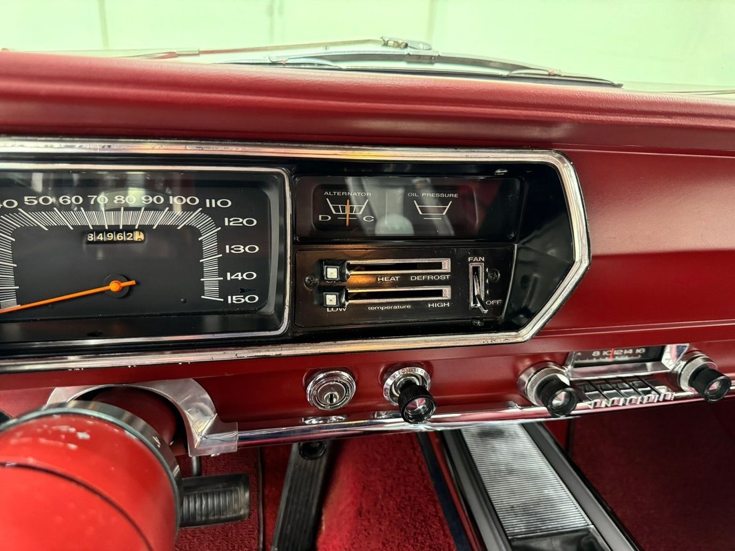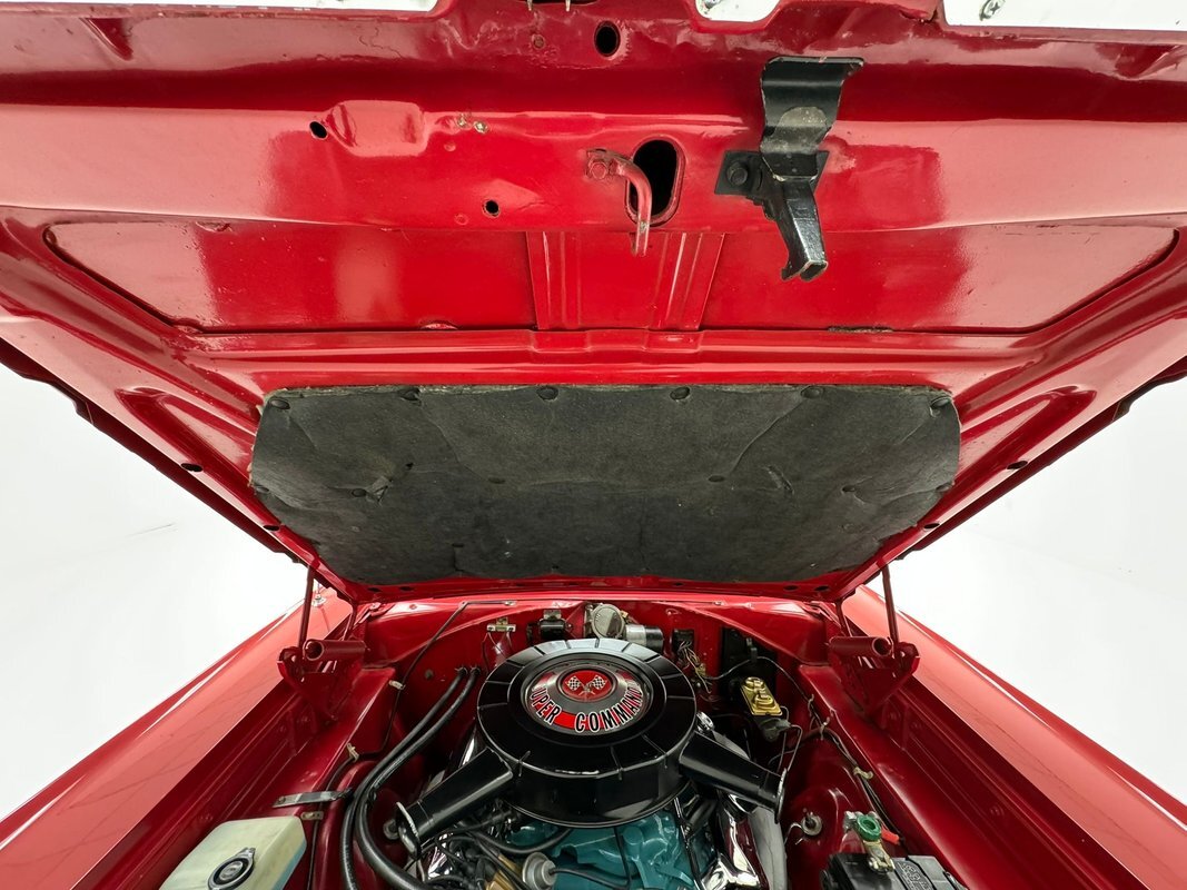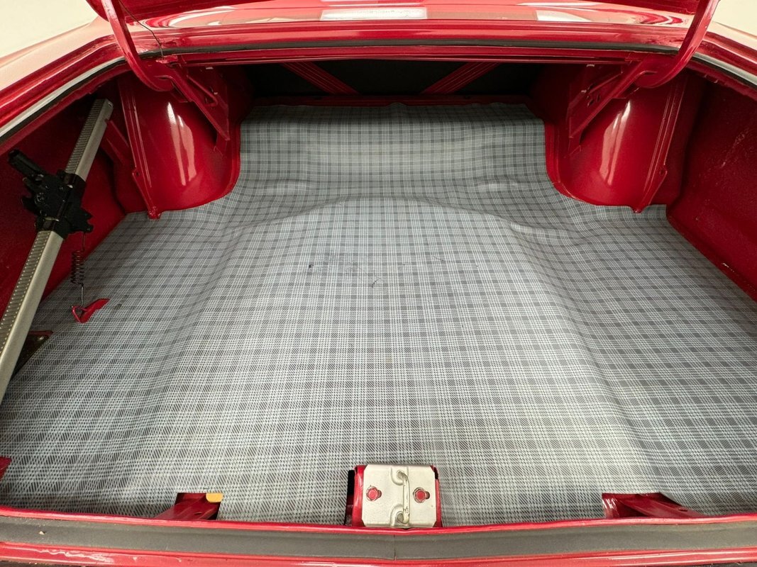 Minty mint door panels with painted top rails leading to red vinyl inserts stamped within patterns greet us with the opening of the doors. The armrest and door actuator are on the same plane while the window crank and mirror "pivot rod" are well within reach. The red premium bucket seats are here presenting very nicely with patterned vinyl. The rear bench has a fantastic center dip that reveals a GTX emblem, for those times when you look in your rear-view mirror at the competition and are affirmed in your choice of vehicle. The red plastic steering wheel has a horn ring with views of the column-mounted tachometer. The rest of the dash is standard and original, and one cannot help notice the 150 mph speedometer! An AM radio is embedded in the dash, this was long before head units came into play and the radio was just part of the car. The metal and plastic center console is an impeccable ode to the 60's and the only place showing any wear with a few scratches in the plating. The shifter is the joystick that makes this beast go! The low pile red carpet and stitched headliner, both perfect! The trunk is immaculate and has the plaid mat so common in this time period. The trunk lid retains original decals. Chef's kiss for that!