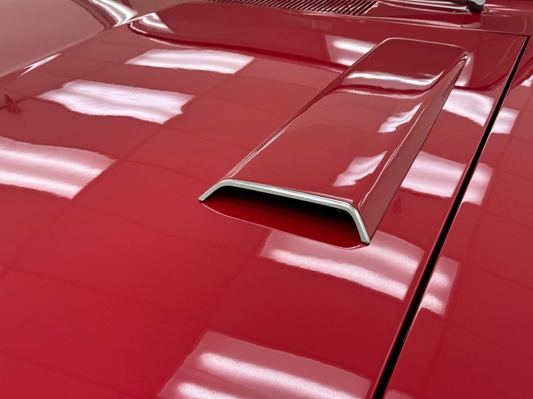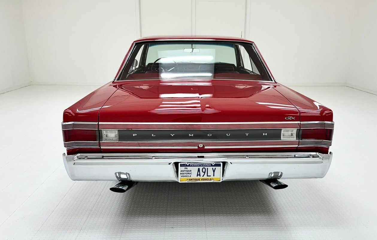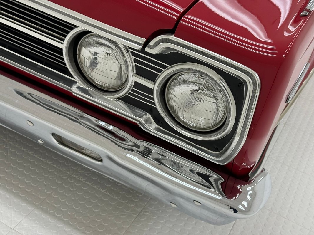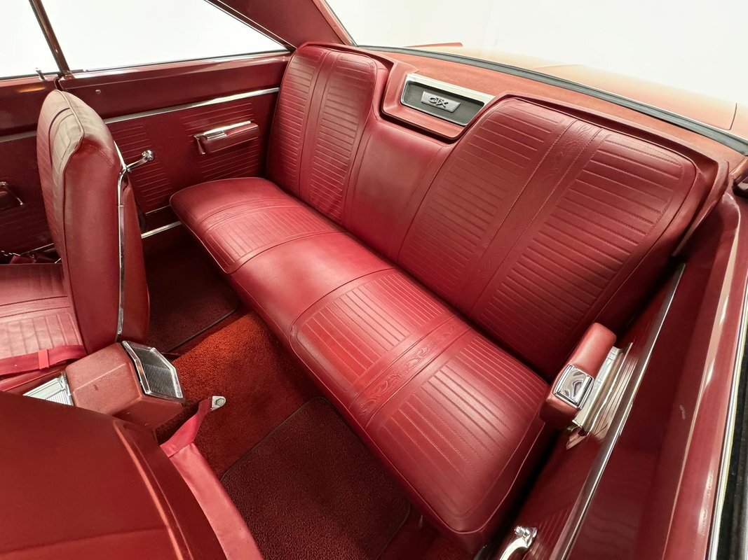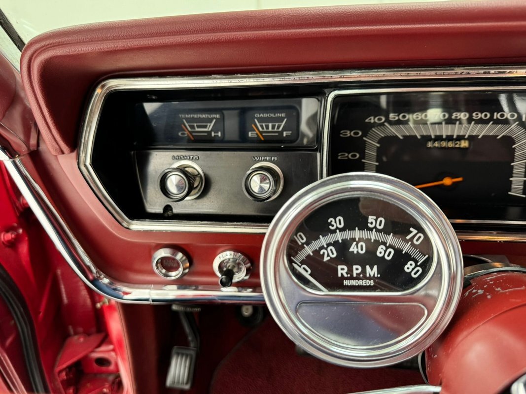 Minty mint door panels with painted top rails leading to red vinyl inserts stamped within patterns greet us with the opening of the doors. The armrest and door actuator are on the same plane while the window crank and mirror "pivot rod" are well within reach. The red premium bucket seats are here presenting very nicely with patterned vinyl. The rear bench has a fantastic center dip that reveals a GTX emblem, for those times when you look in your rear-view mirror at the competition and are affirmed in your choice of vehicle. The red plastic steering wheel has a horn ring with views of the column-mounted tachometer. The rest of the dash is standard and original, and one cannot help notice the 150 mph speedometer! An AM radio is embedded in the dash, this was long before head units came into play and the radio was just part of the car. The metal and plastic center console is an impeccable ode to the 60's and the only place showing any wear with a few scratches in the plating. The shifter is the joystick that makes this beast go! The low pile red carpet and stitched headliner, both perfect! The trunk is immaculate and has the plaid mat so common in this time period. The trunk lid retains original decals. Chef's kiss for that!