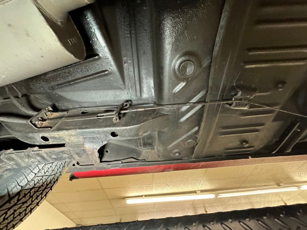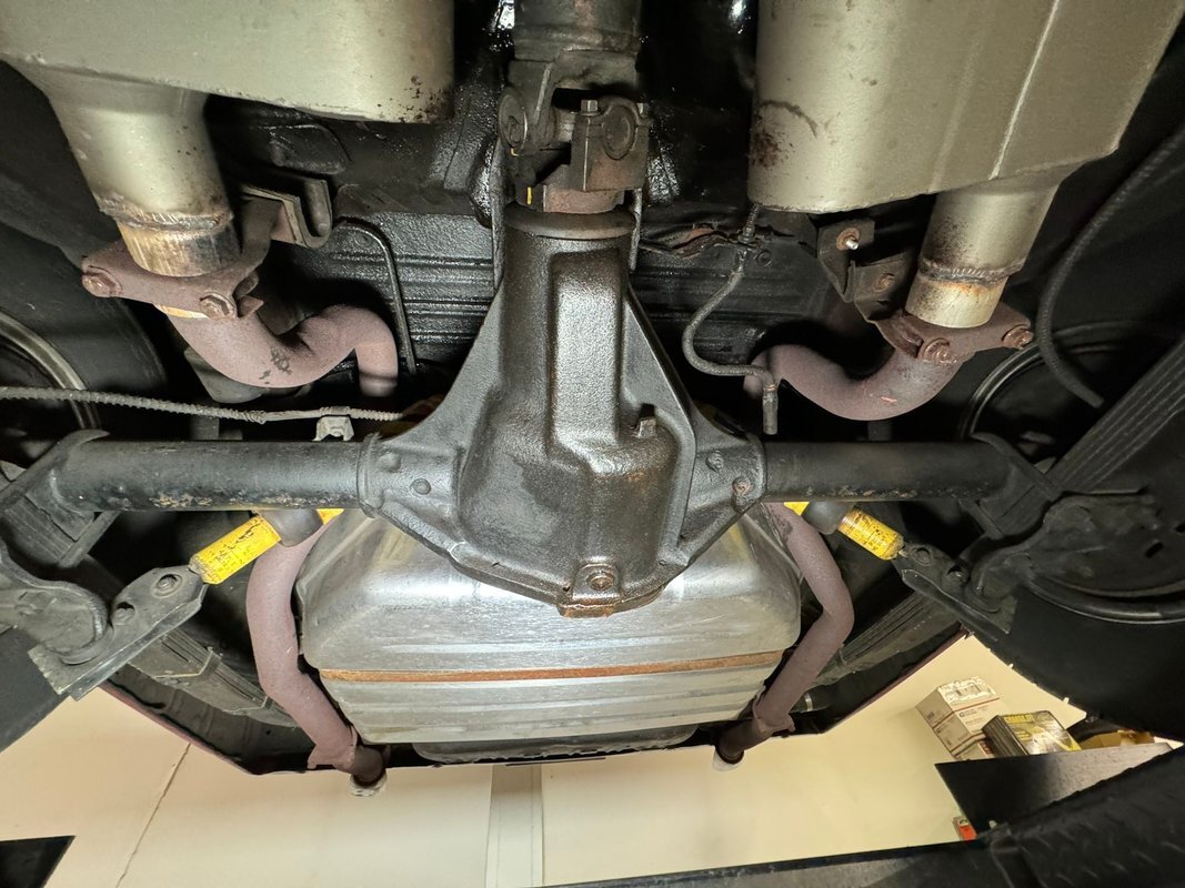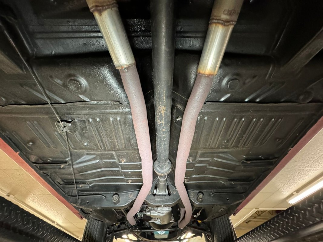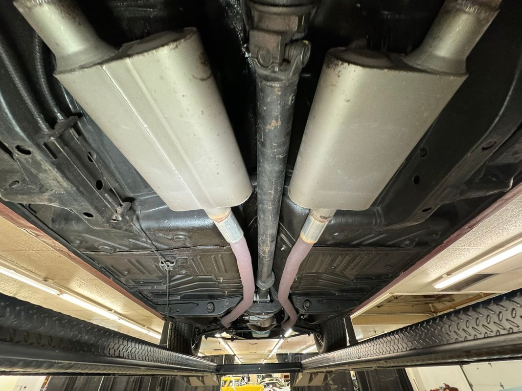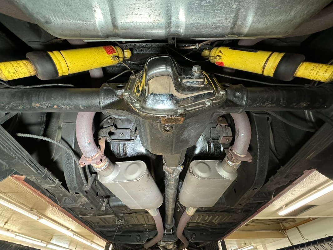 A deep breath as our four-post lift hums skyward, we so want the underside to be in line with the quality of the top side, and we weren't disappointed! Everything is clean and dry and rust free. The dual exhaust has some surface rust but the Flowmaster mufflers look fine. A chrome differential cover is noted as are yellow Monroe shocks at each corner, the rears appear to be adjustable air shocks. Torsion bar suspension in front and leaf springs in back. All looking very, very nice.