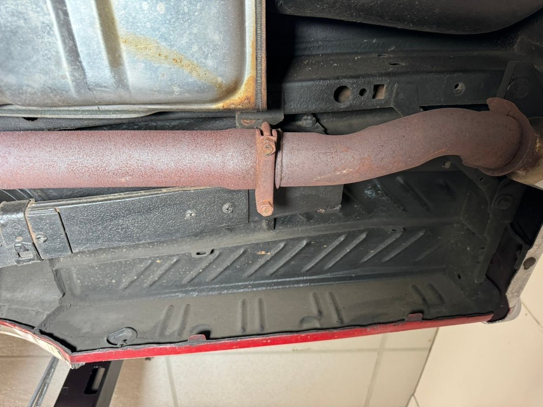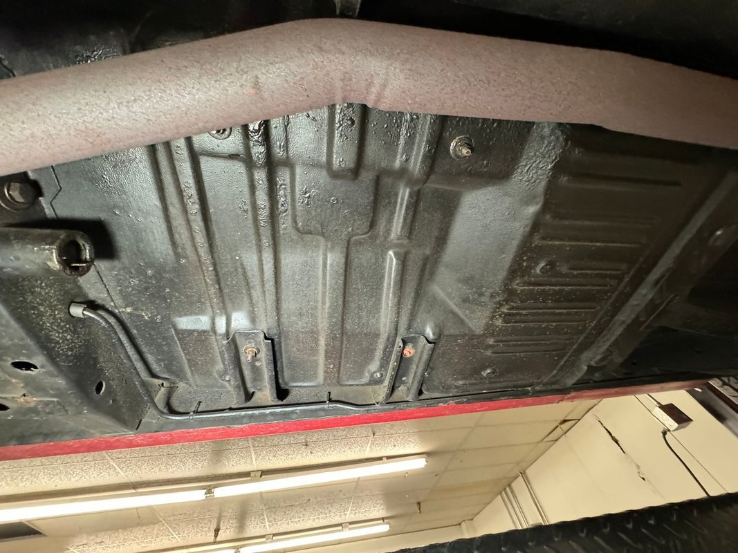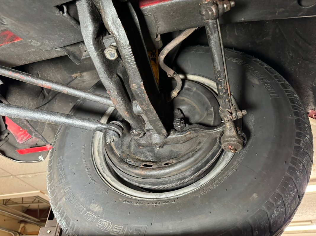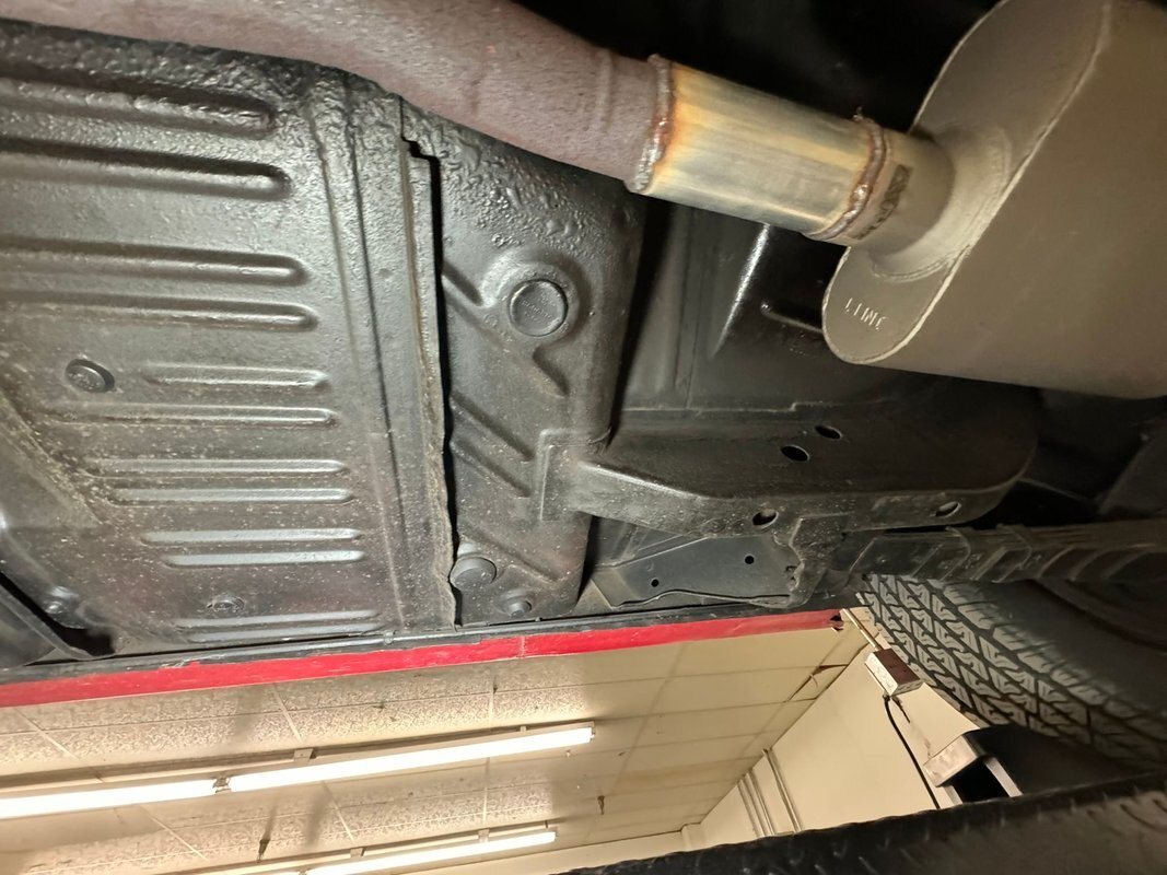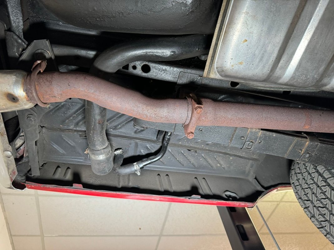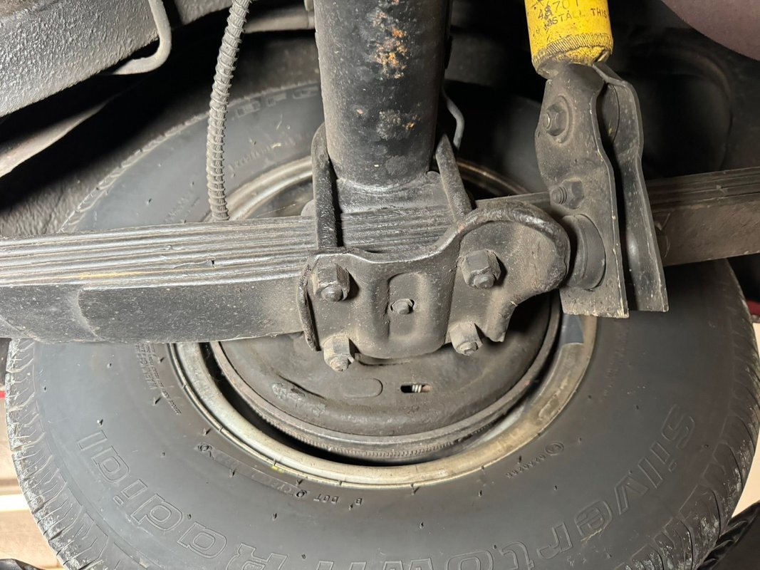 A deep breath as our four-post lift hums skyward, we so want the underside to be in line with the quality of the top side, and we weren't disappointed! Everything is clean and dry and rust free. The dual exhaust has some surface rust but the Flowmaster mufflers look fine. A chrome differential cover is noted as are yellow Monroe shocks at each corner, the rears appear to be adjustable air shocks. Torsion bar suspension in front and leaf springs in back. All looking very, very nice.