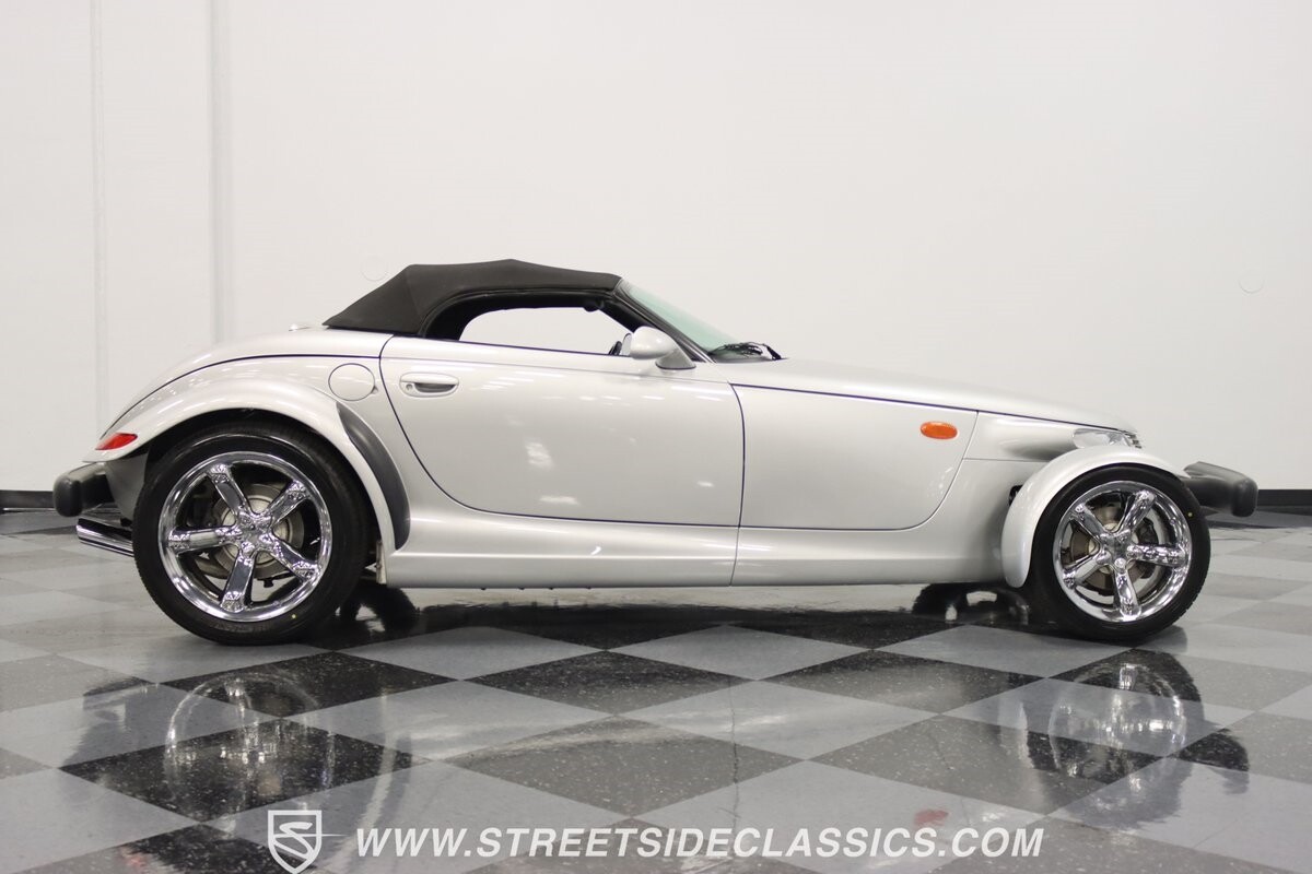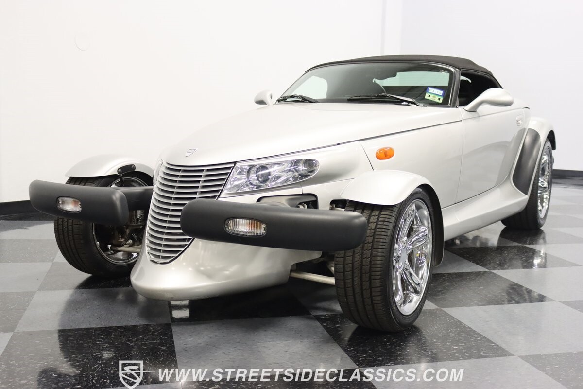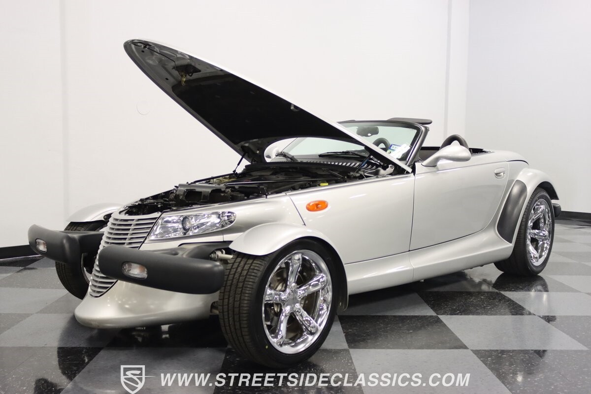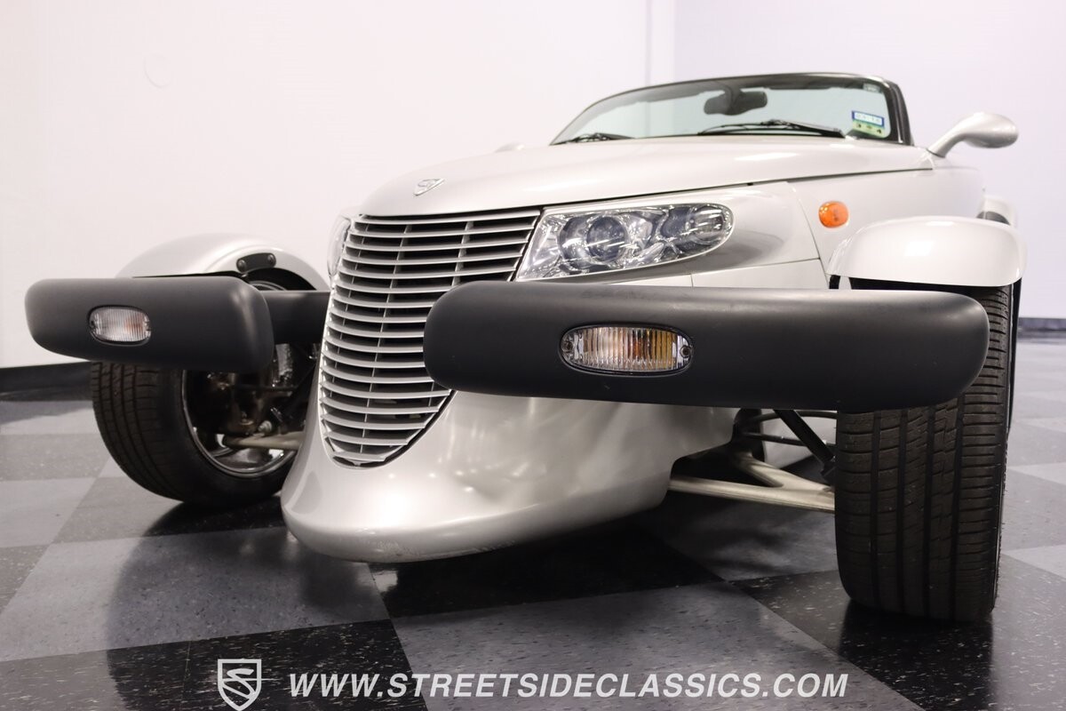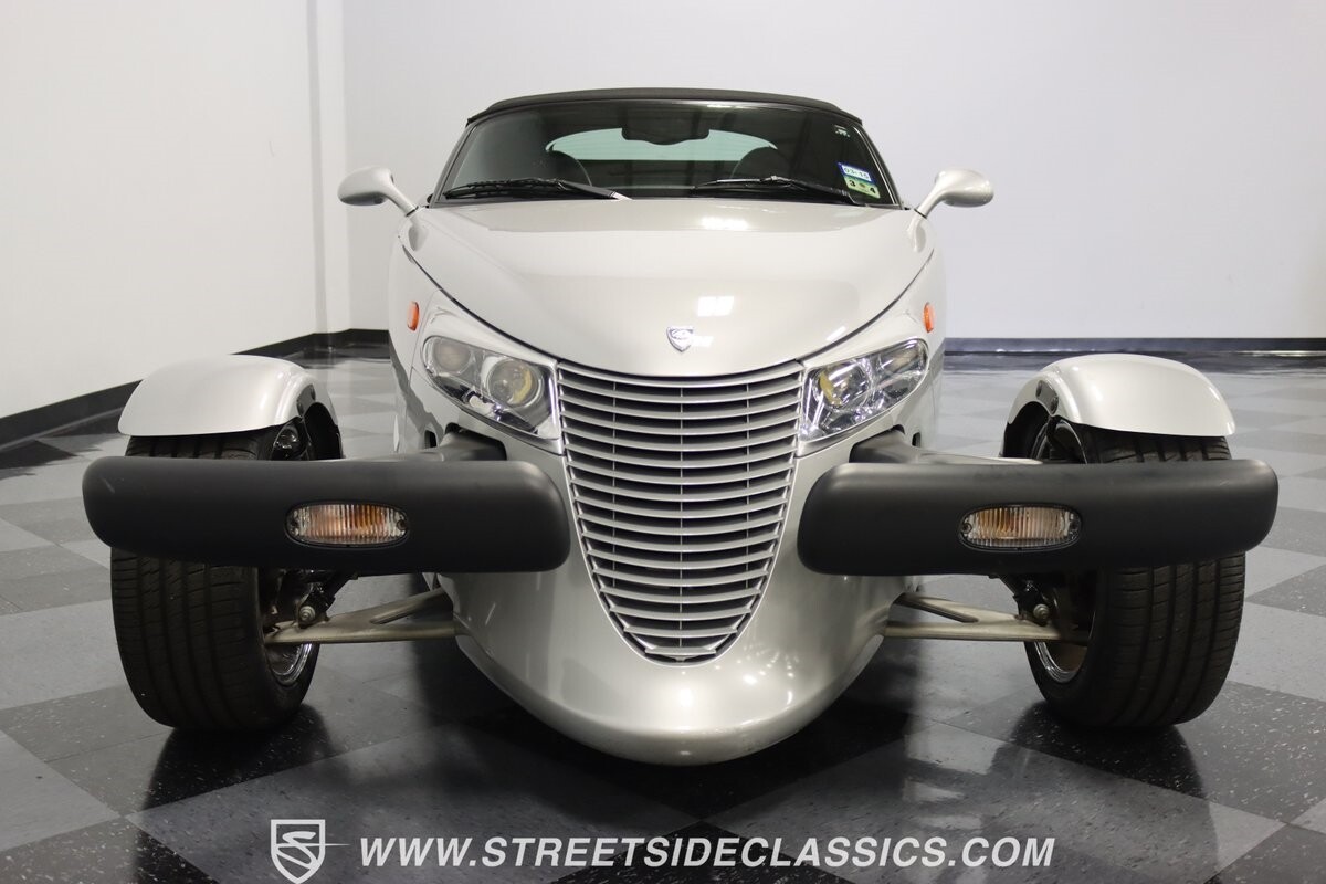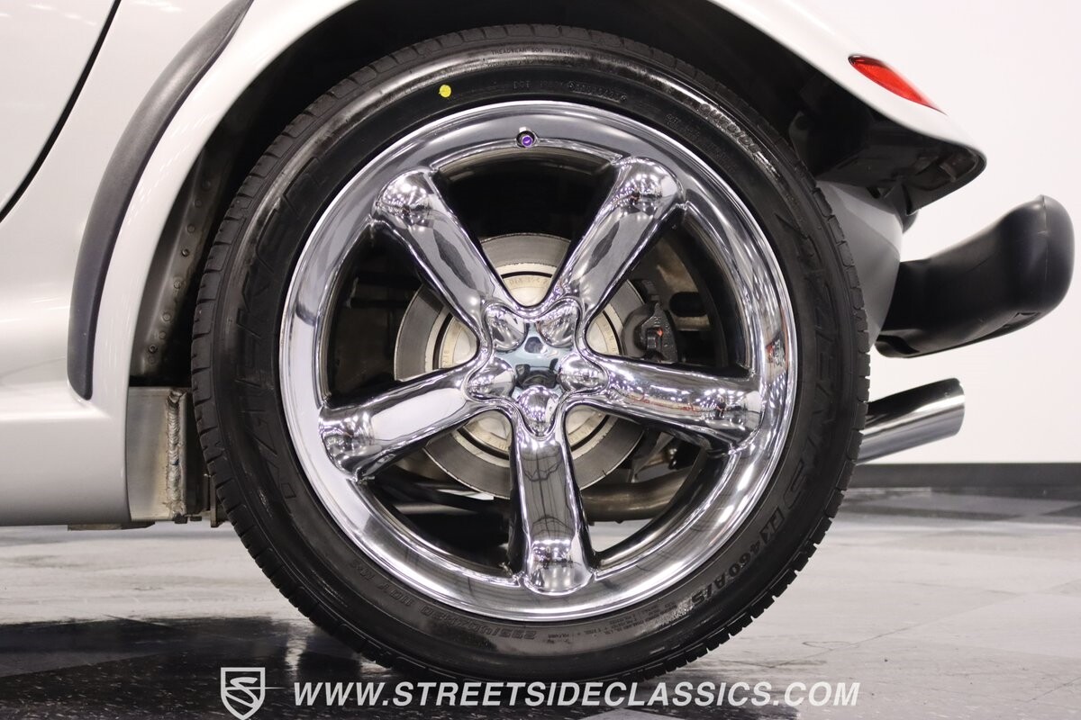 The black roof looks terrific with its low-slung style against the bright silver paint, but it looks even better when lowered. There is an almost matte gray appearance from the supple leather upholstery. It offers an air of distinction while still being complementary to the sleek Silver exterior paint - the kind of color scheme you would expect from a European sports car. While the Prowler is inspired by the best in classic hot rods, this one certainly has a more international flair. Low mileage means a good-looking car and this loaded interior looks inviting. The welcome features like a powerful AM/FM/cassette factory stereo w/CD changer, power windows, power locks, keyless entry, cruise control, dual airbags, ABS and cold-blowing air conditioning. The sleek black instrument panel allows the white-faced gauges to stand out even bolder.