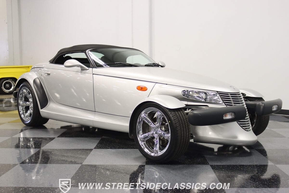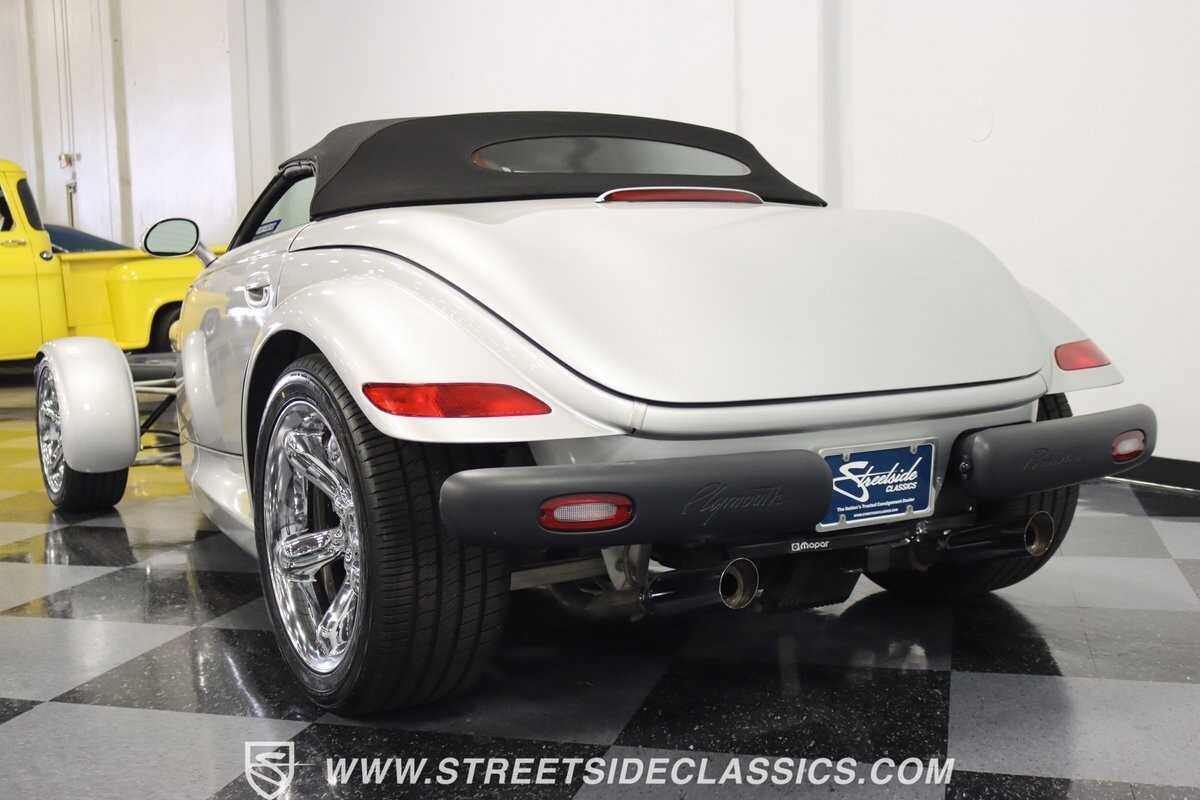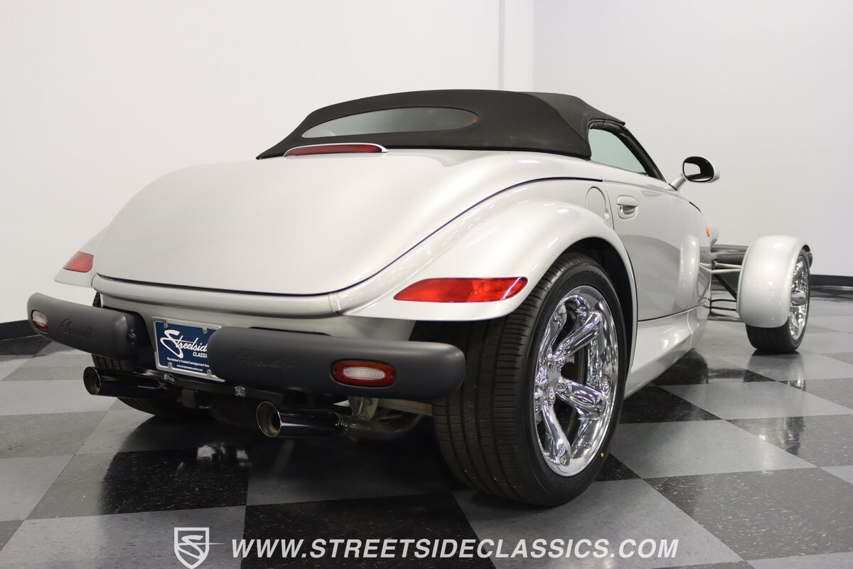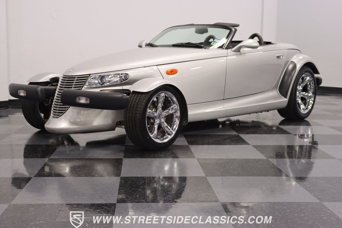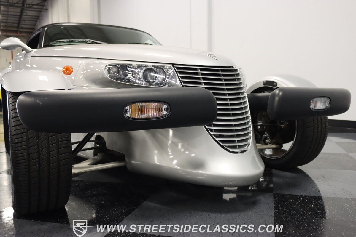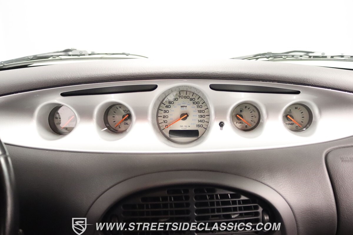 The black roof looks terrific with its low-slung style against the bright silver paint, but it looks even better when lowered. There is an almost matte gray appearance from the supple leather upholstery. It offers an air of distinction while still being complementary to the sleek Silver exterior paint - the kind of color scheme you would expect from a European sports car. While the Prowler is inspired by the best in classic hot rods, this one certainly has a more international flair. Low mileage means a good-looking car and this loaded interior looks inviting. The welcome features like a powerful AM/FM/cassette factory stereo w/CD changer, power windows, power locks, keyless entry, cruise control, dual airbags, ABS and cold-blowing air conditioning. The sleek black instrument panel allows the white-faced gauges to stand out even bolder.