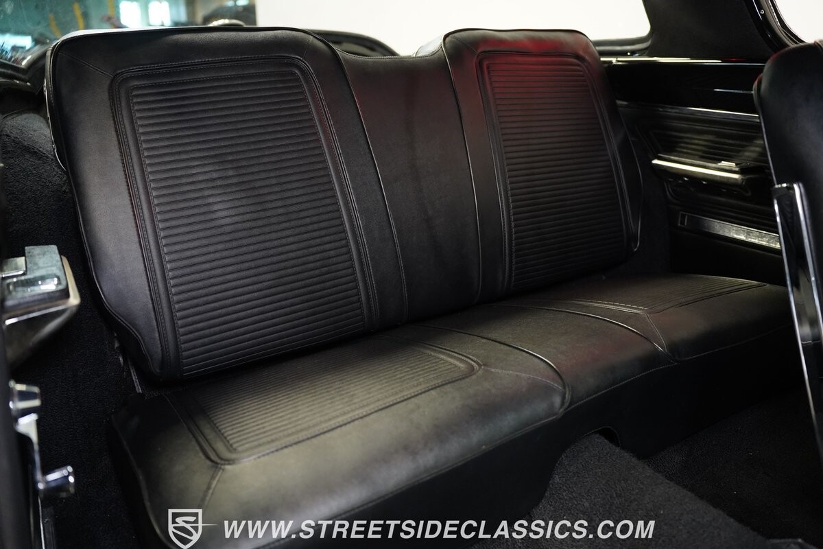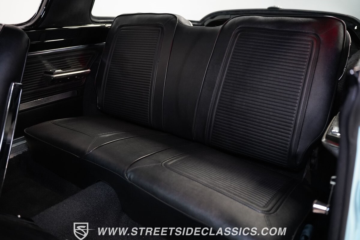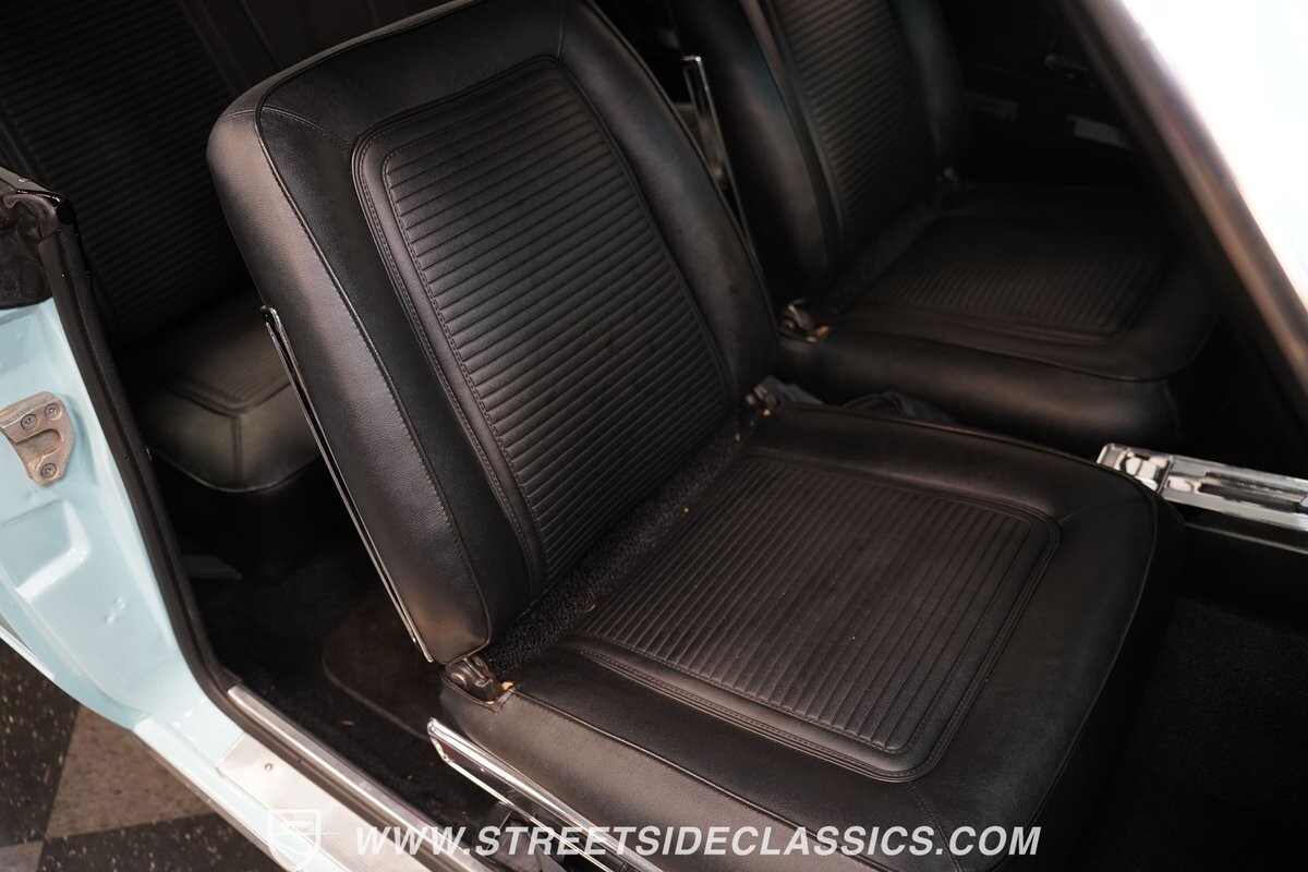 Inside, the Plymouth Barracuda features a black vinyl bench seat that pairs with matching door panels, preserving the vehicle's authentic muscle car ethos. The floor-mounted shifter adds to the interactive driving experience, while the simple yet functional layout of the dashboard, complete with a working AM radio, reflects the straightforward interiors typical of its era.