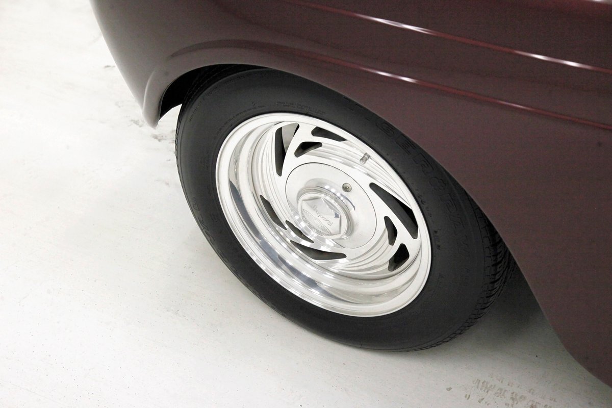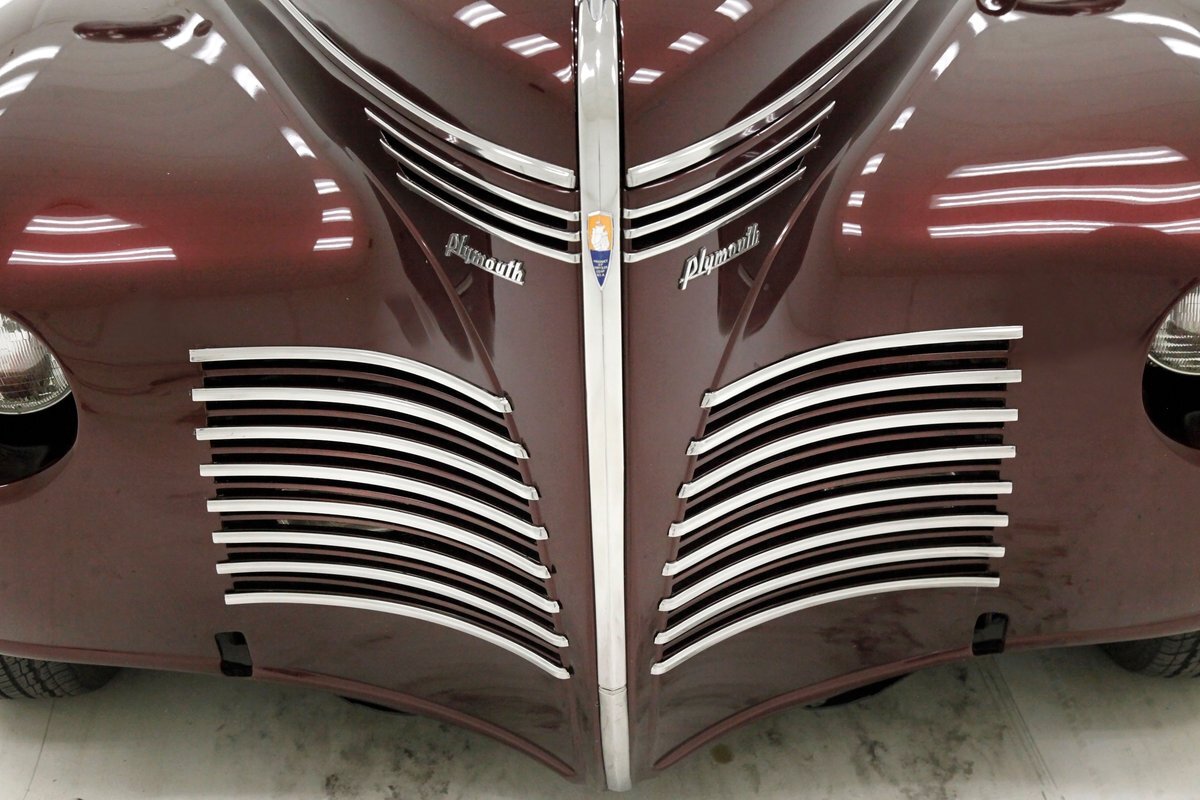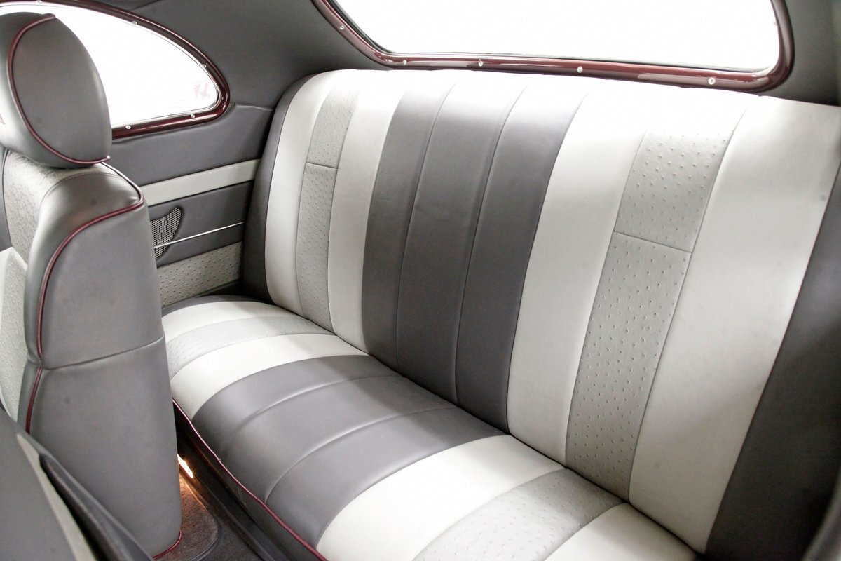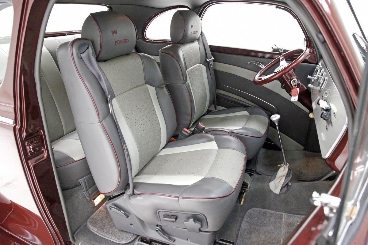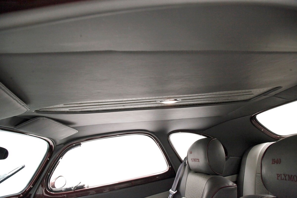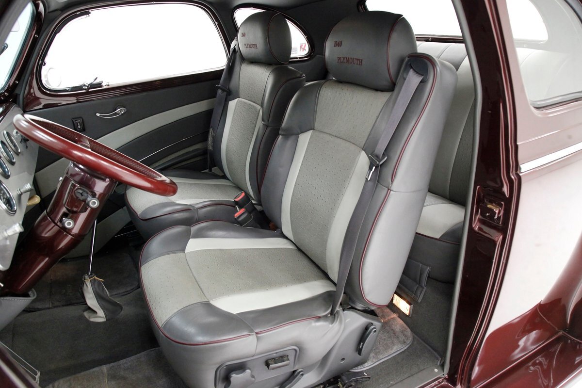 Deep inset frenched headlights are the front end highlight and these are on either corner of a very curvaceous front grille. The grille has a vertical trimming that rises gracefully to the top of the bodacious bulbous hood. At its front round over point, a horizontal trimming begins its journey along the side of the hood and eventually runs the length of the car at the upper door line then on to the rear quarters. The front bumper has been shaved and this actually accentuates the lines with the mix of the chrome trimmings and the deep end of the pool dark candy red, which has been expertly applied. All new reproduction glass has been fitted and the car retains much of its original charm with the english wheel shaped fenders and a small running board. A rounded rear glass begins the long gently curving trunk lid which goes with the rear quarters and makes its way to the rear chrome bumper still on the car. The license plate has been frenched into the lid and some chrome bezeled vertical tail lights are on the curvaceous fenders. Chromed 15-inch American Racing "hurricane" style wheels are wrapped by 195/55R15's on front and beefier 225/75R15's on back for that extra push off the line. Badging and chrome are all just perfectly restored for this Plymouth rod.