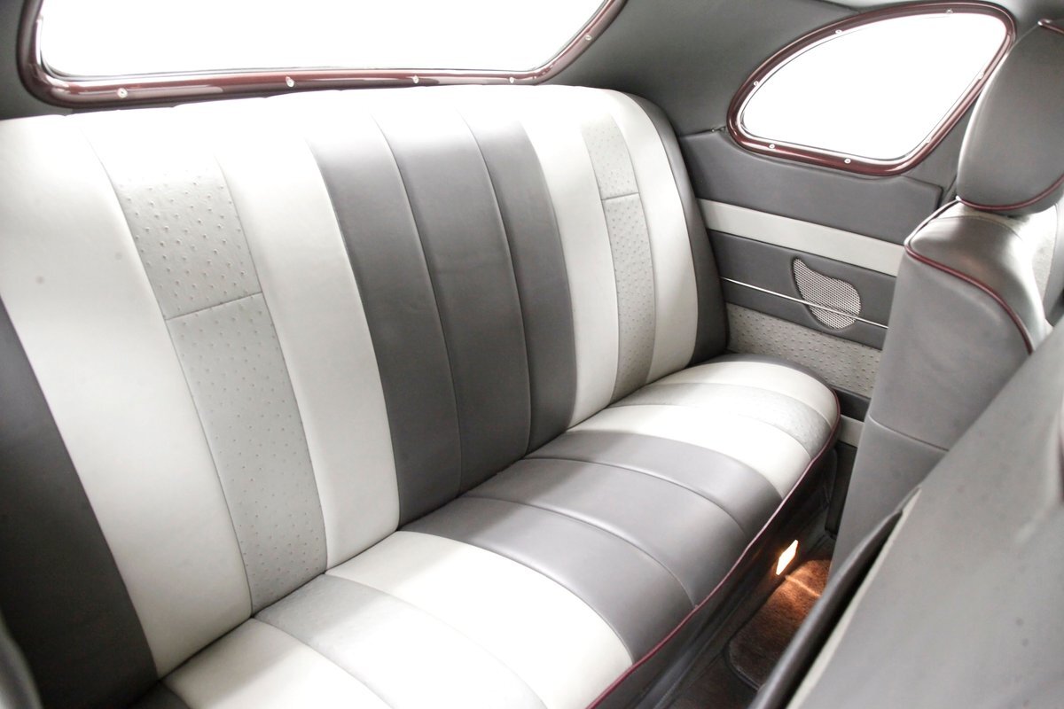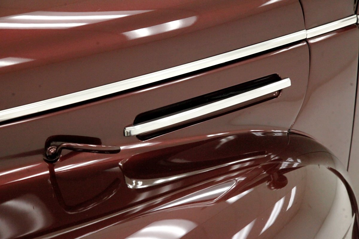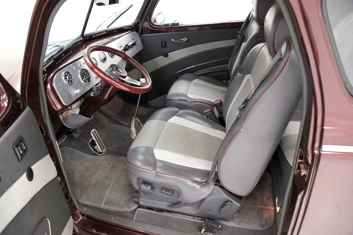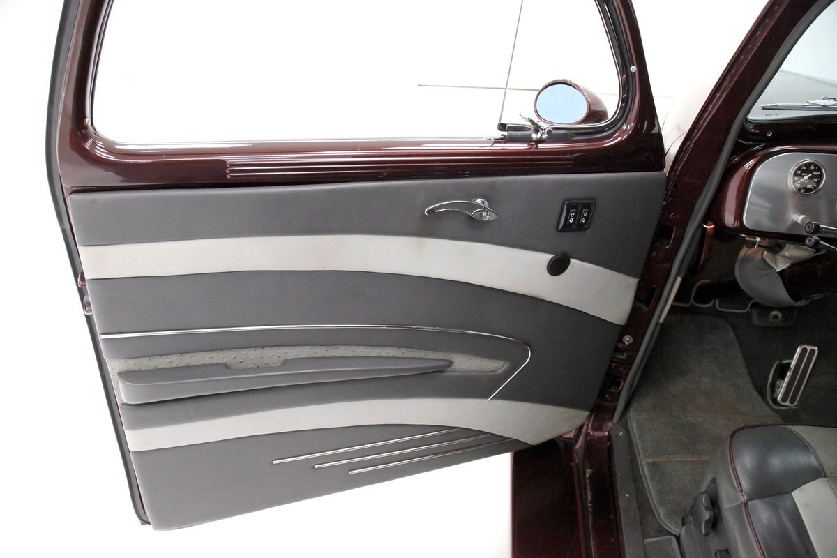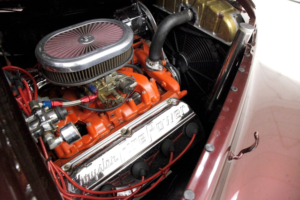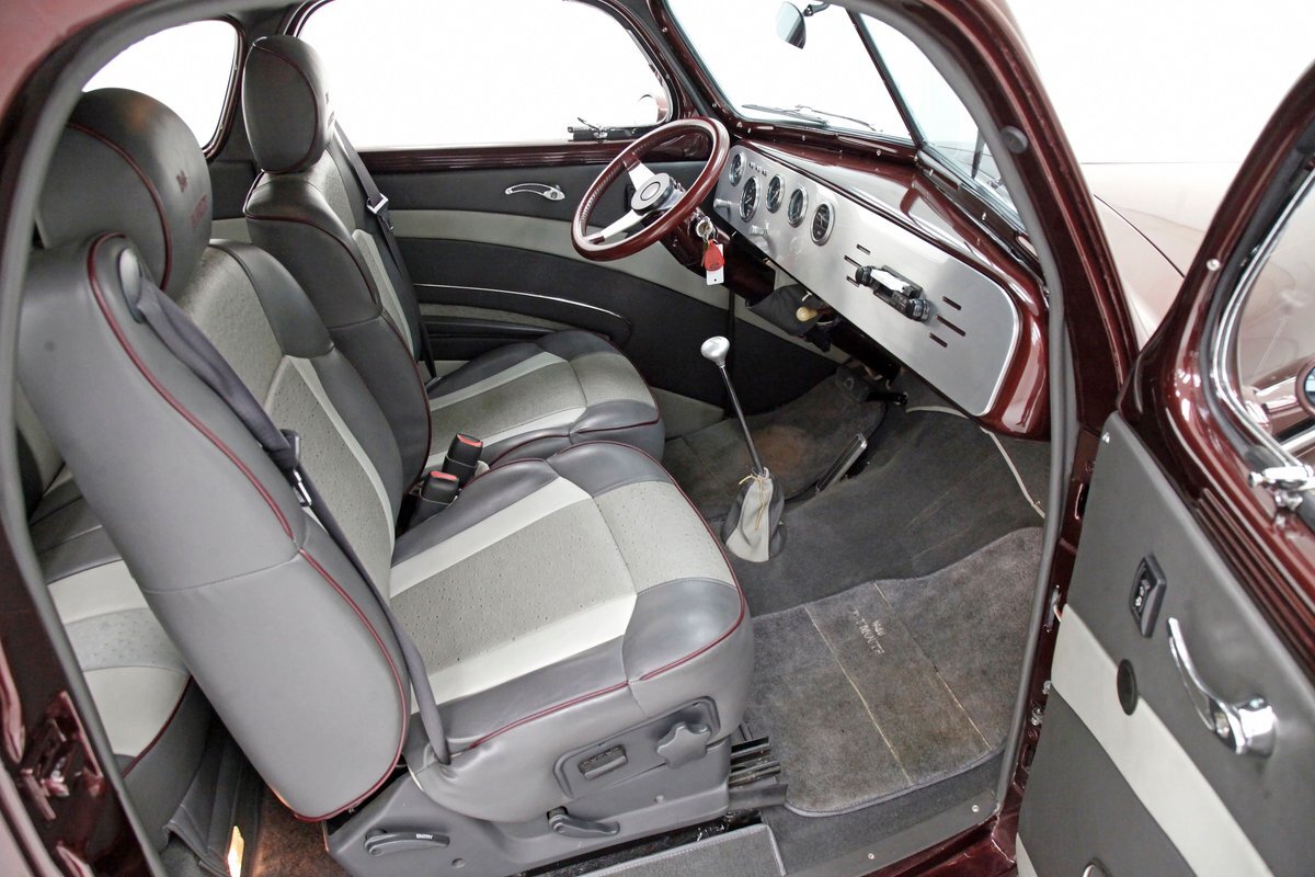Deep inset frenched headlights are the front end highlight and these are on either corner of a very curvaceous front grille. The grille has a vertical trimming that rises gracefully to the top of the bodacious bulbous hood. At its front round over point, a horizontal trimming begins its journey along the side of the hood and eventually runs the length of the car at the upper door line then on to the rear quarters. The front bumper has been shaved and this actually accentuates the lines with the mix of the chrome trimmings and the deep end of the pool dark candy red, which has been expertly applied. All new reproduction glass has been fitted and the car retains much of its original charm with the english wheel shaped fenders and a small running board. A rounded rear glass begins the long gently curving trunk lid which goes with the rear quarters and makes its way to the rear chrome bumper still on the car. The license plate has been frenched into the lid and some chrome bezeled vertical tail lights are on the curvaceous fenders. Chromed 15-inch American Racing "hurricane" style wheels are wrapped by 195/55R15's on front and beefier 225/75R15's on back for that extra push off the line. Badging and chrome are all just perfectly restored for this Plymouth rod.