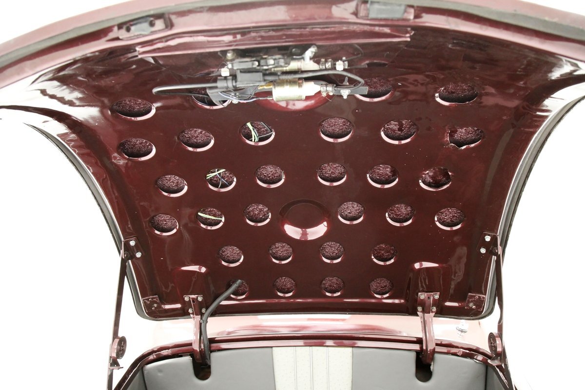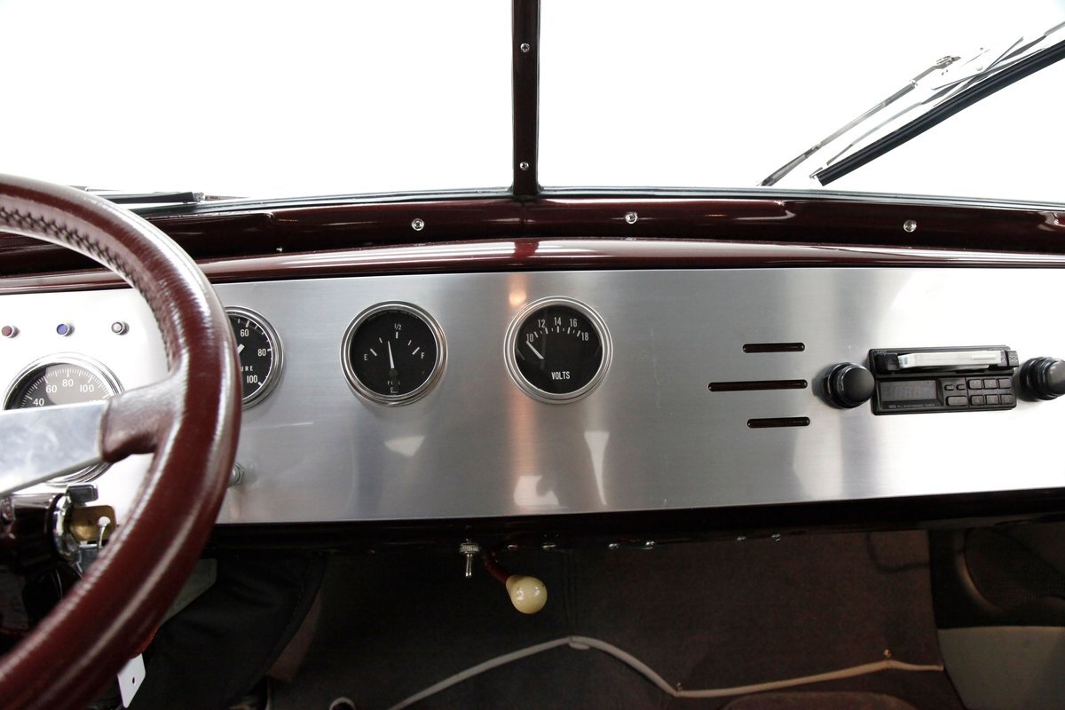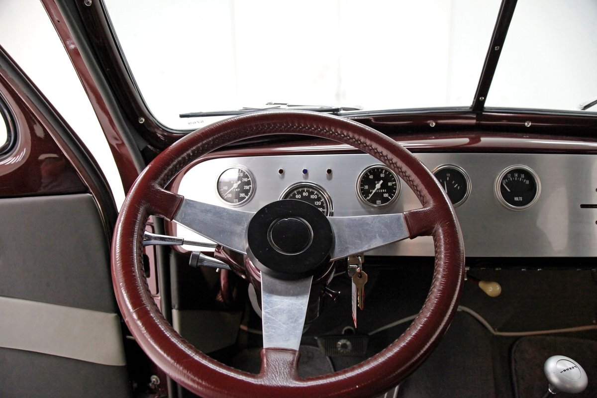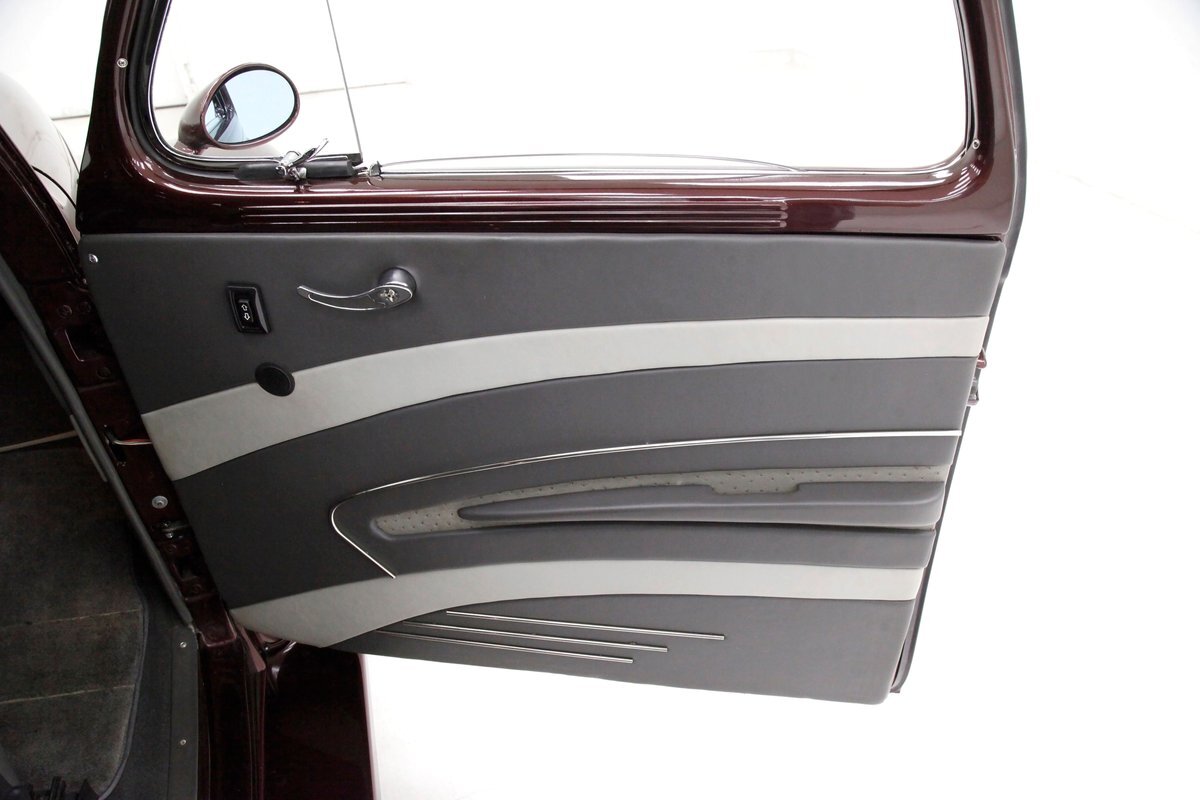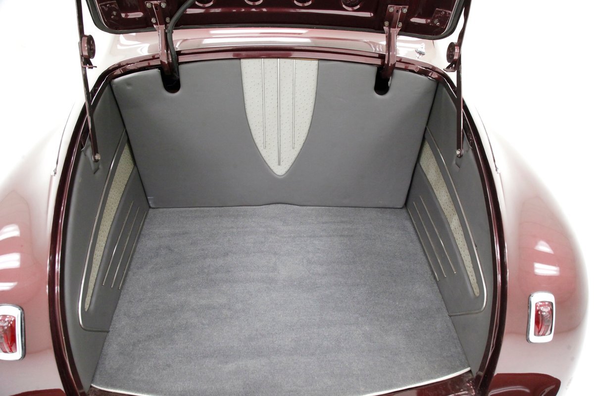 Deep inset frenched headlights are the front end highlight and these are on either corner of a very curvaceous front grille. The grille has a vertical trimming that rises gracefully to the top of the bodacious bulbous hood. At its front round over point, a horizontal trimming begins its journey along the side of the hood and eventually runs the length of the car at the upper door line then on to the rear quarters. The front bumper has been shaved and this actually accentuates the lines with the mix of the chrome trimmings and the deep end of the pool dark candy red, which has been expertly applied. All new reproduction glass has been fitted and the car retains much of its original charm with the english wheel shaped fenders and a small running board. A rounded rear glass begins the long gently curving trunk lid which goes with the rear quarters and makes its way to the rear chrome bumper still on the car. The license plate has been frenched into the lid and some chrome bezeled vertical tail lights are on the curvaceous fenders. Chromed 15-inch American Racing "hurricane" style wheels are wrapped by 195/55R15's on front and beefier 225/75R15's on back for that extra push off the line. Badging and chrome are all just perfectly restored for this Plymouth rod.