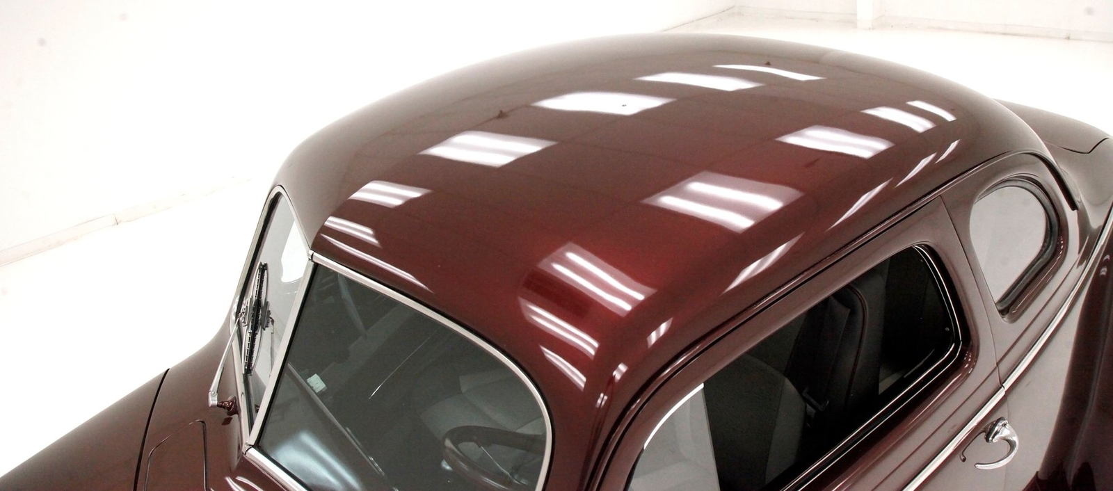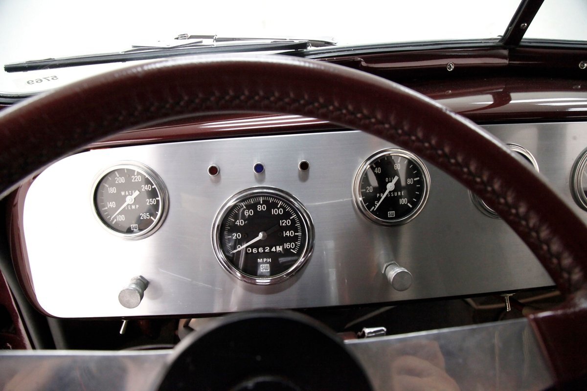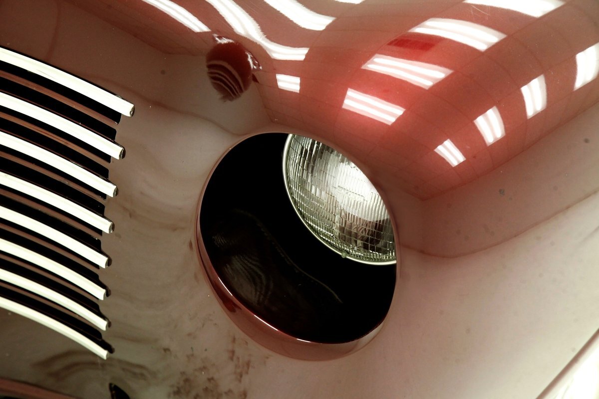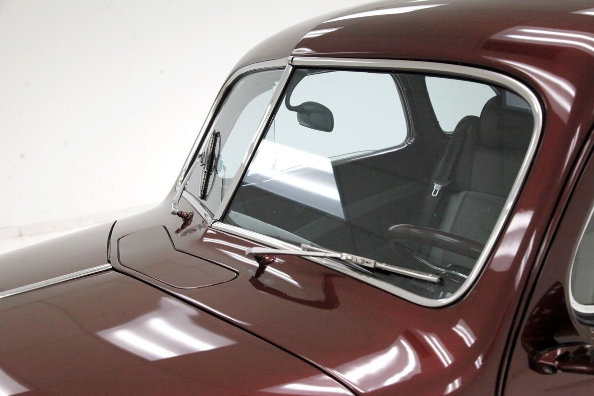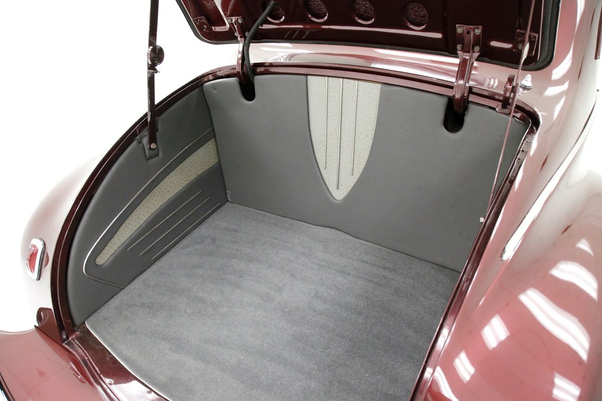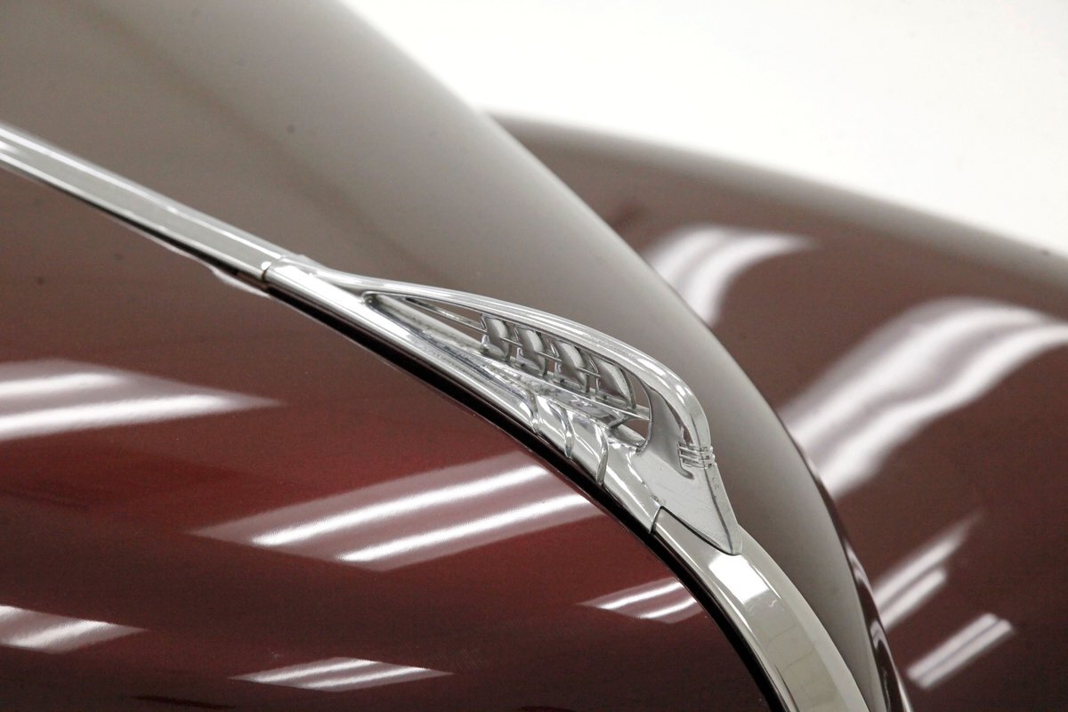Deep inset frenched headlights are the front end highlight and these are on either corner of a very curvaceous front grille. The grille has a vertical trimming that rises gracefully to the top of the bodacious bulbous hood. At its front round over point, a horizontal trimming begins its journey along the side of the hood and eventually runs the length of the car at the upper door line then on to the rear quarters. The front bumper has been shaved and this actually accentuates the lines with the mix of the chrome trimmings and the deep end of the pool dark candy red, which has been expertly applied. All new reproduction glass has been fitted and the car retains much of its original charm with the english wheel shaped fenders and a small running board. A rounded rear glass begins the long gently curving trunk lid which goes with the rear quarters and makes its way to the rear chrome bumper still on the car. The license plate has been frenched into the lid and some chrome bezeled vertical tail lights are on the curvaceous fenders. Chromed 15-inch American Racing "hurricane" style wheels are wrapped by 195/55R15's on front and beefier 225/75R15's on back for that extra push off the line. Badging and chrome are all just perfectly restored for this Plymouth rod.