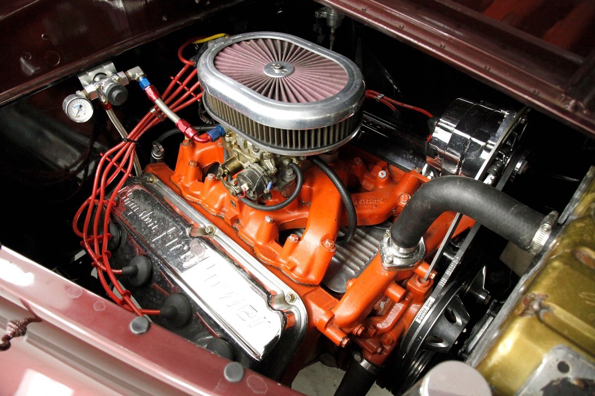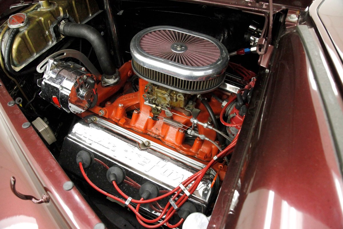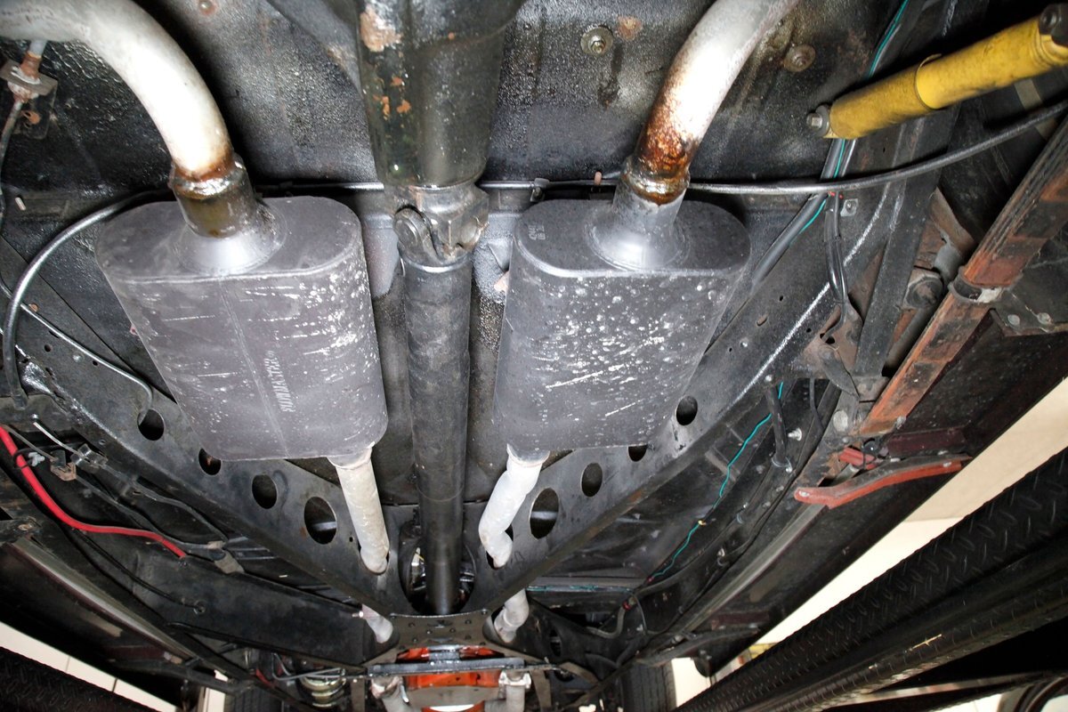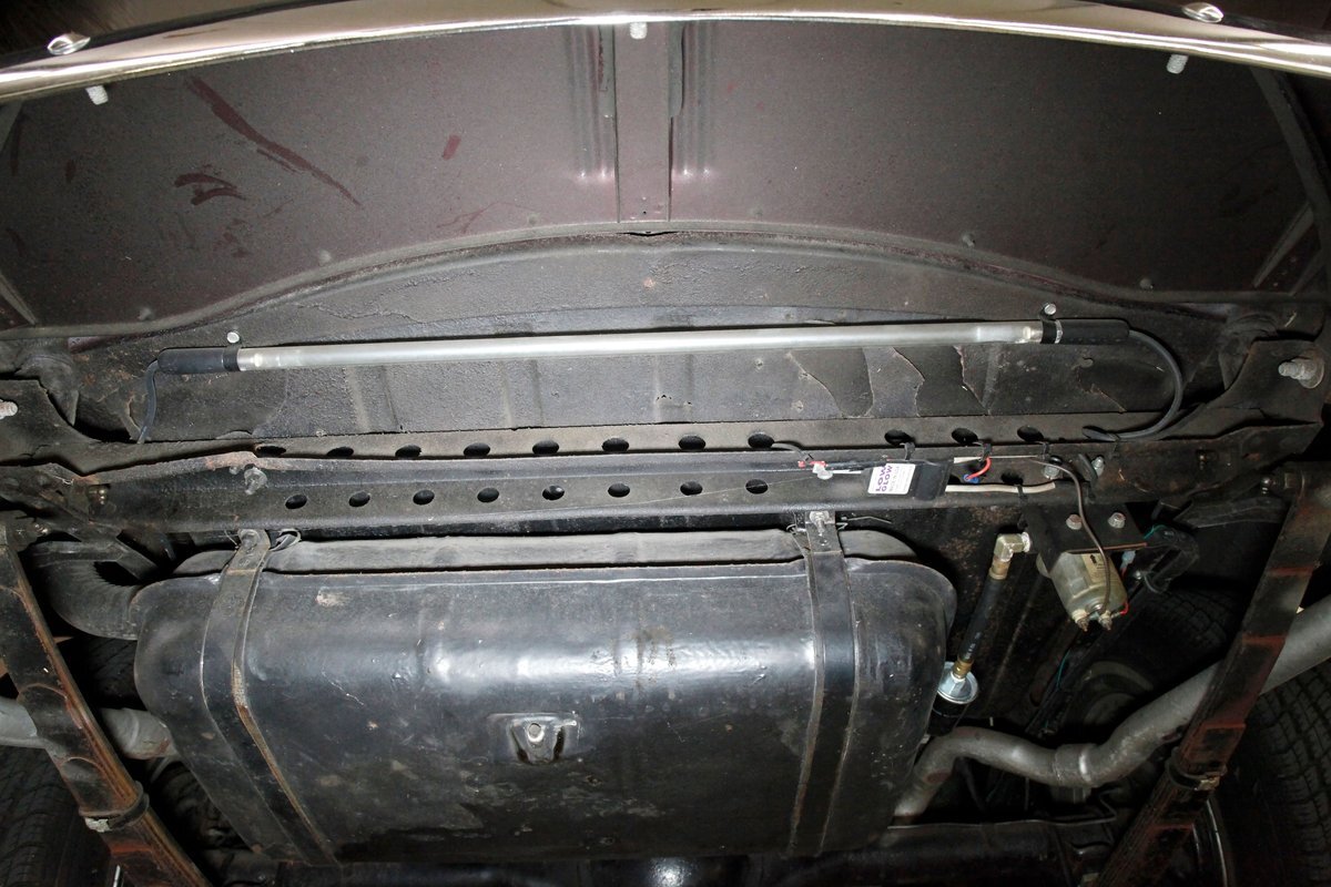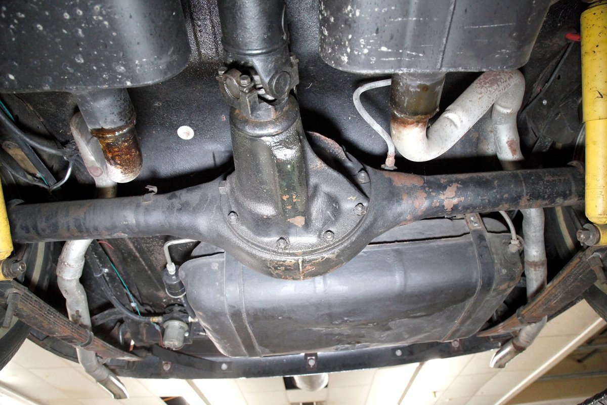 As expected the undercarriage has a slight patina look, minimal surface rust on the leaf springs and has been totally undercoated. Solid steel X framing is looking great and new lines snake throughout. The bottom end of engine is clean and drip free. Independent front suspension is on in front and leaf springs are on back. Power disc braking goes with the independent front and power discs are on back to bring this rodder to a stop.