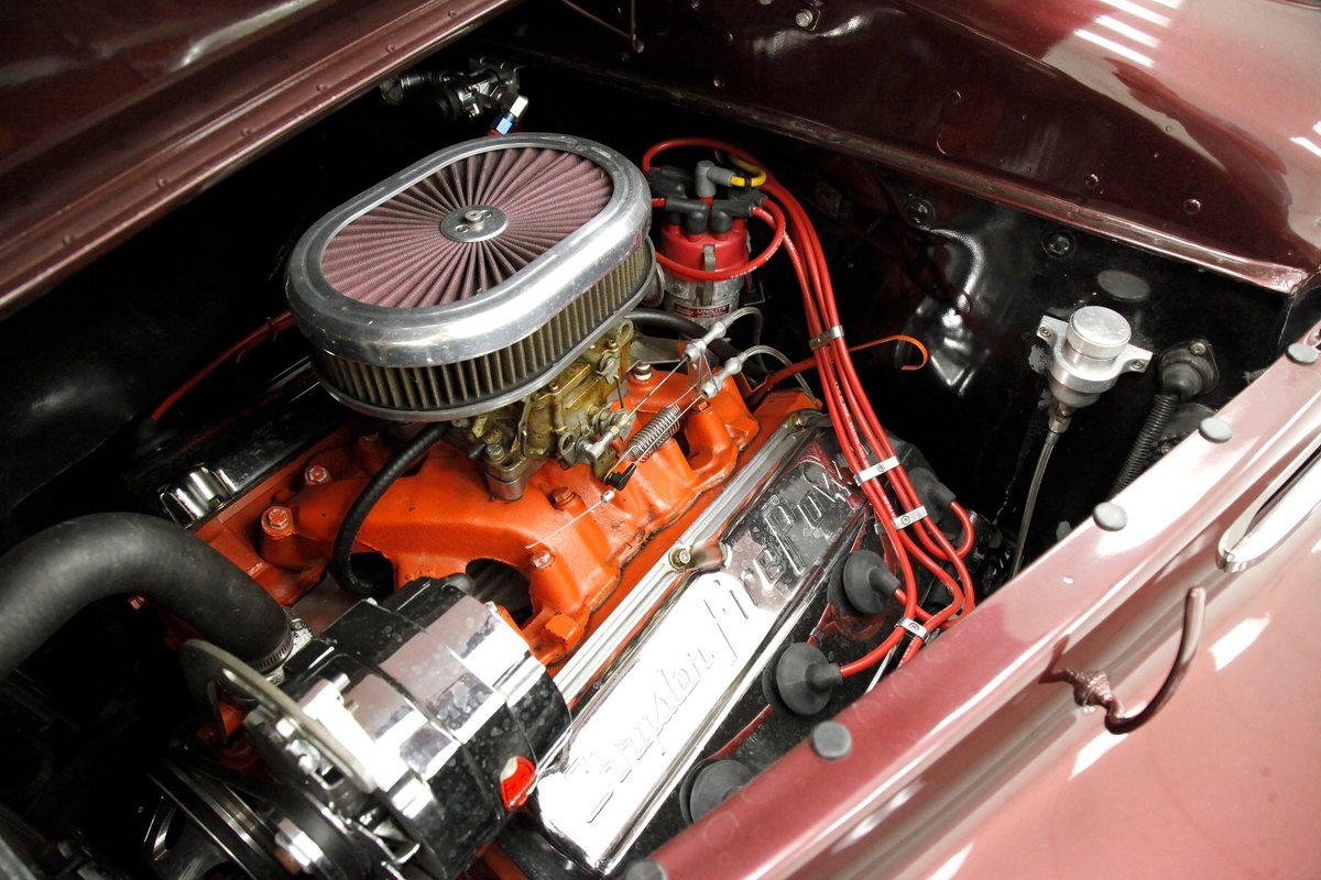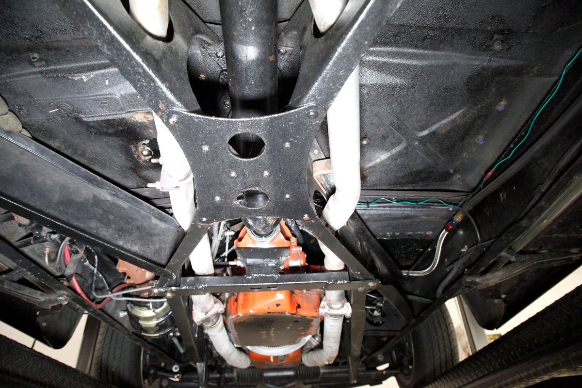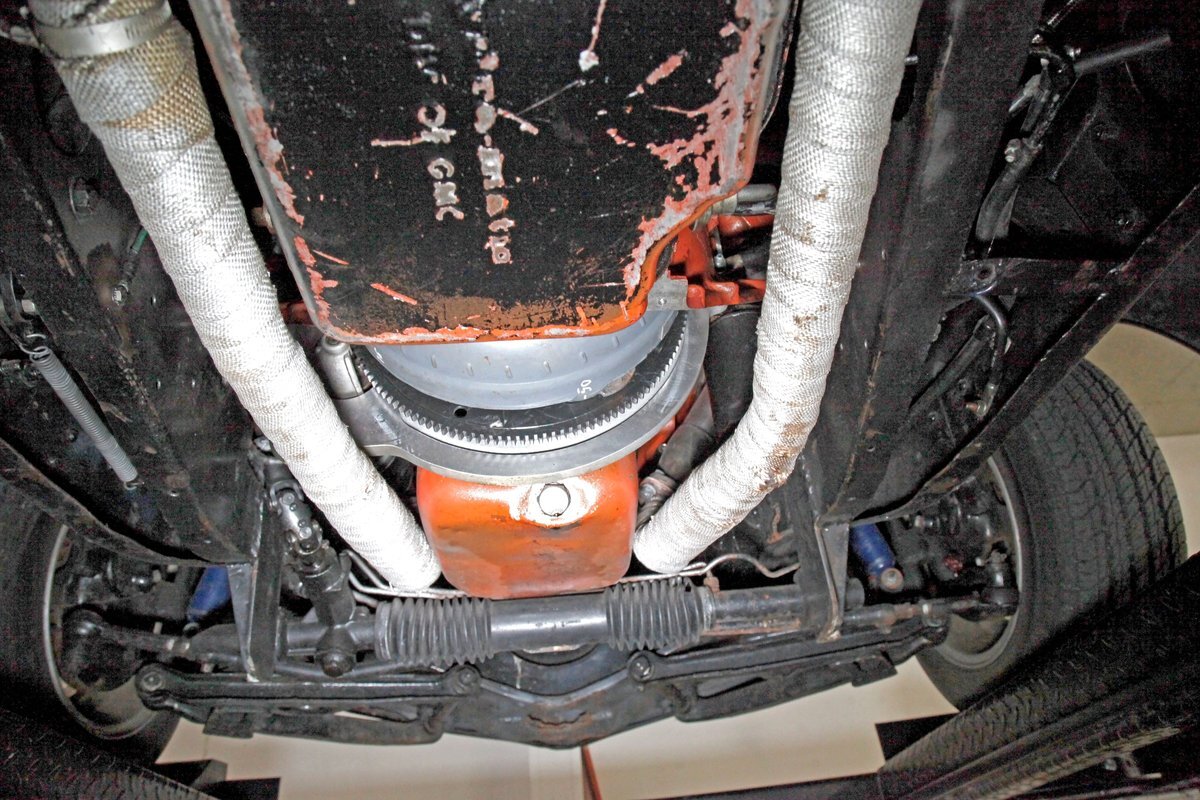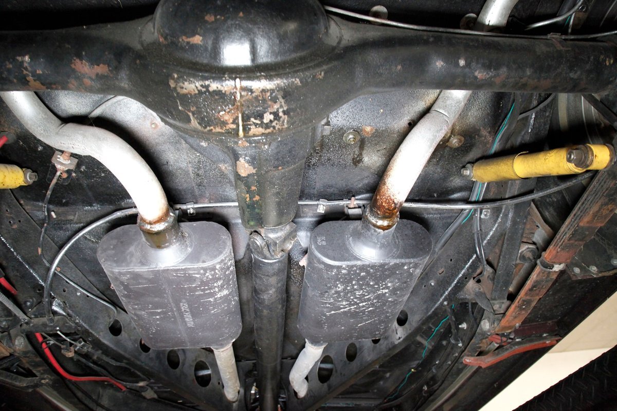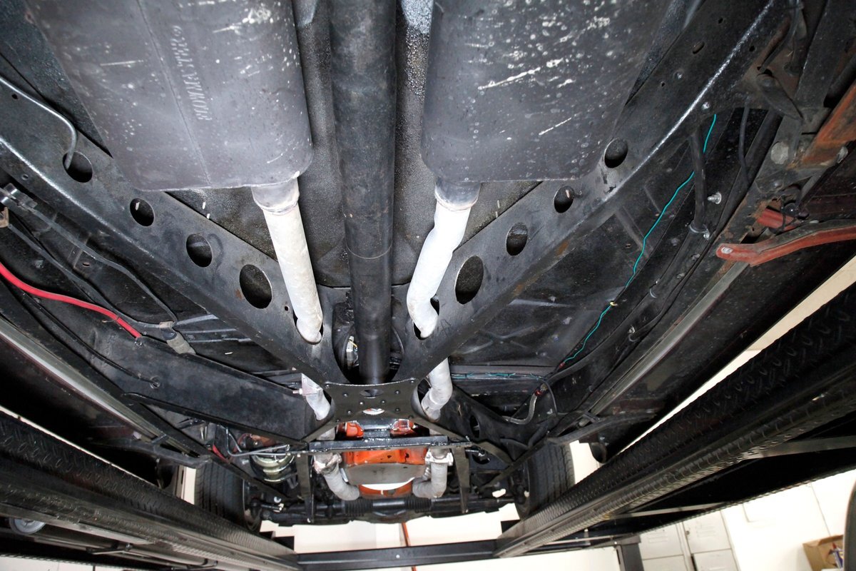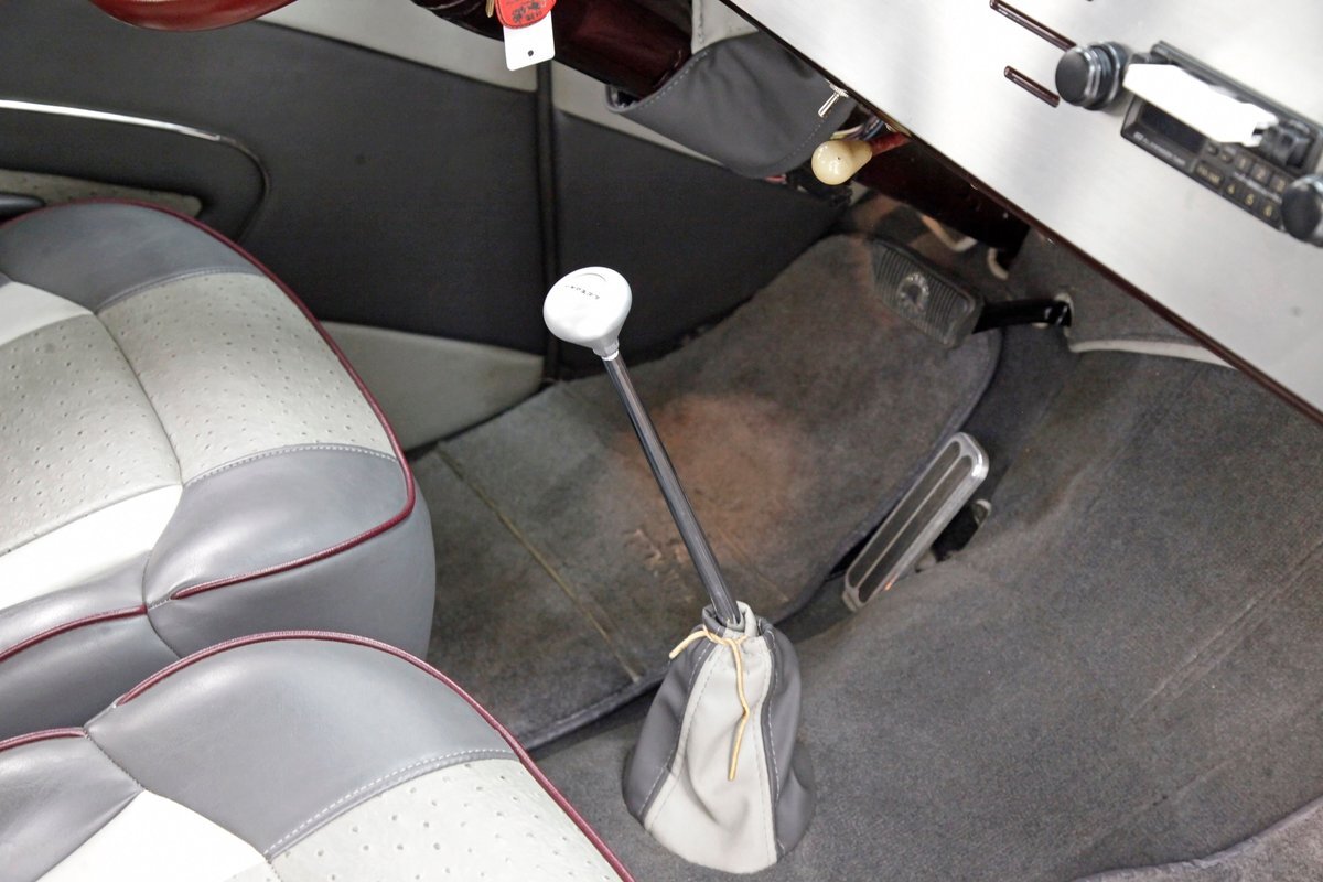 As expected the undercarriage has a slight patina look, minimal surface rust on the leaf springs and has been totally undercoated. Solid steel X framing is looking great and new lines snake throughout. The bottom end of engine is clean and drip free. Independent front suspension is on in front and leaf springs are on back. Power disc braking goes with the independent front and power discs are on back to bring this rodder to a stop.