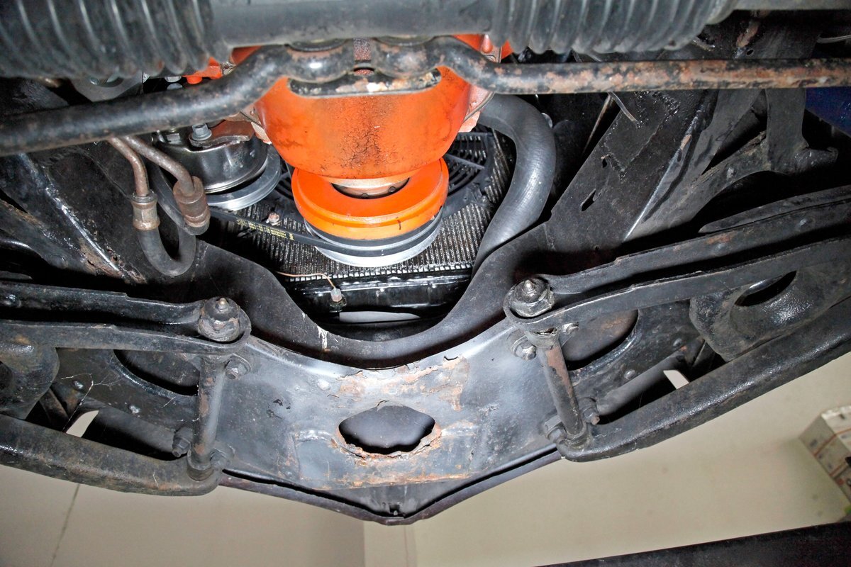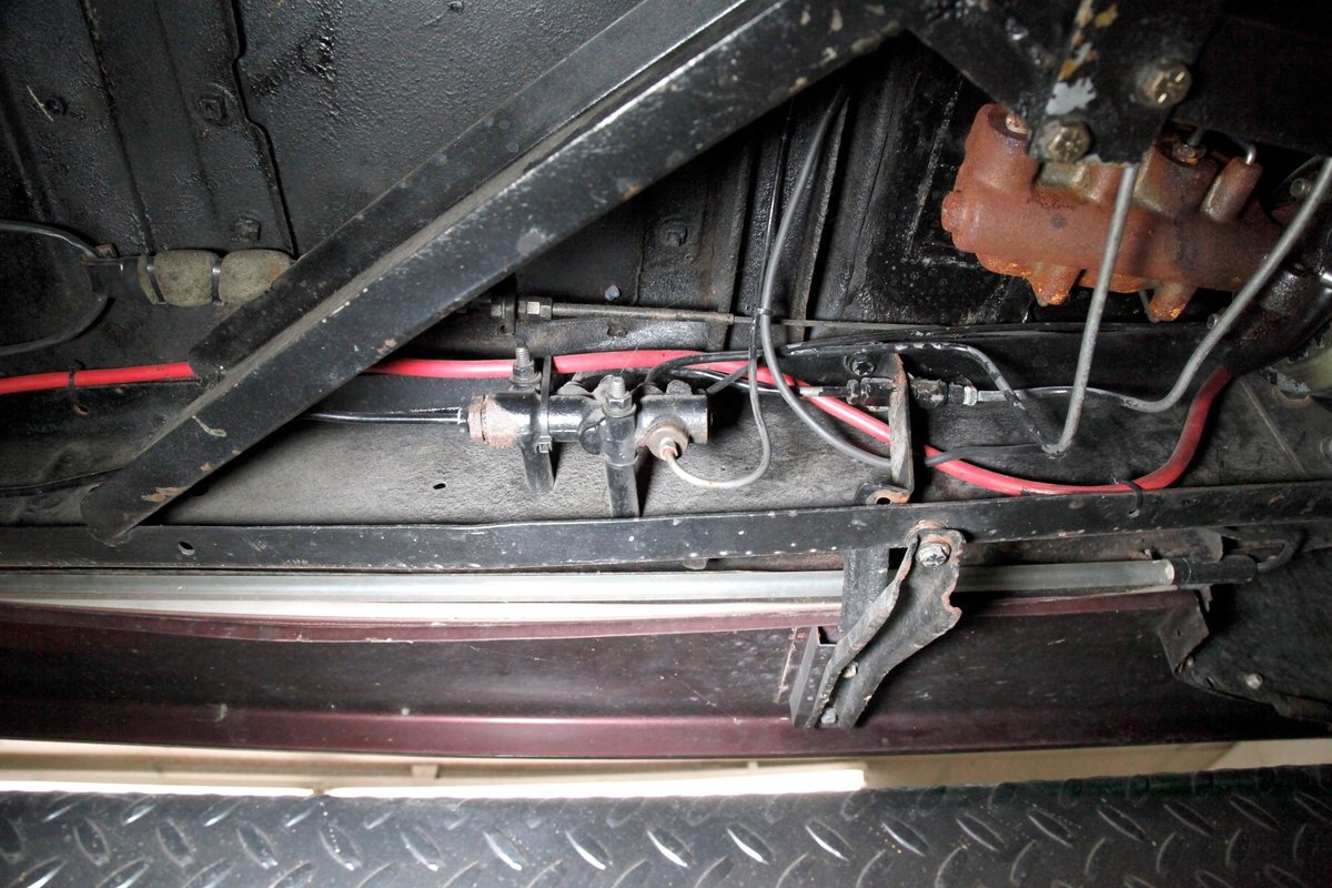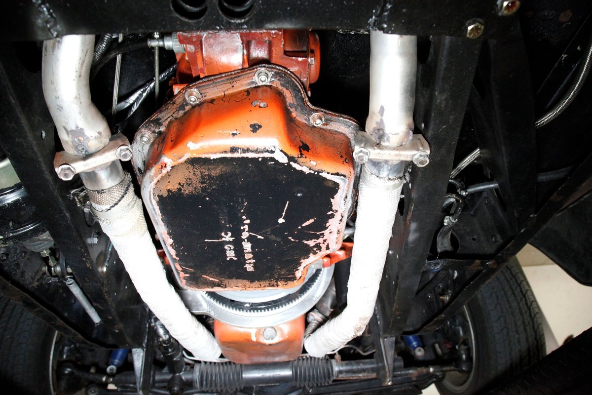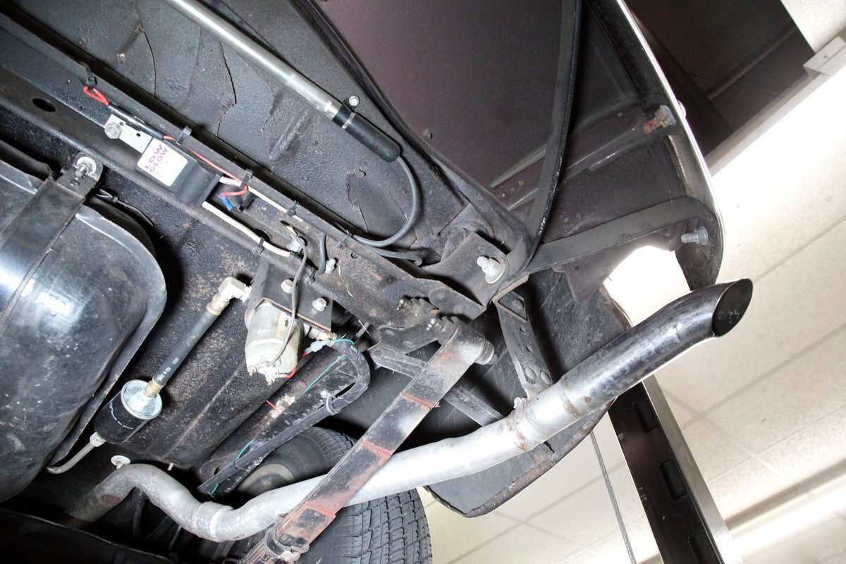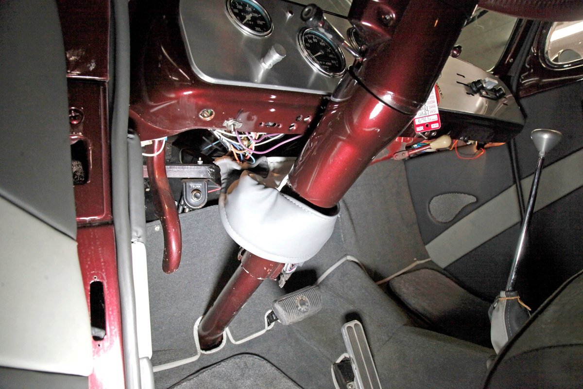 As expected the undercarriage has a slight patina look, minimal surface rust on the leaf springs and has been totally undercoated. Solid steel X framing is looking great and new lines snake throughout. The bottom end of engine is clean and drip free. Independent front suspension is on in front and leaf springs are on back. Power disc braking goes with the independent front and power discs are on back to bring this rodder to a stop.