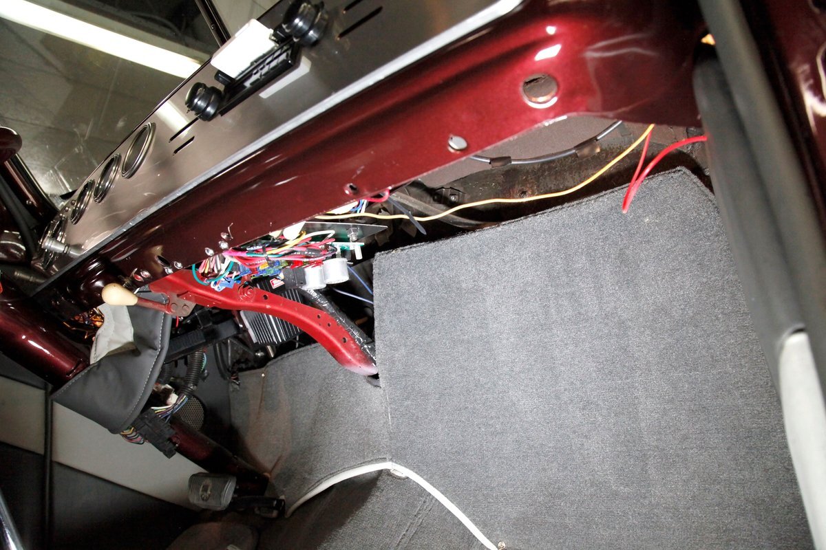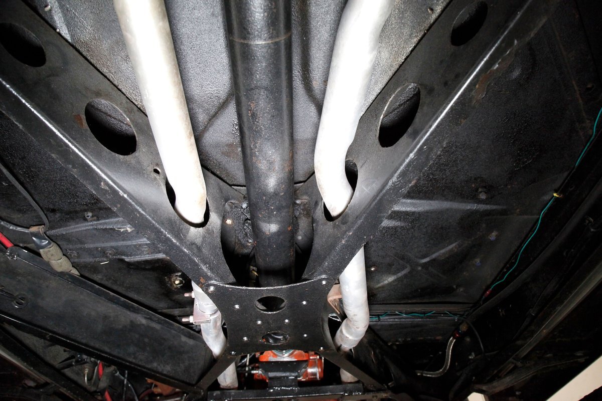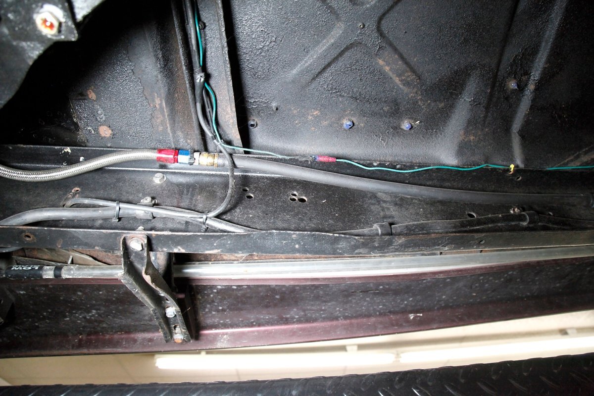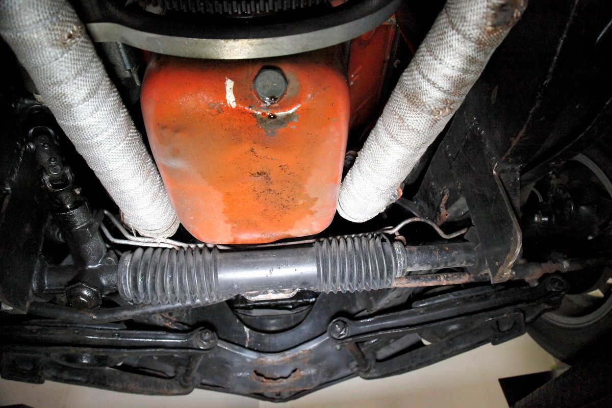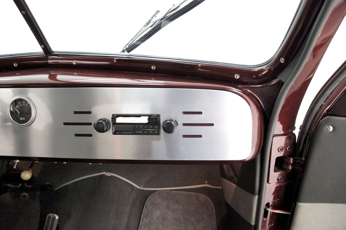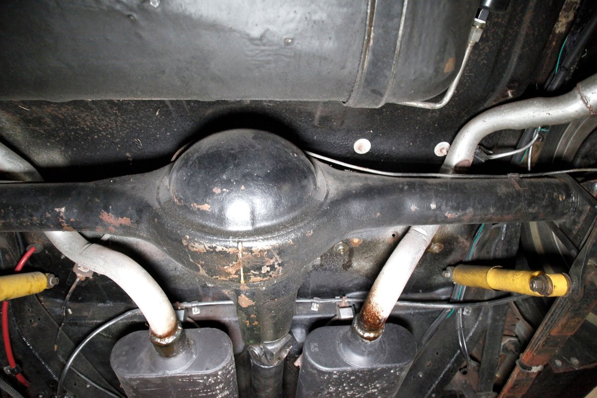 As expected the undercarriage has a slight patina look, minimal surface rust on the leaf springs and has been totally undercoated. Solid steel X framing is looking great and new lines snake throughout. The bottom end of engine is clean and drip free. Independent front suspension is on in front and leaf springs are on back. Power disc braking goes with the independent front and power discs are on back to bring this rodder to a stop.