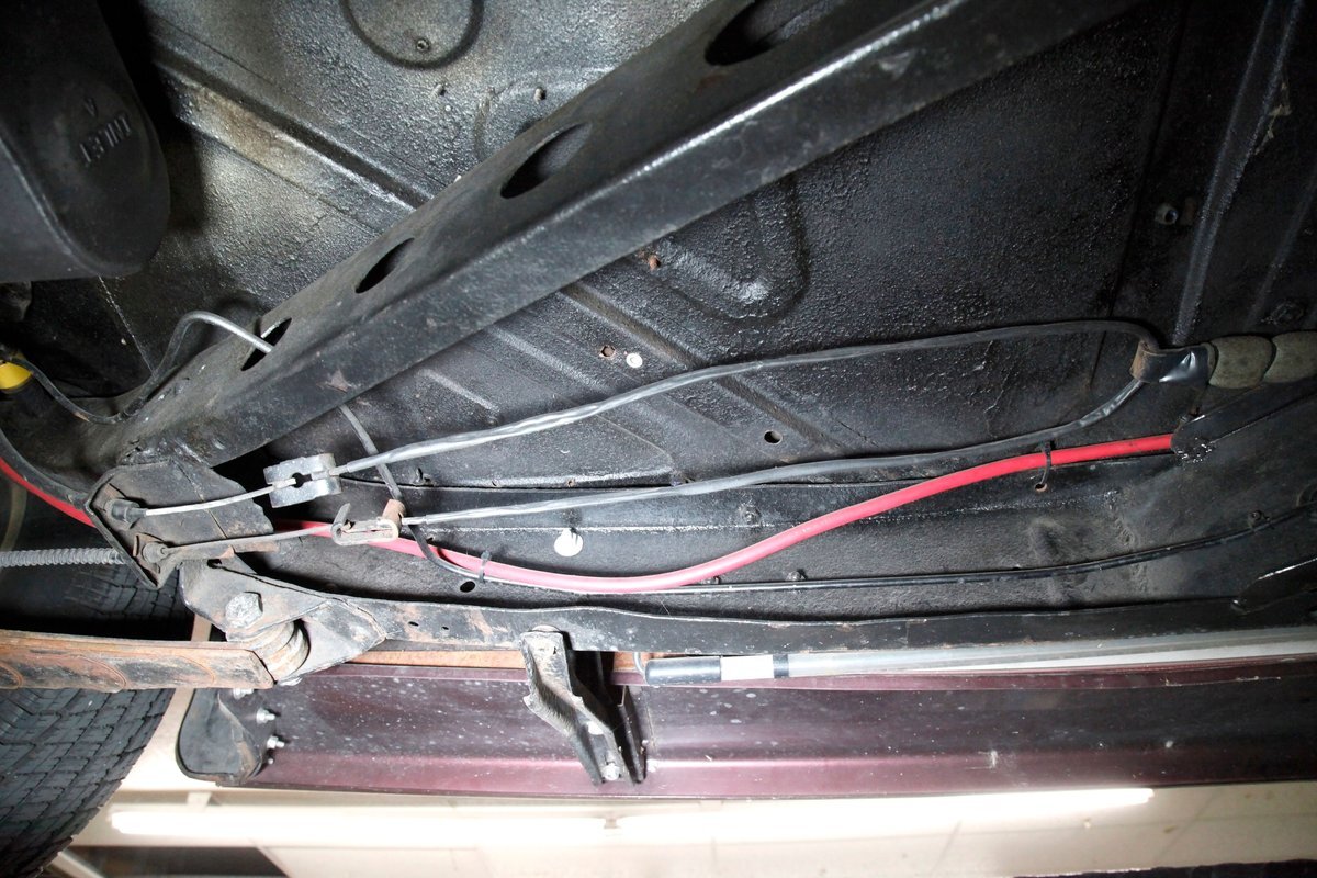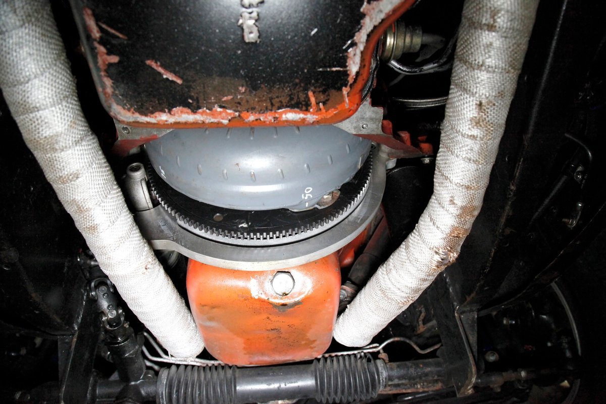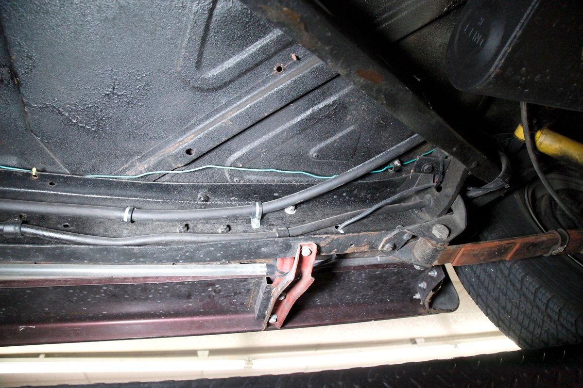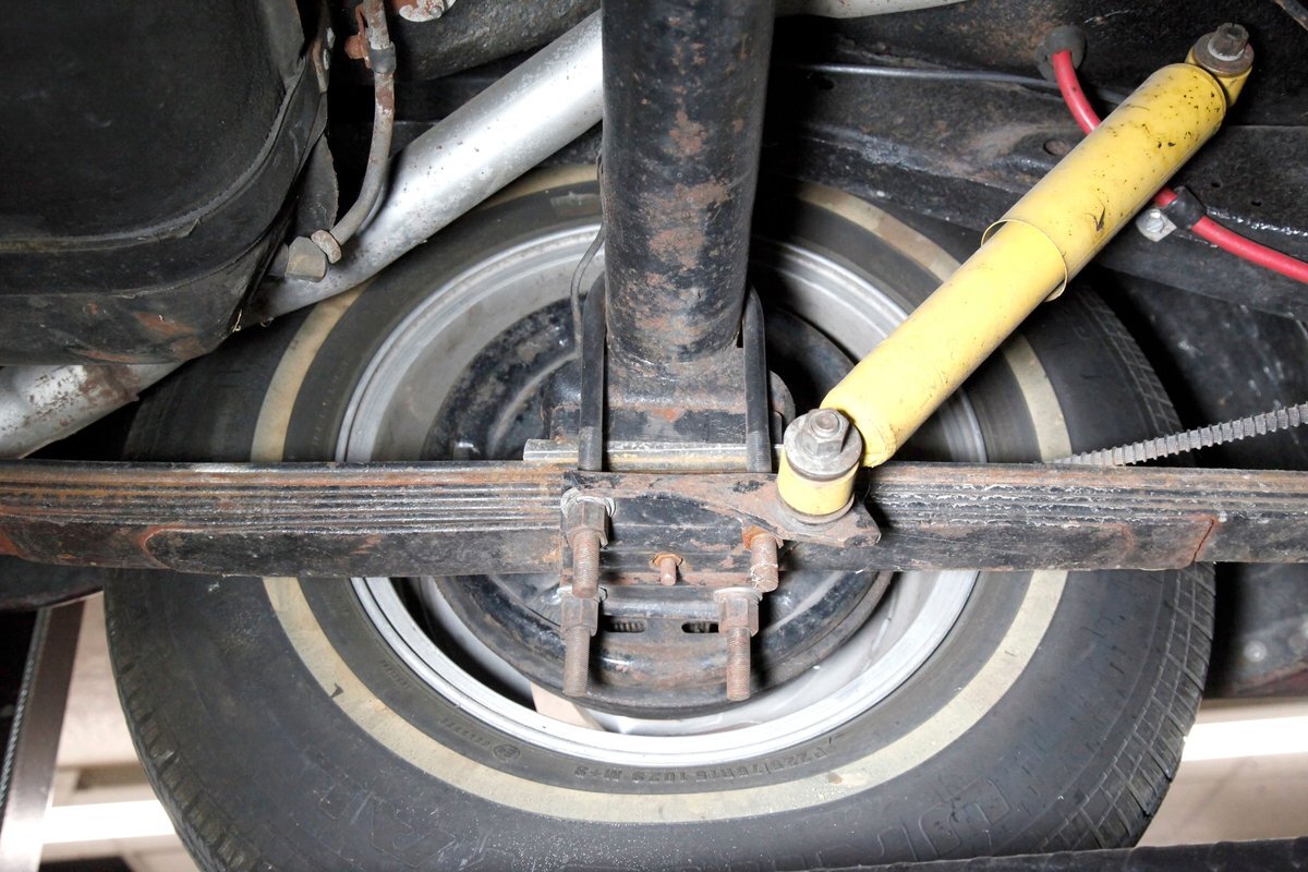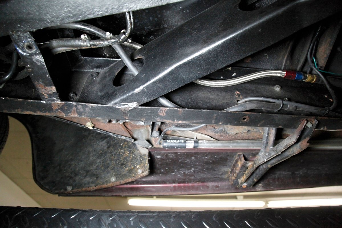 As expected the undercarriage has a slight patina look, minimal surface rust on the leaf springs and has been totally undercoated. Solid steel X framing is looking great and new lines snake throughout. The bottom end of engine is clean and drip free. Independent front suspension is on in front and leaf springs are on back. Power disc braking goes with the independent front and power discs are on back to bring this rodder to a stop.