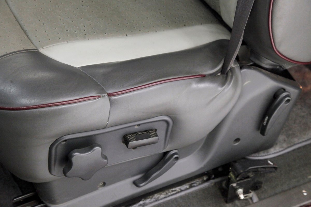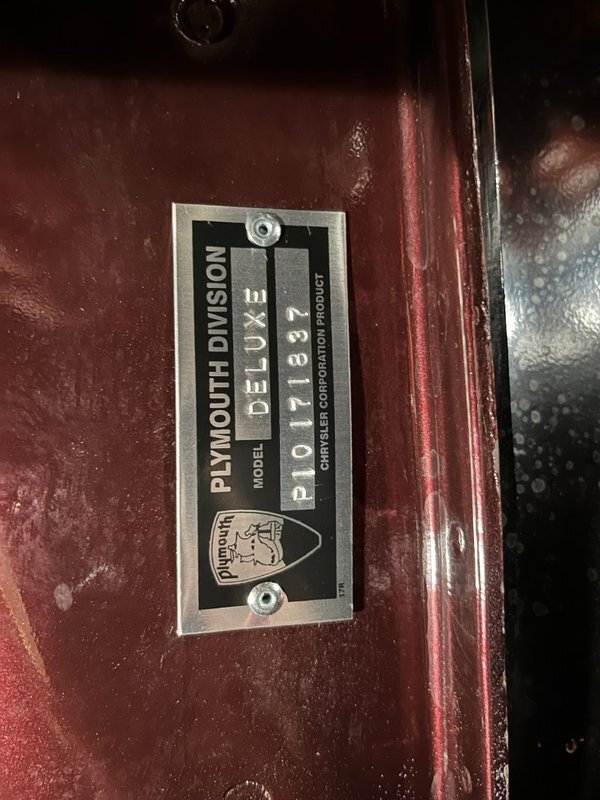 A swing of the well gapped doors reveals an all new updated interior. It uses a mix of tasteful steel gray and white leather and these panels for a small swoop pattern on the doors. A bit of broadcloth also peppers the area within the armrest. The car has power windows and a nice chromed curved actuator. Throw in some curved chrome trimming and we have excellence! Looking inside we now have late model high back tri tone leather power buckets. These have gray leather bolsters with white edges and an ostrich pattern light gray broadcloth insert. The edging has burgundy piping for added interest. Also burgundy PLYMOUTH embroidery is on the head rests. An equally impressive rear bench in the same pattern is stuffed in the back. The modernization continues with a deep candy red tilt steering column topped by a maroon leather wrapped three spoke billet styled rally wheel. The original dash has been covered over with a stainless steel panel and within a few black faced and white letter SW gauges reside along with some billet style pulls. A modern AM/FM/Cassette player resides in front of the passenger. A long stem Lokar shifter rises to the driver's hand and this sits in a sea of nice gray thick pile carpeting. Above is a gray felted headliner and this sports a custom ribbed center panel with the dome light inserted within. A shout out for the trunk which is not to be outdone by the interior which has gray carpeting, gray leather sides, ostrich broadcloth for some side inserts, more thin chrome trimming and hint of white leather in the back of the trunk. Wow factor times 10!