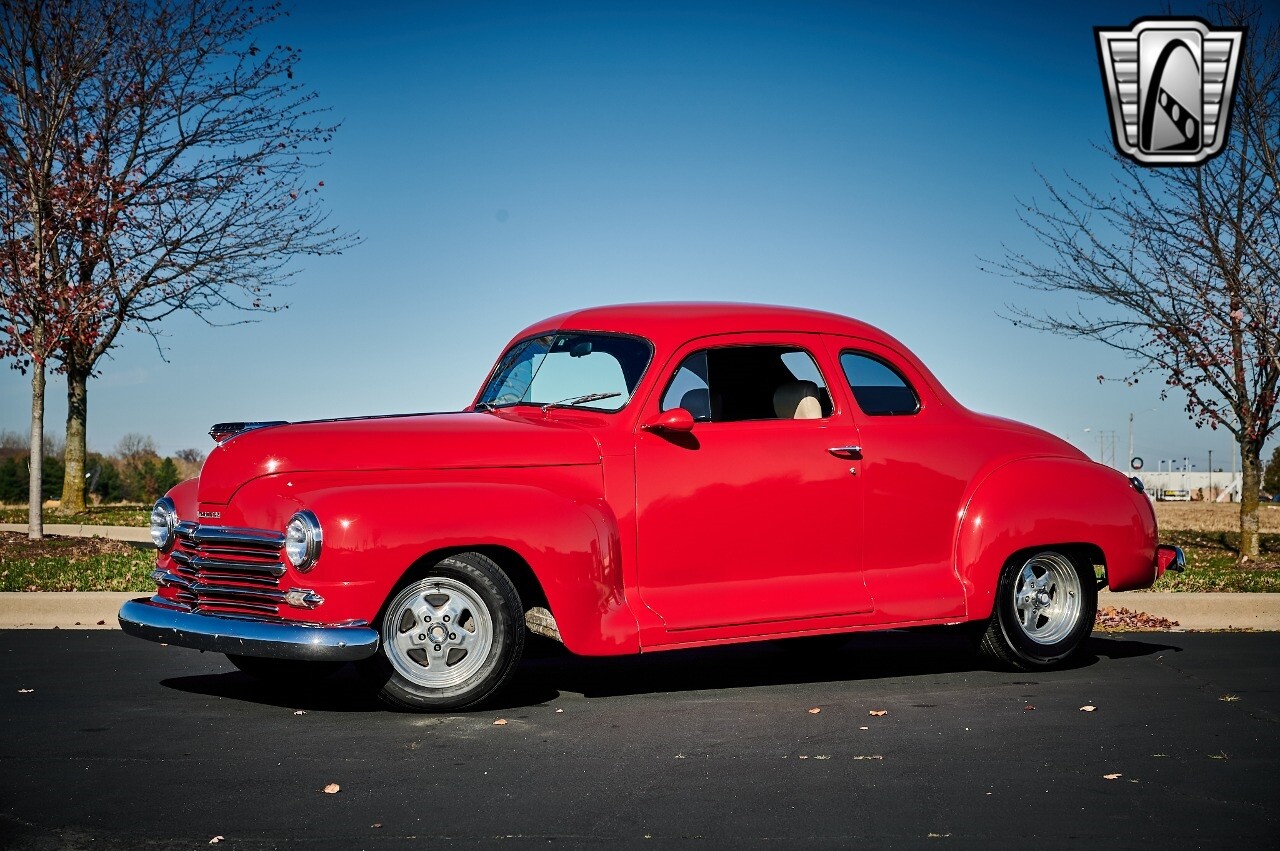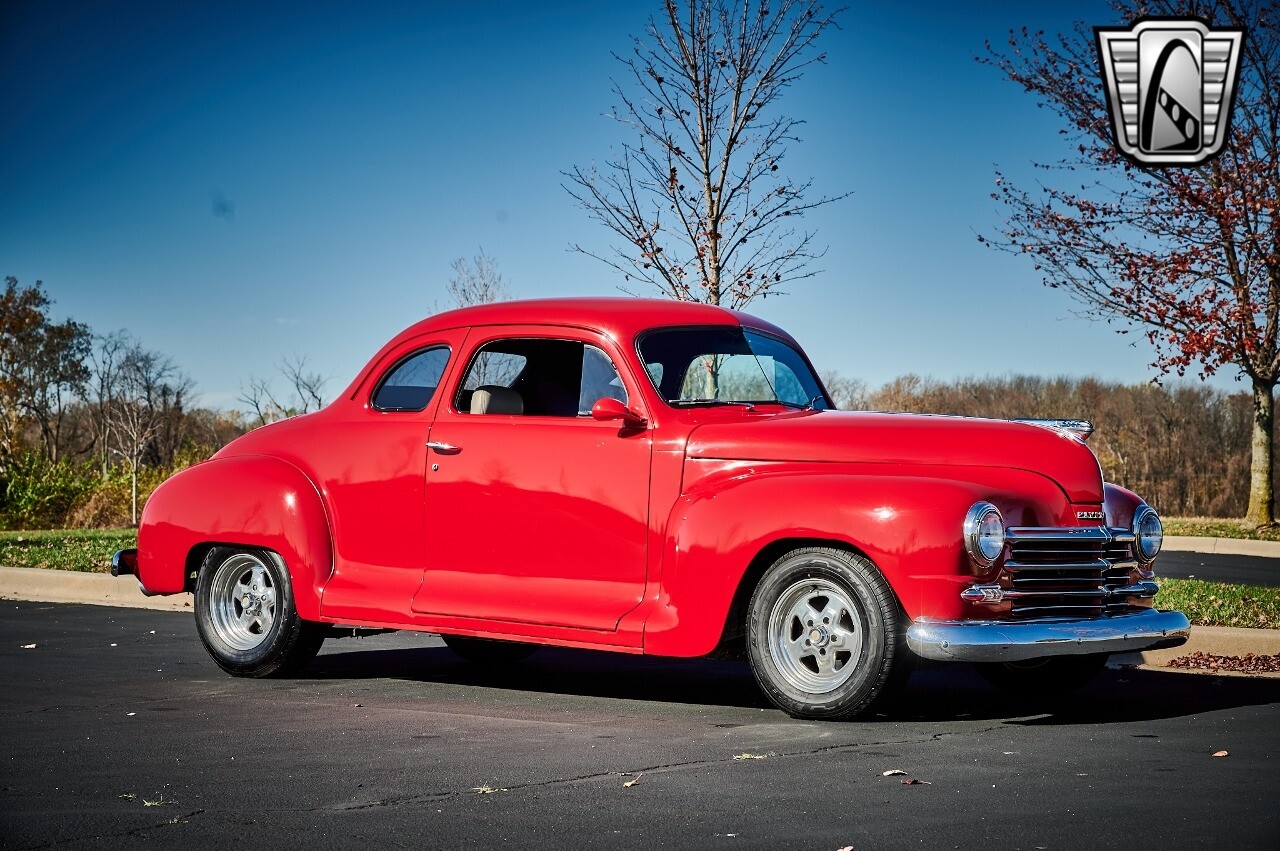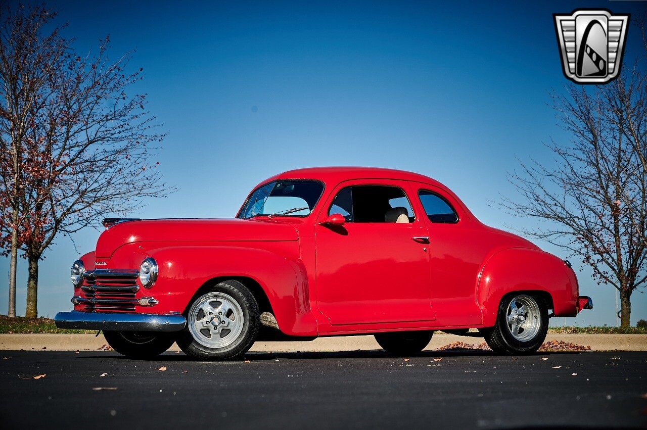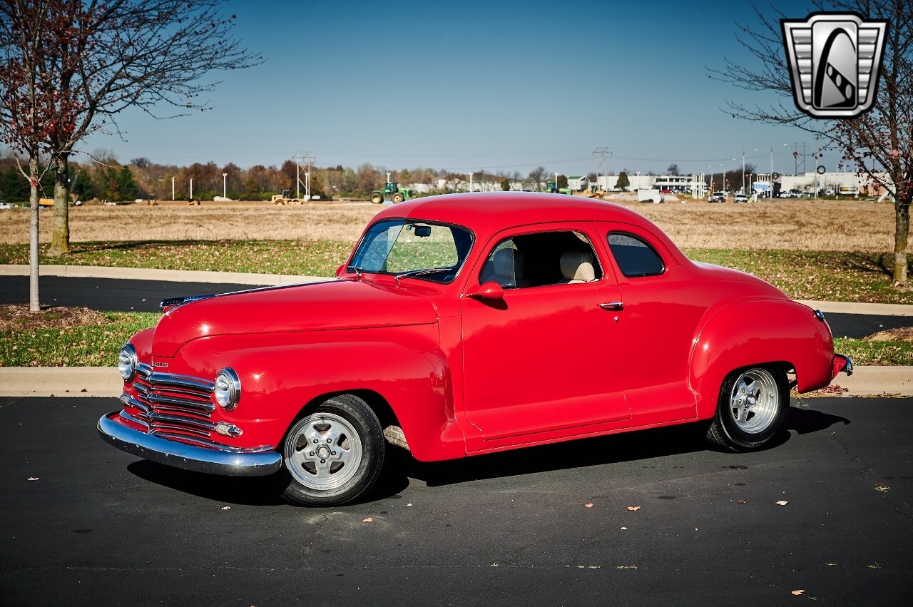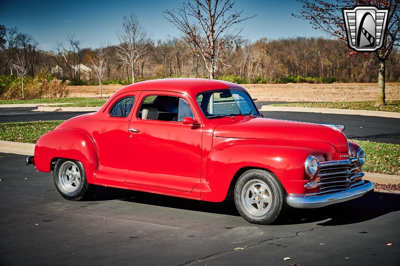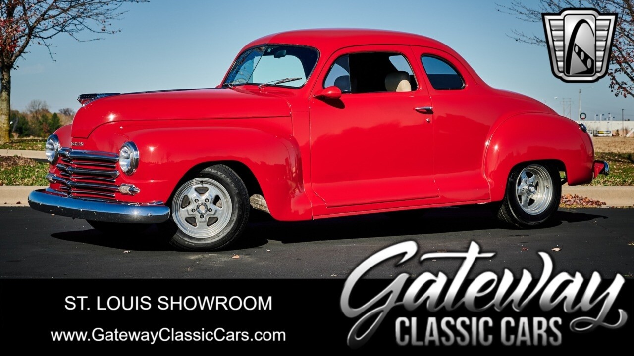 Gateway Classic Cars of STL is excited to list this 1948 Plymouth Super Deluxe coupe. This Victory Red 2 door beauty has a 318 CID V-8 Dodge engine paired up to an automatic transmission. This car has had a Nova subframe installed to modernize the front suspension system along with front power disc brakes. For added comfort & convenience, it has power steering, cruise control, LeCarra Steering wheel, tilt steering wheel & has had aftermarket air conditioning installed. The power tan door panels, floor mats and bucket seats with seat belts, compliment the blue carpet, dash & metal work inside. The below eye line dual outside mirrors add to its sleek look. This machine has staggered 15 inch alloy wheels wrapped in steel belted radial tires front & rear. According to the owner, this car has had air shocks installed on the rear of the car. The dash is complimented with functional Auto Meter gauges, indicator light for turn signals & a functioning nostalgic AM/FM Cassette player. The exhaust system has dual chrome tips both exiting the passenger side rear of the car. [ omitted ]. [ omitted ]. The St Louis showroom is located at 1237 Central Park Drive, O'Fallon Illinois 62269.