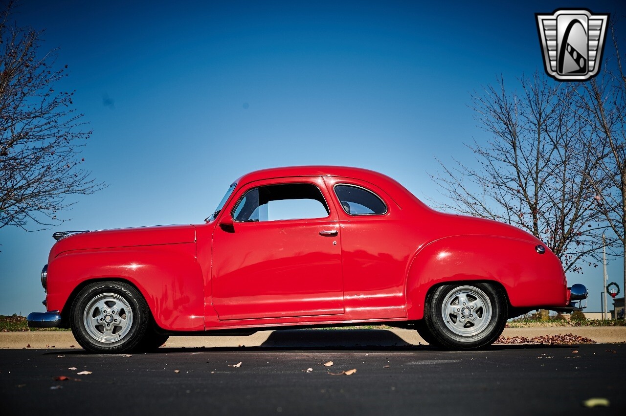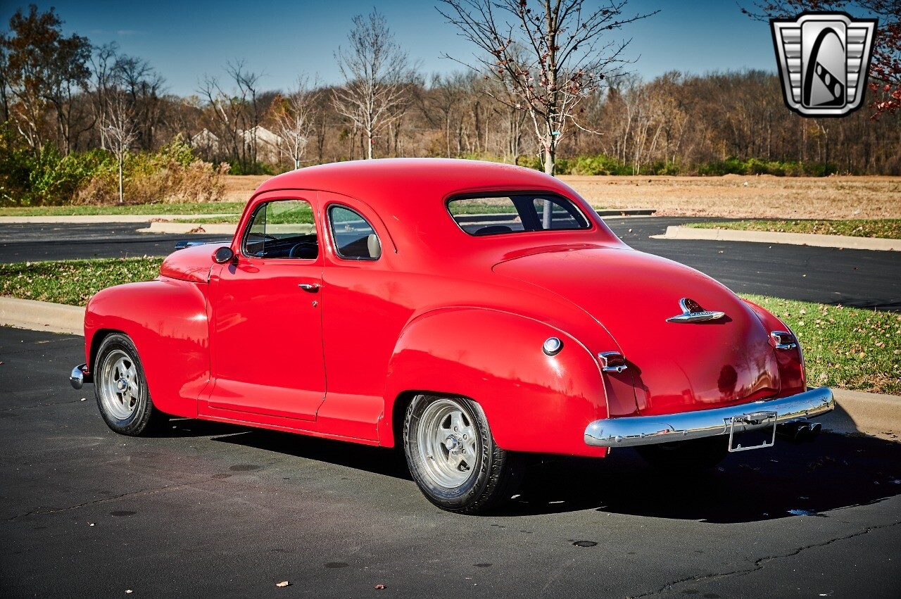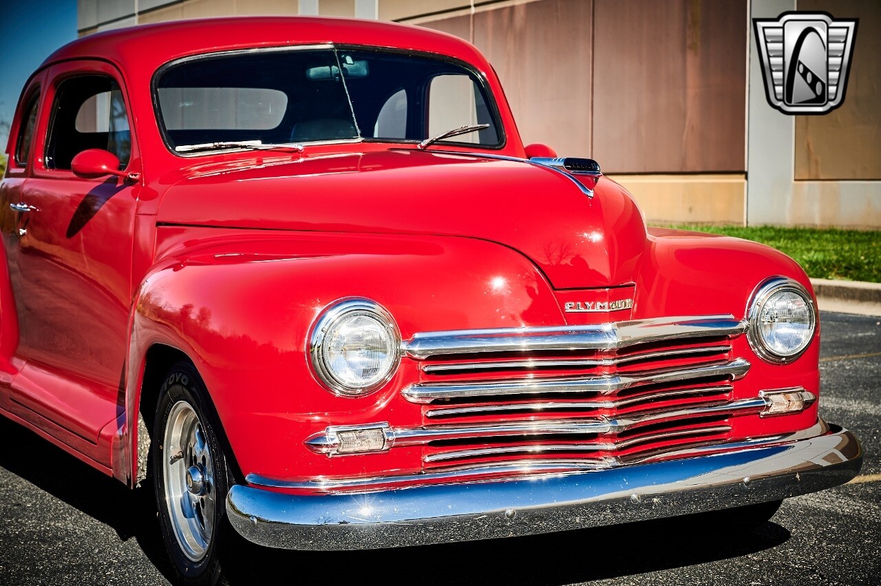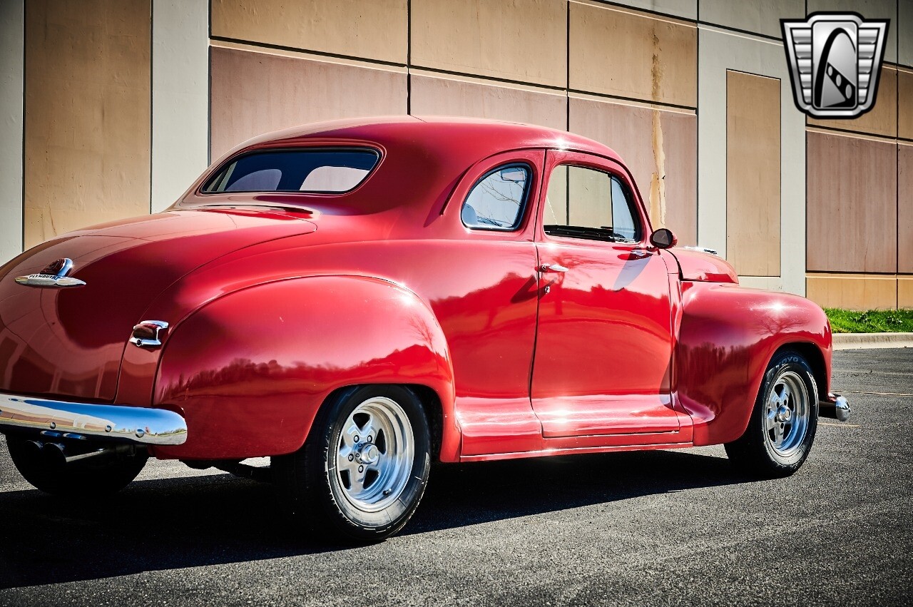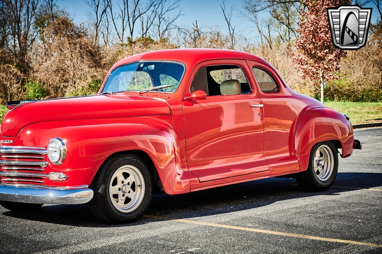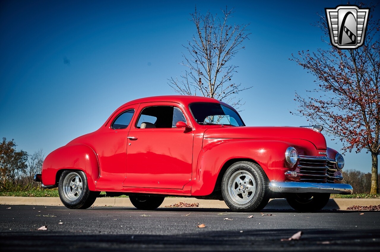 Gateway Classic Cars of STL is excited to list this 1948 Plymouth Super Deluxe coupe. This Victory Red 2 door beauty has a 318 CID V-8 Dodge engine paired up to an automatic transmission. This car has had a Nova subframe installed to modernize the front suspension system along with front power disc brakes. For added comfort & convenience, it has power steering, cruise control, LeCarra Steering wheel, tilt steering wheel & has had aftermarket air conditioning installed. The power tan door panels, floor mats and bucket seats with seat belts, compliment the blue carpet, dash & metal work inside. The below eye line dual outside mirrors add to its sleek look. This machine has staggered 15 inch alloy wheels wrapped in steel belted radial tires front & rear. According to the owner, this car has had air shocks installed on the rear of the car. The dash is complimented with functional Auto Meter gauges, indicator light for turn signals & a functioning nostalgic AM/FM Cassette player. The exhaust system has dual chrome tips both exiting the passenger side rear of the car. [ omitted ]. [ omitted ]. The St Louis showroom is located at 1237 Central Park Drive, O'Fallon Illinois 62269.