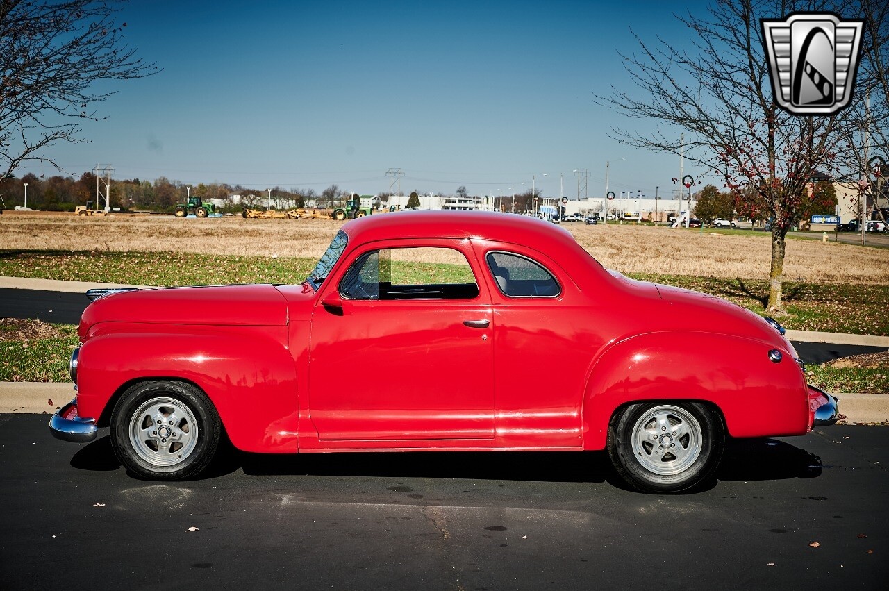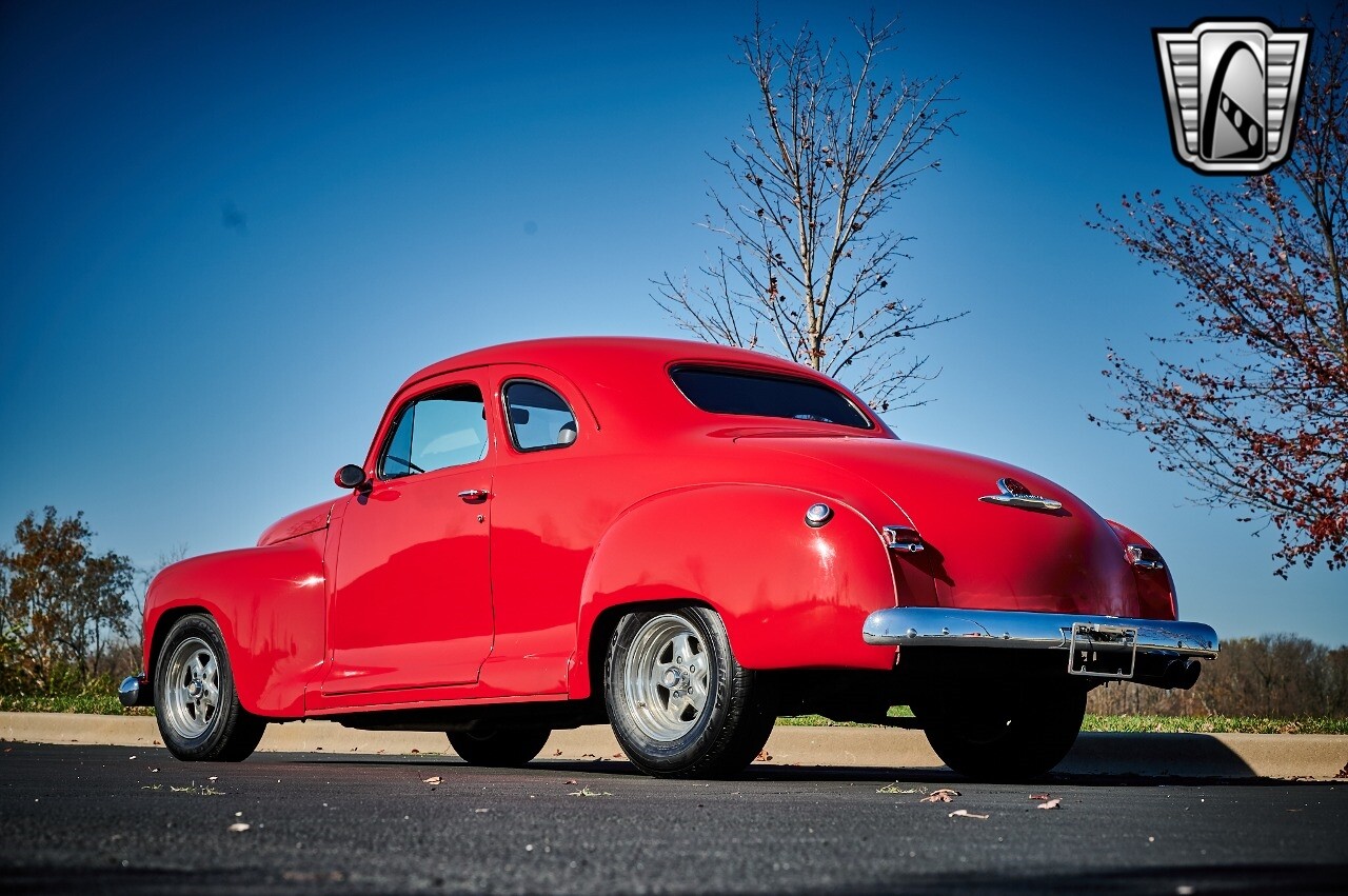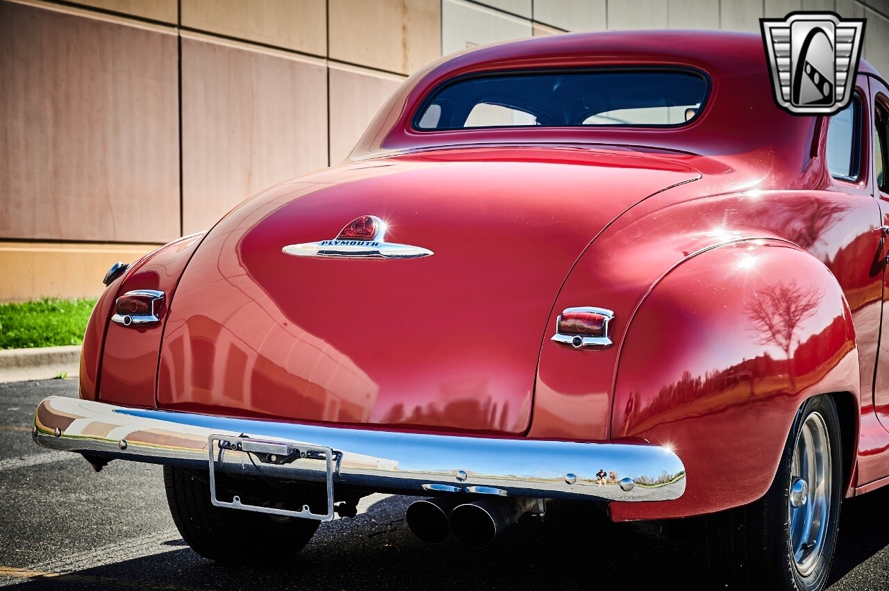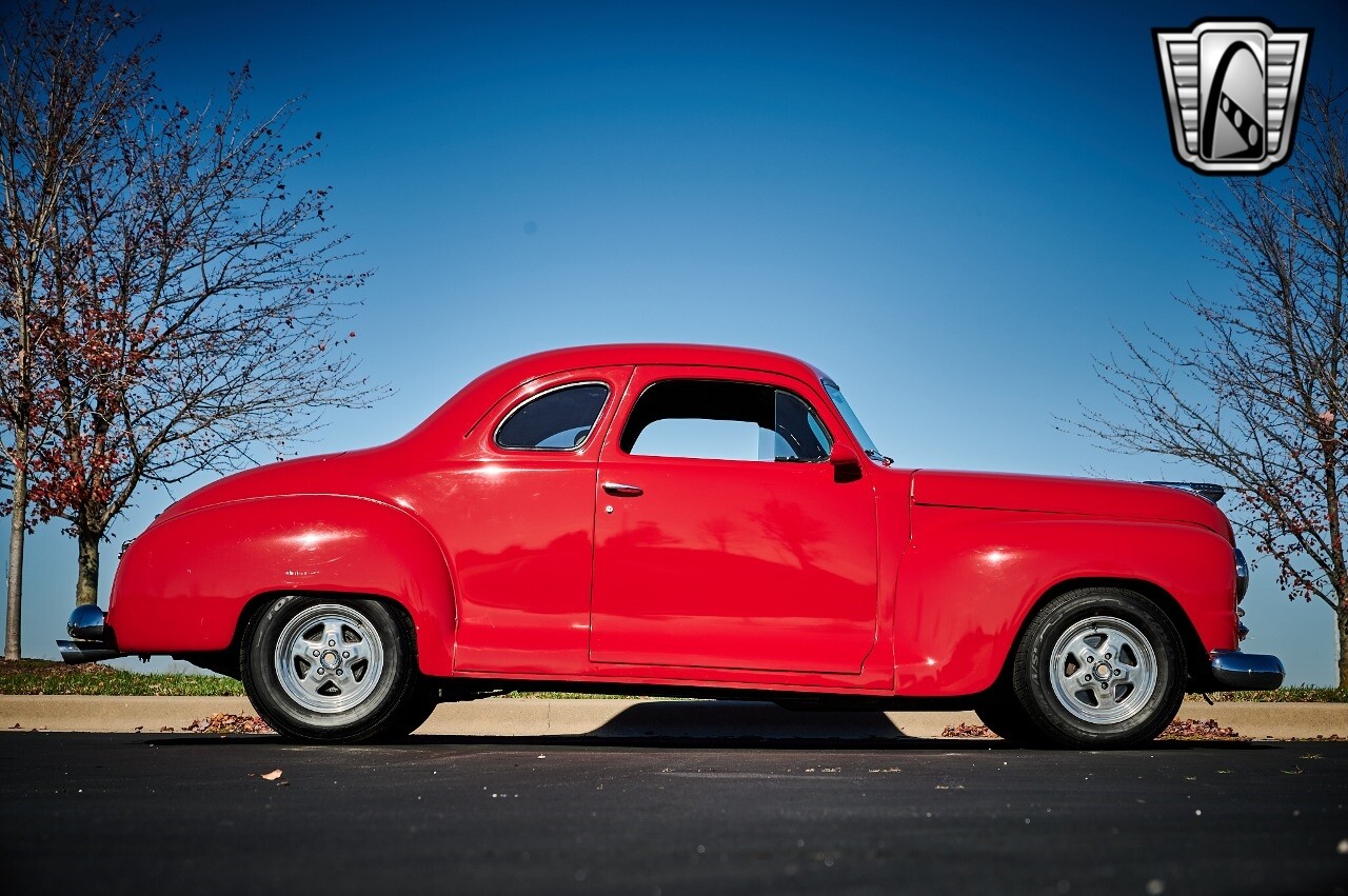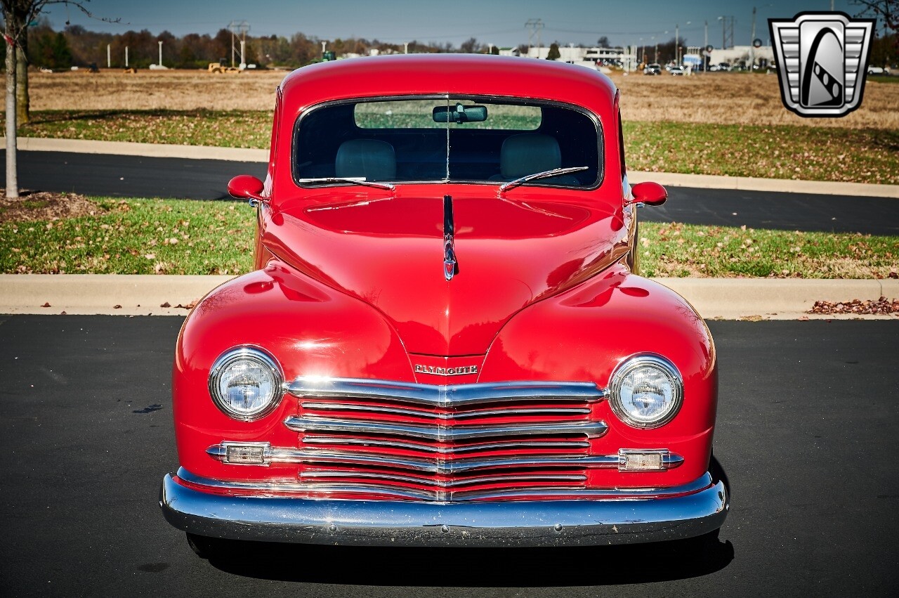 Gateway Classic Cars of STL is excited to list this 1948 Plymouth Super Deluxe coupe. This Victory Red 2 door beauty has a 318 CID V-8 Dodge engine paired up to an automatic transmission. This car has had a Nova subframe installed to modernize the front suspension system along with front power disc brakes. For added comfort & convenience, it has power steering, cruise control, LeCarra Steering wheel, tilt steering wheel & has had aftermarket air conditioning installed. The power tan door panels, floor mats and bucket seats with seat belts, compliment the blue carpet, dash & metal work inside. The below eye line dual outside mirrors add to its sleek look. This machine has staggered 15 inch alloy wheels wrapped in steel belted radial tires front & rear. According to the owner, this car has had air shocks installed on the rear of the car. The dash is complimented with functional Auto Meter gauges, indicator light for turn signals & a functioning nostalgic AM/FM Cassette player. The exhaust system has dual chrome tips both exiting the passenger side rear of the car. [ omitted ]. [ omitted ]. The St Louis showroom is located at 1237 Central Park Drive, O'Fallon Illinois 62269.