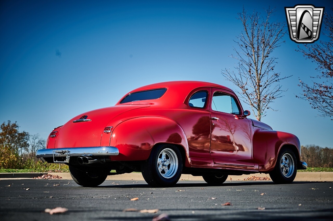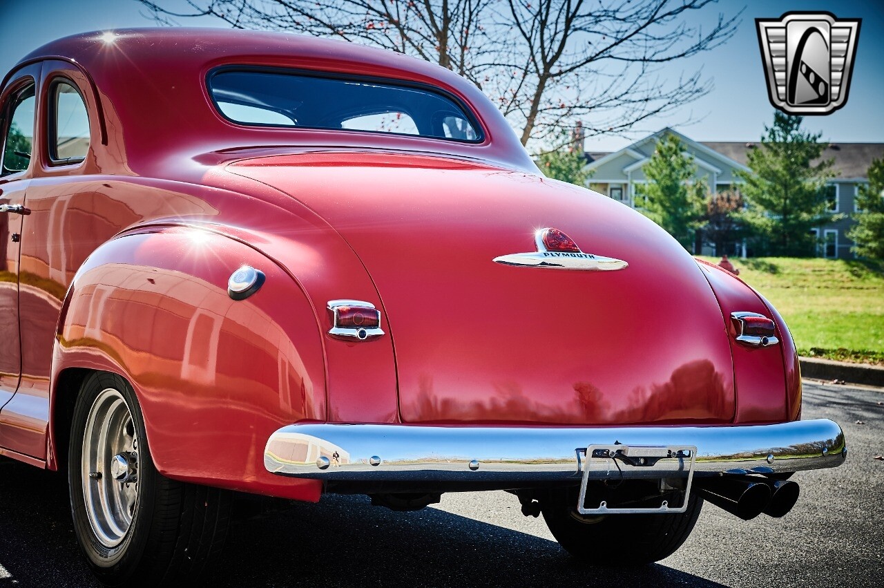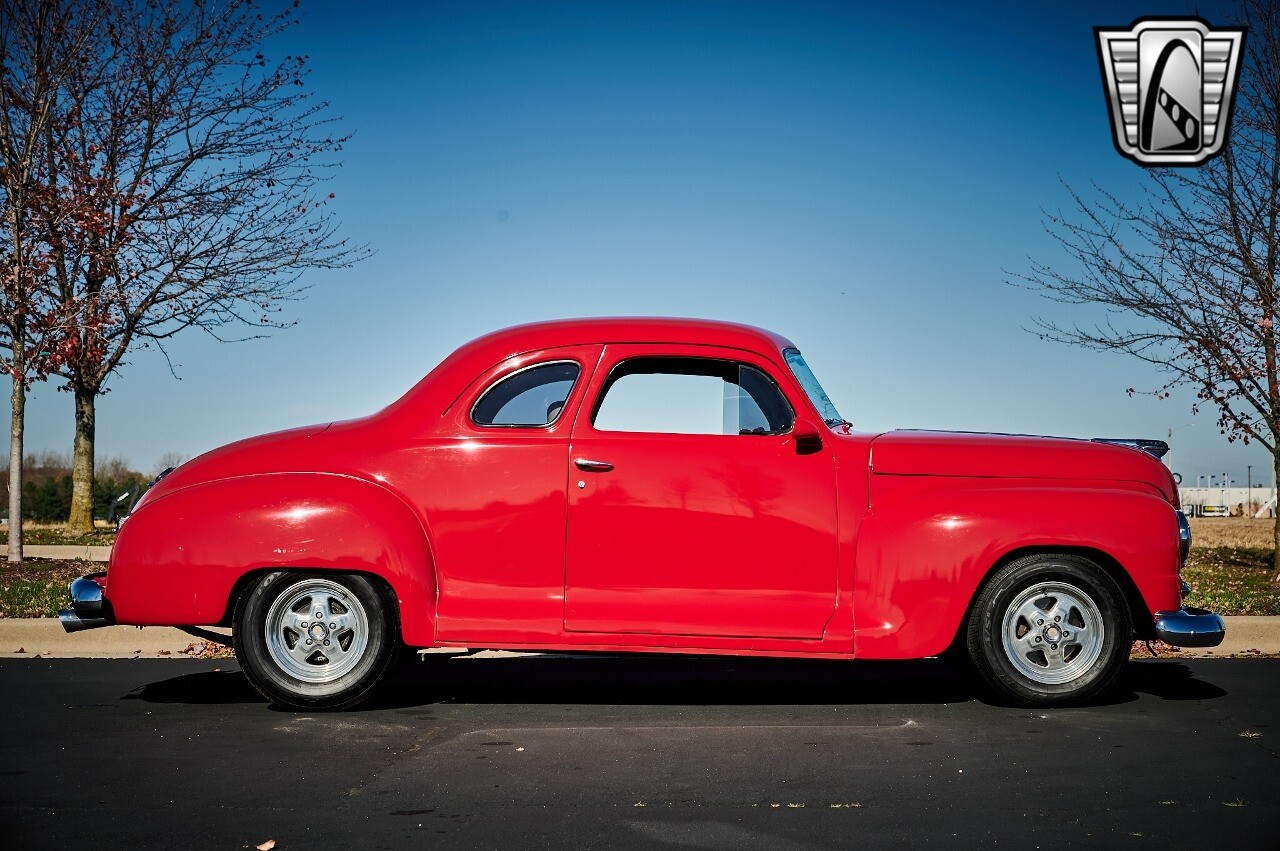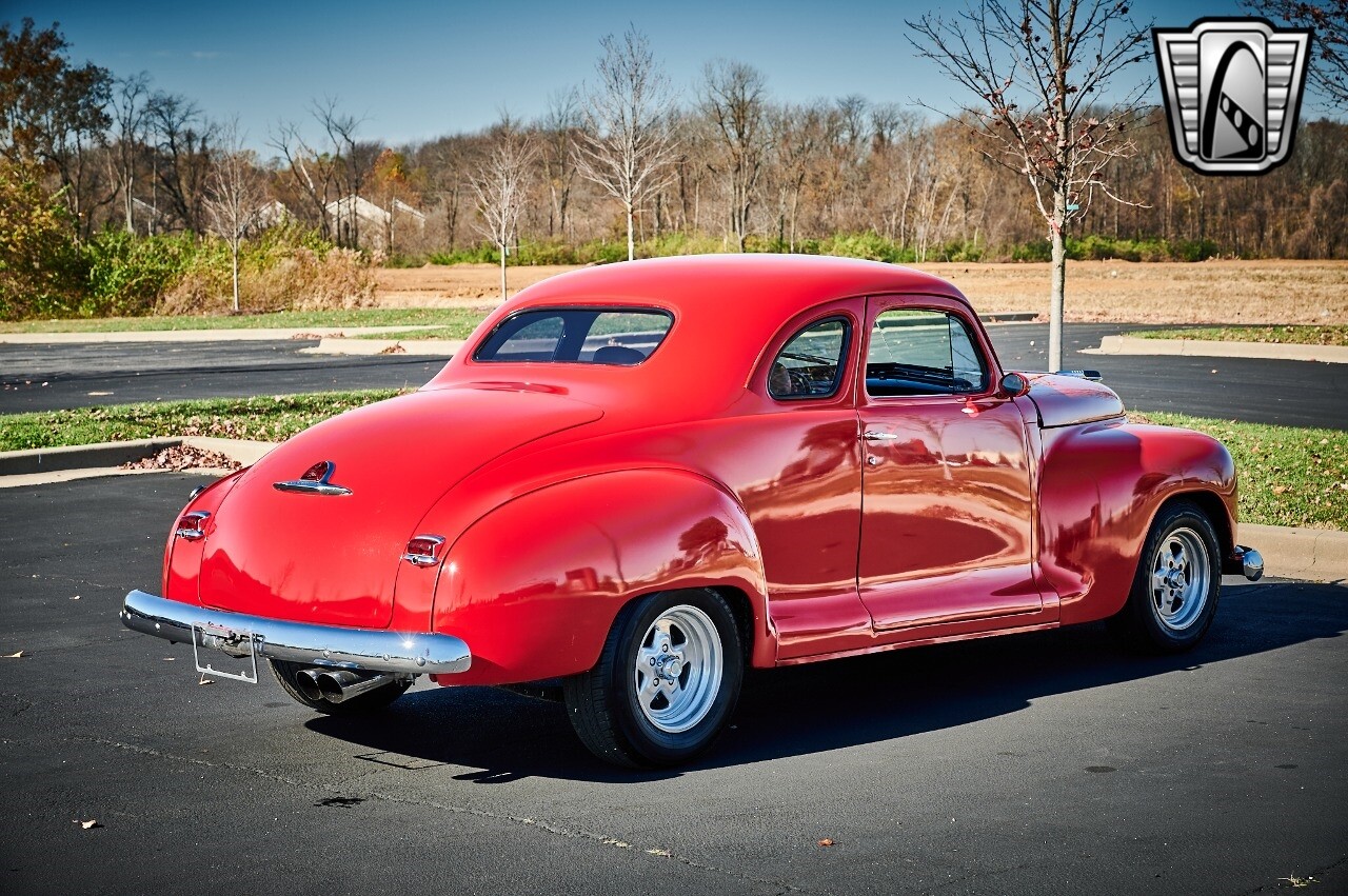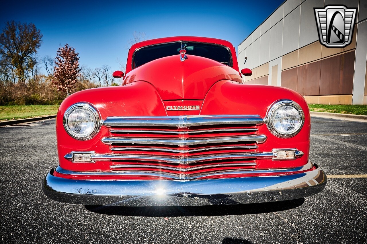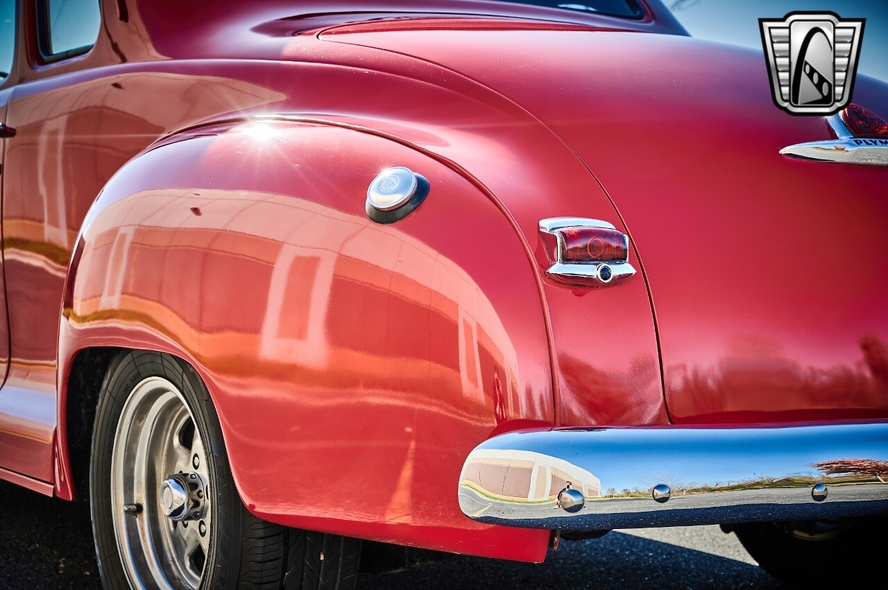Gateway Classic Cars of STL is excited to list this 1948 Plymouth Super Deluxe coupe. This Victory Red 2 door beauty has a 318 CID V-8 Dodge engine paired up to an automatic transmission. This car has had a Nova subframe installed to modernize the front suspension system along with front power disc brakes. For added comfort & convenience, it has power steering, cruise control, LeCarra Steering wheel, tilt steering wheel & has had aftermarket air conditioning installed. The power tan door panels, floor mats and bucket seats with seat belts, compliment the blue carpet, dash & metal work inside. The below eye line dual outside mirrors add to its sleek look. This machine has staggered 15 inch alloy wheels wrapped in steel belted radial tires front & rear. According to the owner, this car has had air shocks installed on the rear of the car. The dash is complimented with functional Auto Meter gauges, indicator light for turn signals & a functioning nostalgic AM/FM Cassette player. The exhaust system has dual chrome tips both exiting the passenger side rear of the car. [ omitted ]. [ omitted ]. The St Louis showroom is located at 1237 Central Park Drive, O'Fallon Illinois 62269.