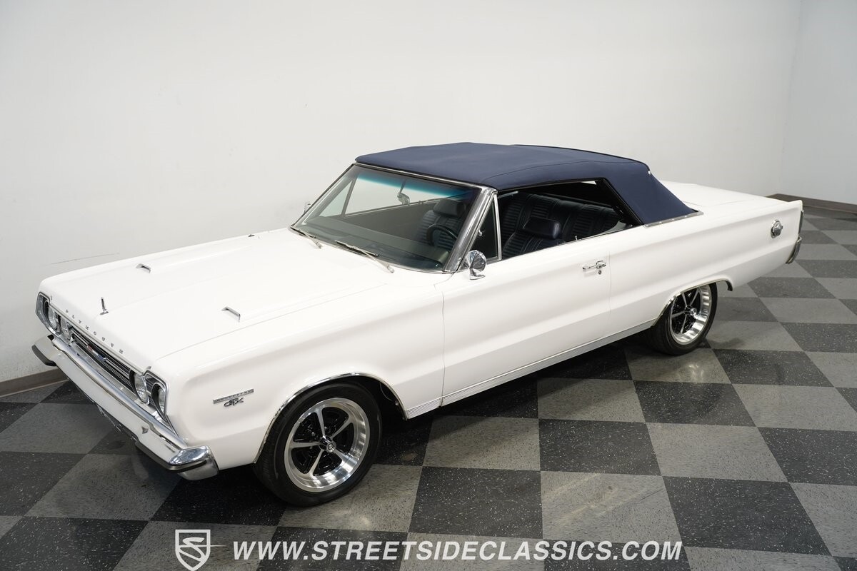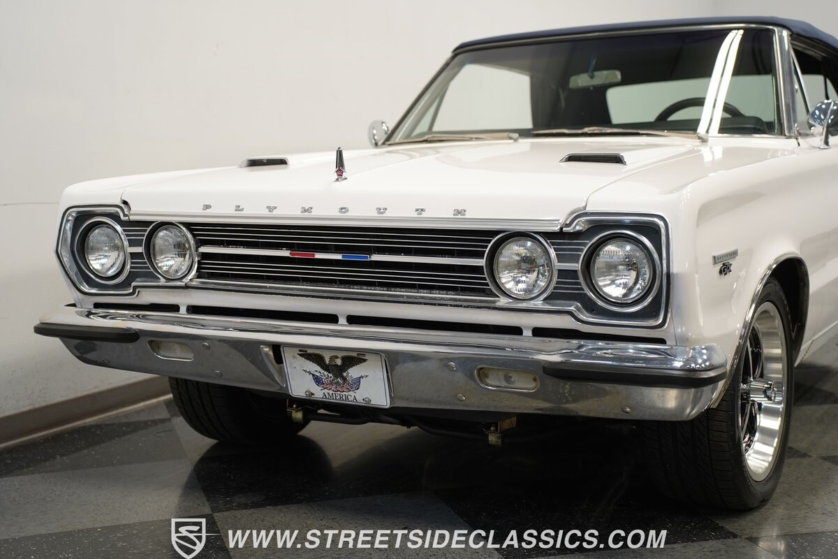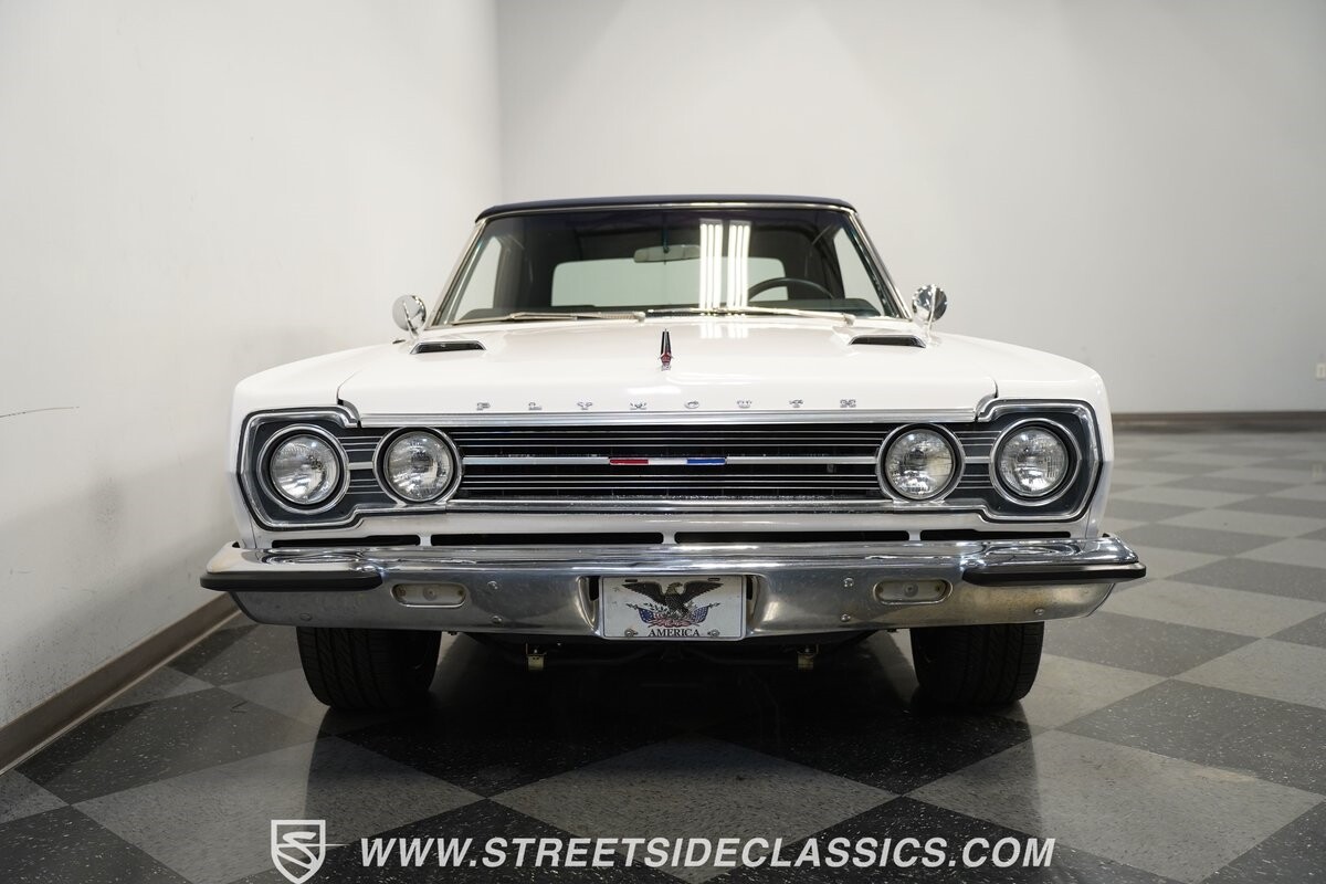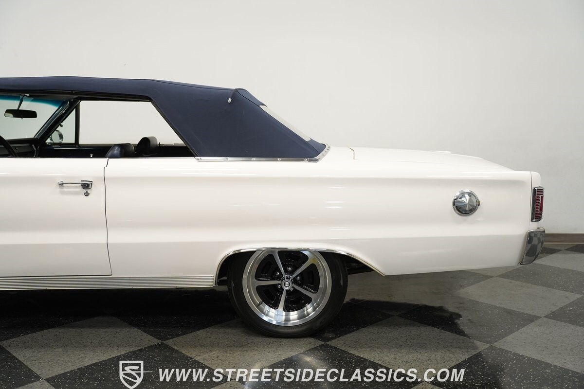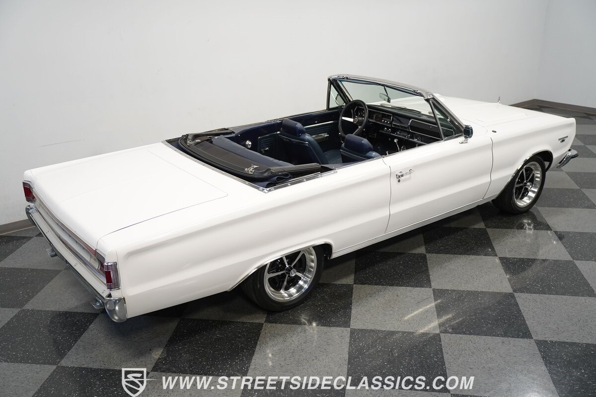 This 1967 Plymouth Belvedere II GTX Tribute Convertible radiates elegance in its White exterior, highlighted by a striking dark blue canvas top, creating a captivating contrast. Mounted on 17" factory-style wheels enveloped in 245/45R17 tires, its presence is commanding yet refined. Adding to its allure is a power antenna, seamlessly integrated into the fender.
