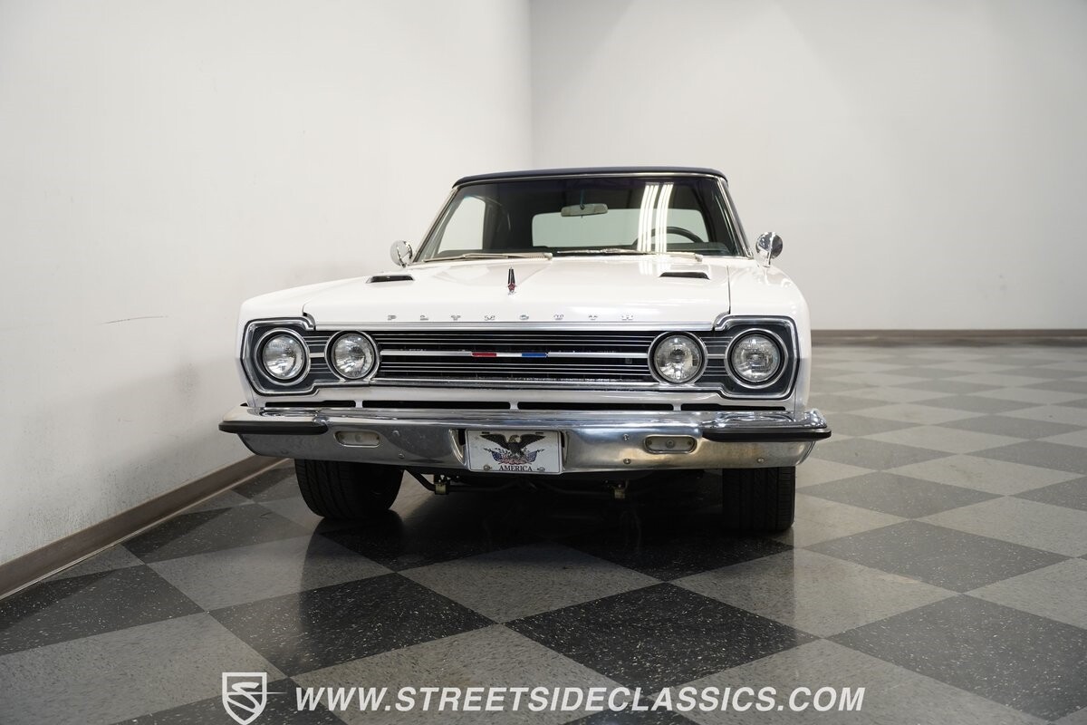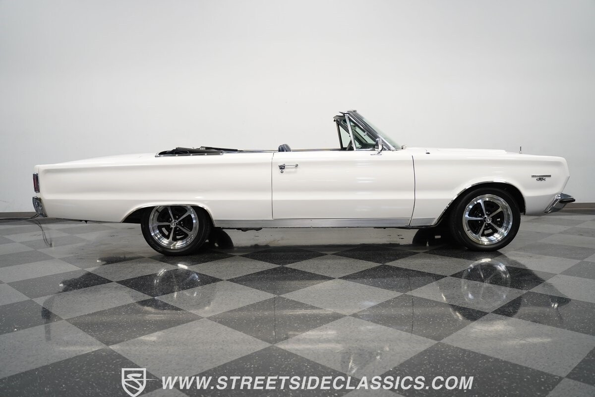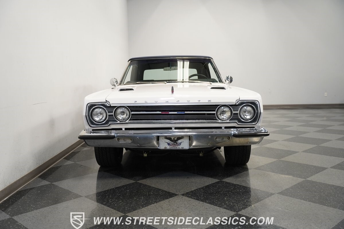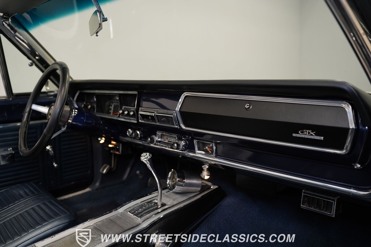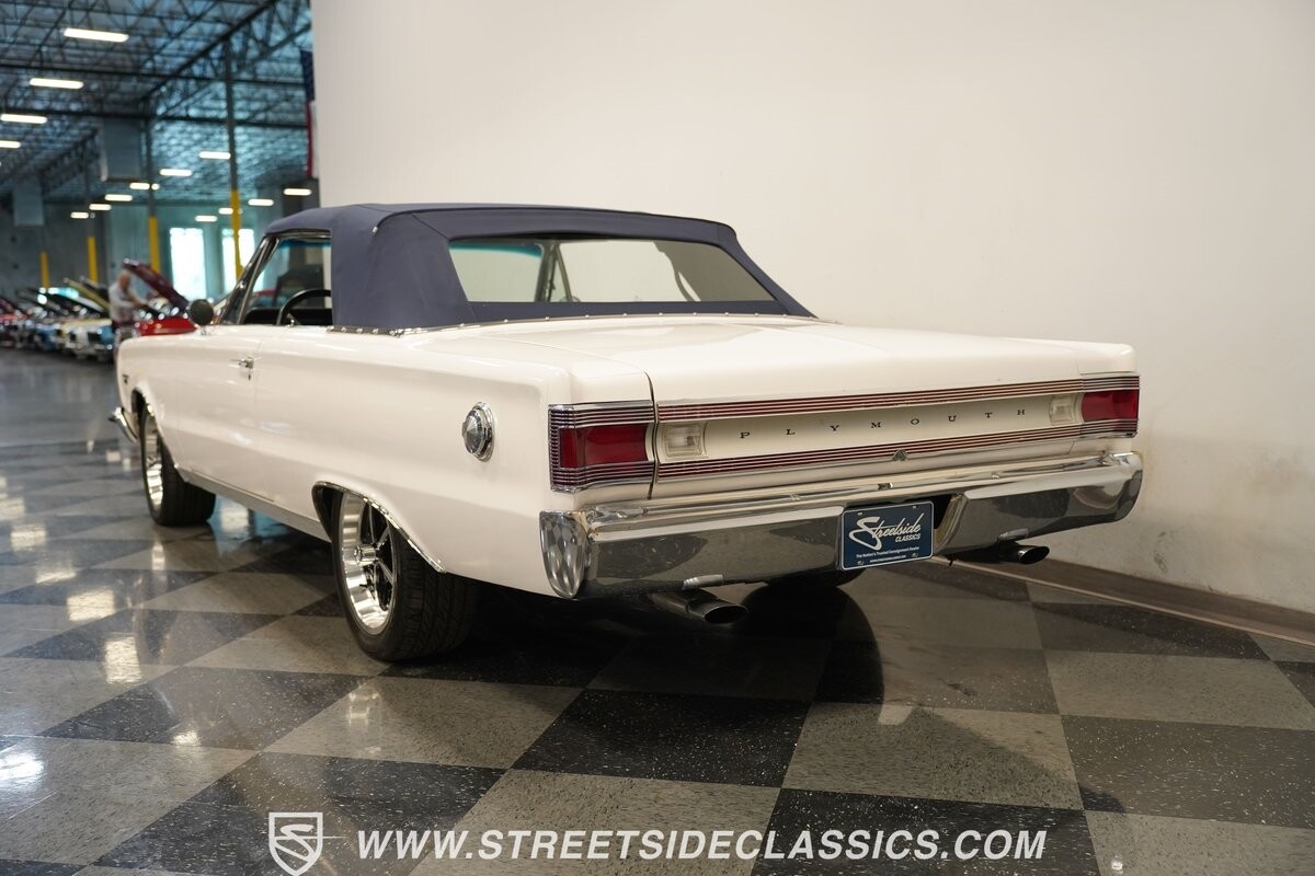 This 1967 Plymouth Belvedere II GTX Tribute Convertible radiates elegance in its White exterior, highlighted by a striking dark blue canvas top, creating a captivating contrast. Mounted on 17" factory-style wheels enveloped in 245/45R17 tires, its presence is commanding yet refined. Adding to its allure is a power antenna, seamlessly integrated into the fender.