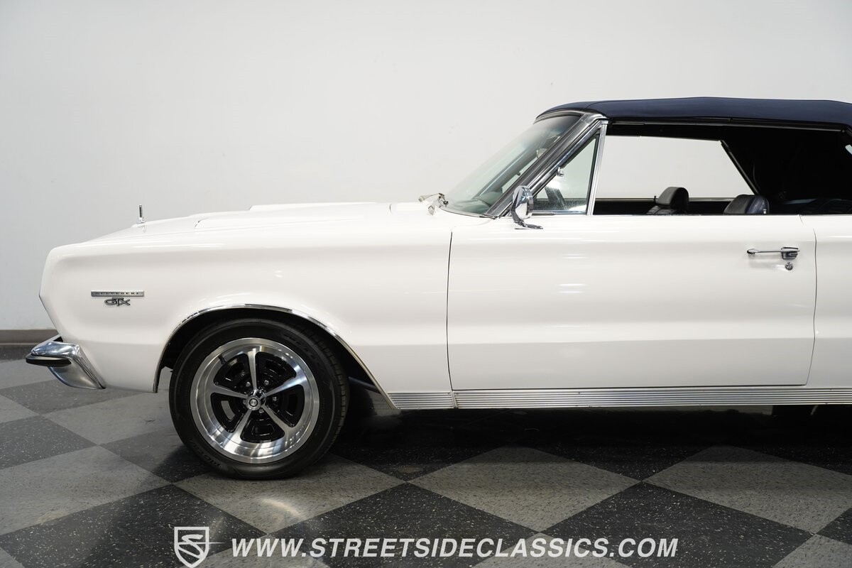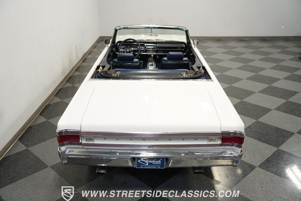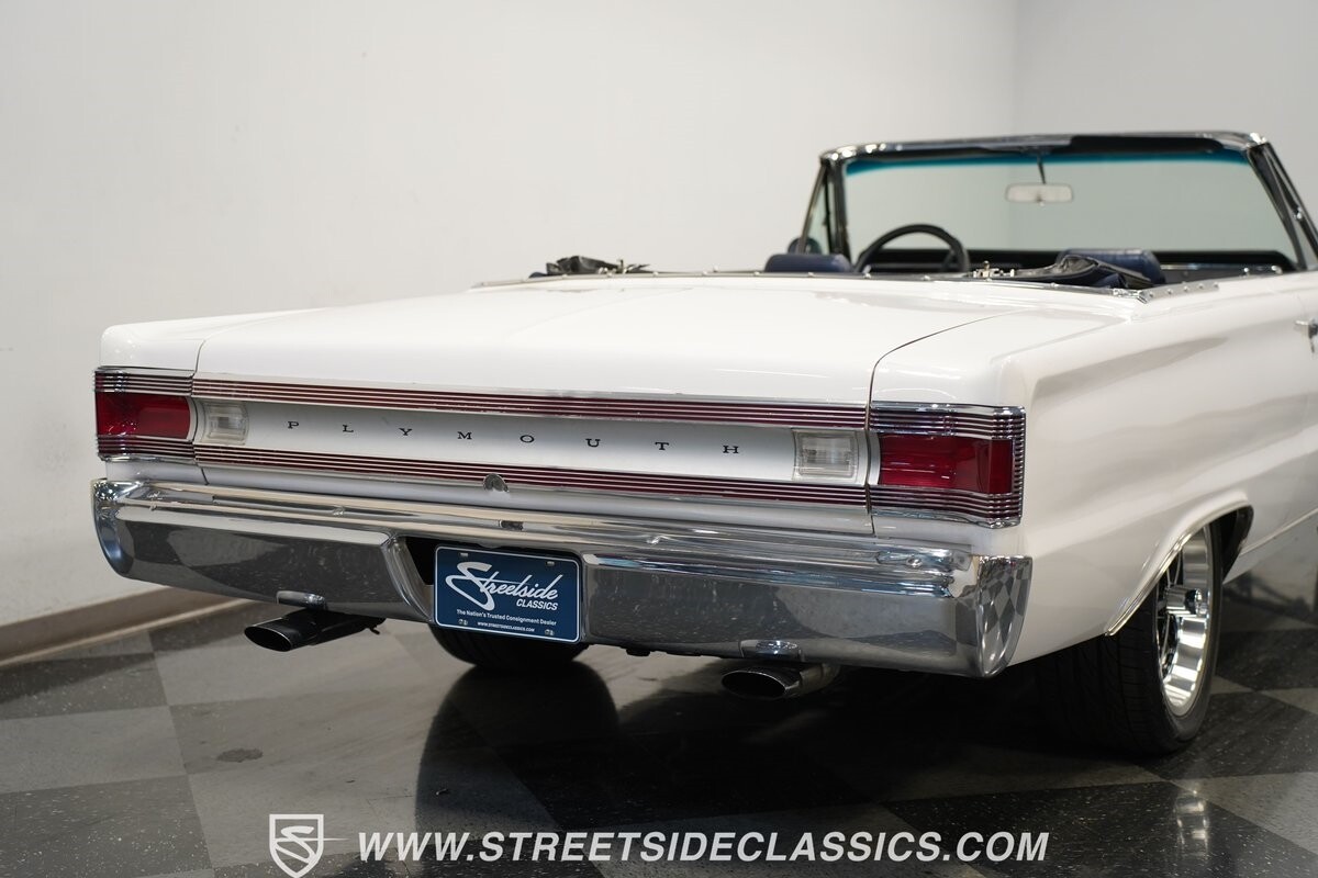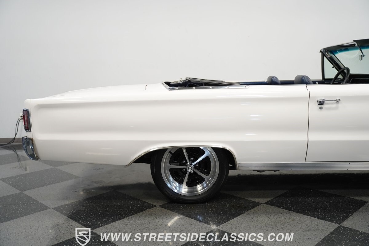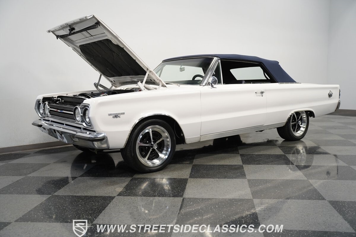 This 1967 Plymouth Belvedere II GTX Tribute Convertible radiates elegance in its White exterior, highlighted by a striking dark blue canvas top, creating a captivating contrast. Mounted on 17" factory-style wheels enveloped in 245/45R17 tires, its presence is commanding yet refined. Adding to its allure is a power antenna, seamlessly integrated into the fender.