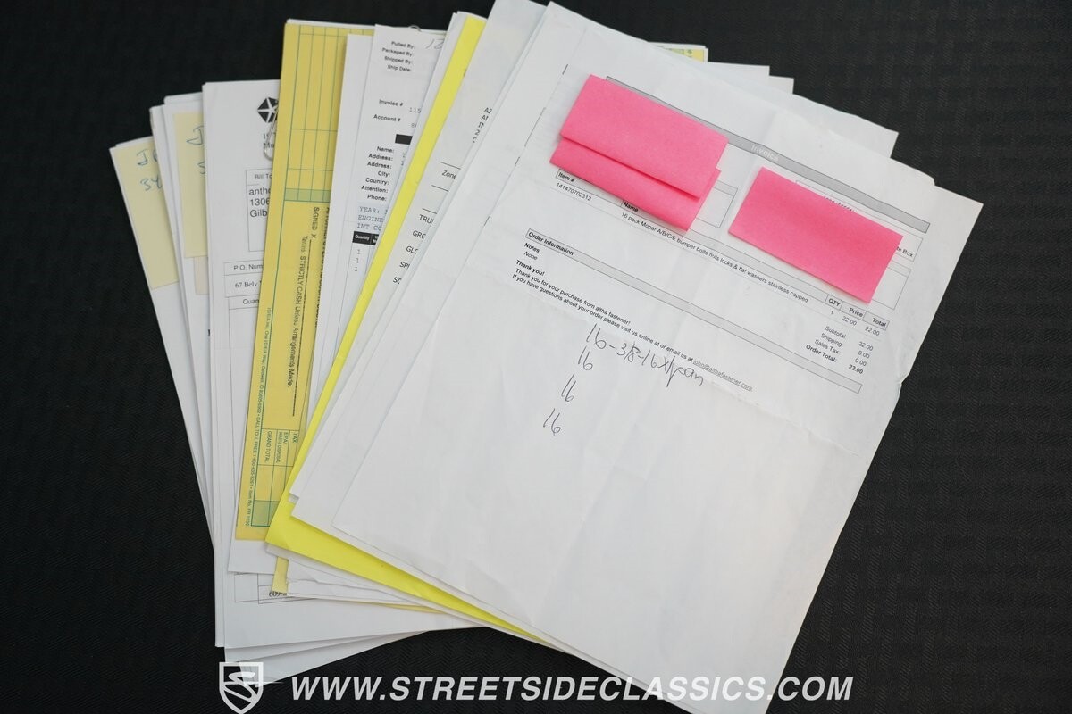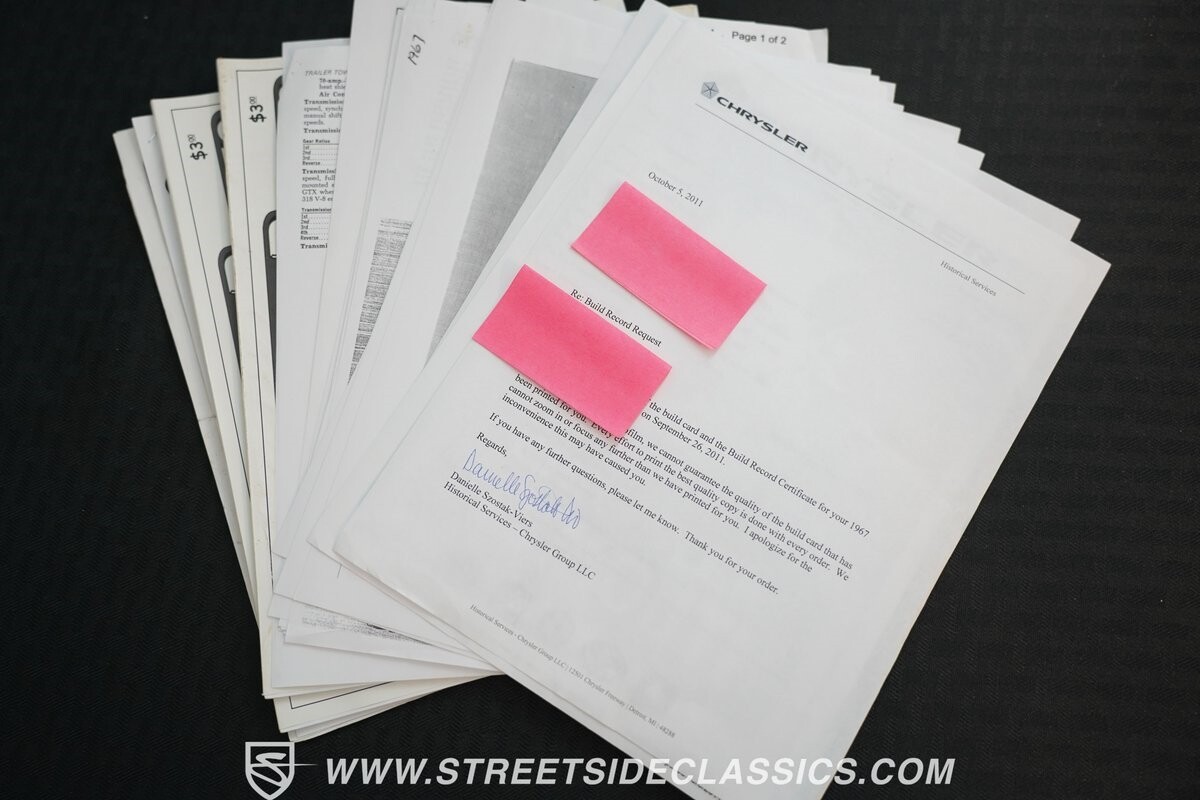 In the cockpit, a sea of blue engulfs you, with Blue Vinyl bucket seats and a center console complete with a factory tachometer. Enhanced by power steering, well-preserved carpet, door panels and dash pad. These elements encircle the stock dash, which houses precise AC controls and an AM radio, all underpinned by the comprehensive documentation this vehicle comes with - a Chrysler Build Sheet, a full appraisal, and an extensive collection of receipts and manuals, ensuring its rich history and meticulous upkeep.