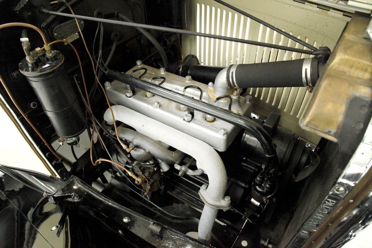 A lift of either side of the cowled hood and we see a completely restored 175.4ci L head inline 4 cylinder engine. It has a 1-barrel carburetor feeding it and a 3-speed manual transmission on the back. The rear axle is 4.30. A very nice presentation for this power plant and engine bay.