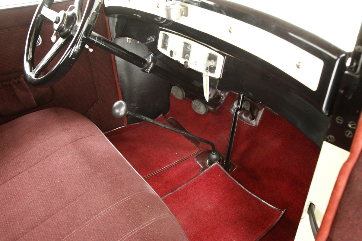 Typical of the era for car manufacturing, this car is the norm with steel cowled hood, exterior curved fenders, a front radiator cowl and single headlight on either side. The car is painted in pale yellow paint for the hood, lower doors, and trunk, and uses black as the paint for the fenders, running boards, and roofline with some accenting on the hood's edges. The radiator is chromed, as is the headlight bar stretching across the front of the radiator. Also, the single large round headlights have chromed bezels and casings with a chromed dual bar bumper is below. The trunk area of this coupe is also a rumble seat and resides under a nicely curved rear of the car line with some black accenting on the edges. A spare tire just above the dual bar rear bumper in chrome. The glass is all in good condition and the roofline is rust free. This car rides on 19-inch wood spoked wheels in natural wood finish with 4.75/5.00-19 inch tires wrapping the wheels