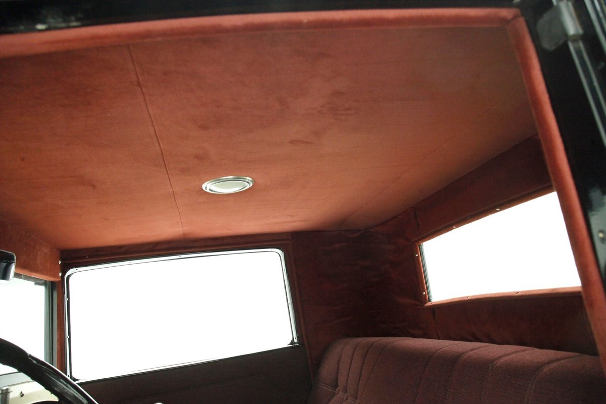 Sporting the original layout, we are greeted with restored panels using maroon broadcloth for the padded and stitched sides which have a pocket and chromed actuators and cranks. A bench in a tub is the front seat and only one under the roofline, and it stretches from door to door, all in maroon broadcloth with some light tuck and rolling as well as buttons on the uppers. Maroon piping is a nice edging to the seat. This bench floats in red carpeting in very nice condition and upfront, a slightly curved tutone pale yellow and black all steel dash is installed. In the upper center it utilizes an oval cast Plymouth badge and below are a trio of inset rounded rectangular gauges looking the era. There is a chromed dash light under the top and below is a choke knob. A long armed shifter reaches for the driver and he sits behind a large black bakelite steering wheel, also original to the car. The headliner and pillar coverings are in deep red felting and all are tear free and nice and tight. Under the trunk lid is the mother in law, (Rumble!), seat also covered in the maroon broadcloth with just tuck and roll pattern and some red carpeting for its floor.