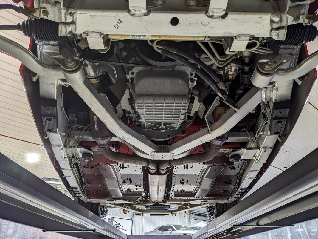 UNDERSIDE: It features an aluminum intensive chassis to keep it light weight. The 4 wheel independent suspension makes it handle like a sports car. Factory stainless to dual exhaust system has a nice rumble to it! Under the car is still very clean, everything looks to be in great shape with no damage.