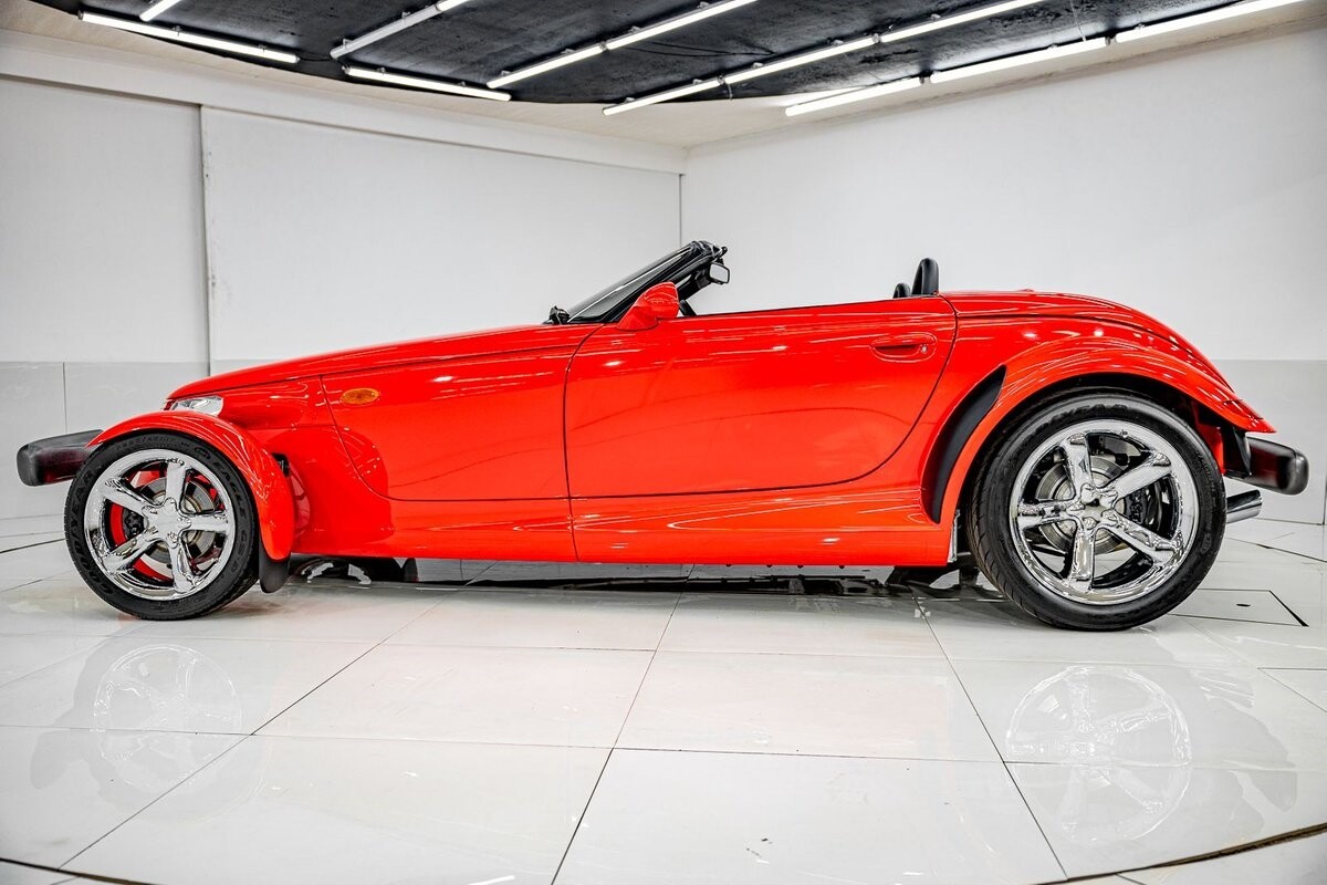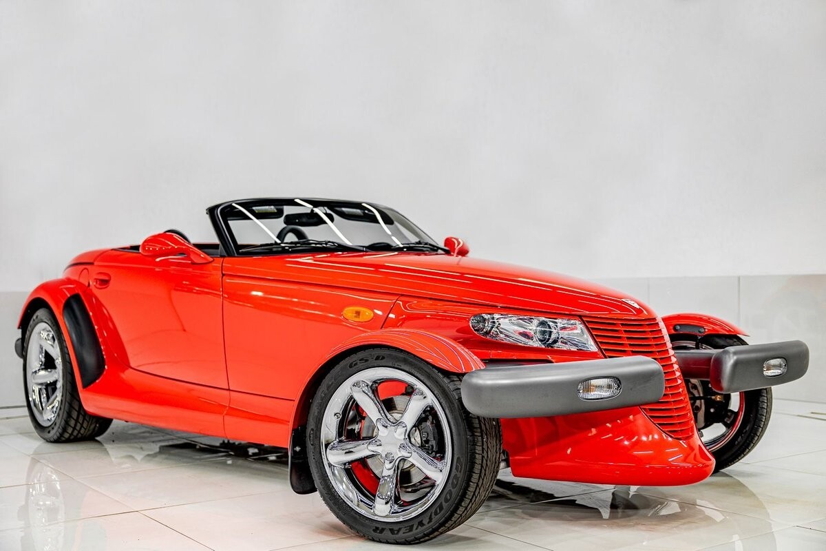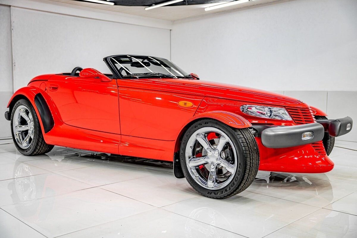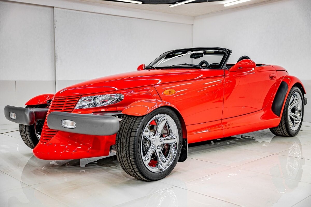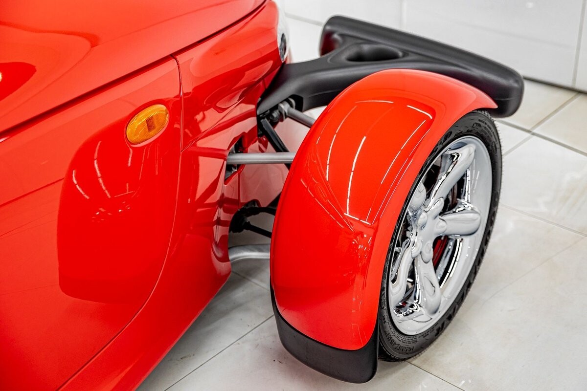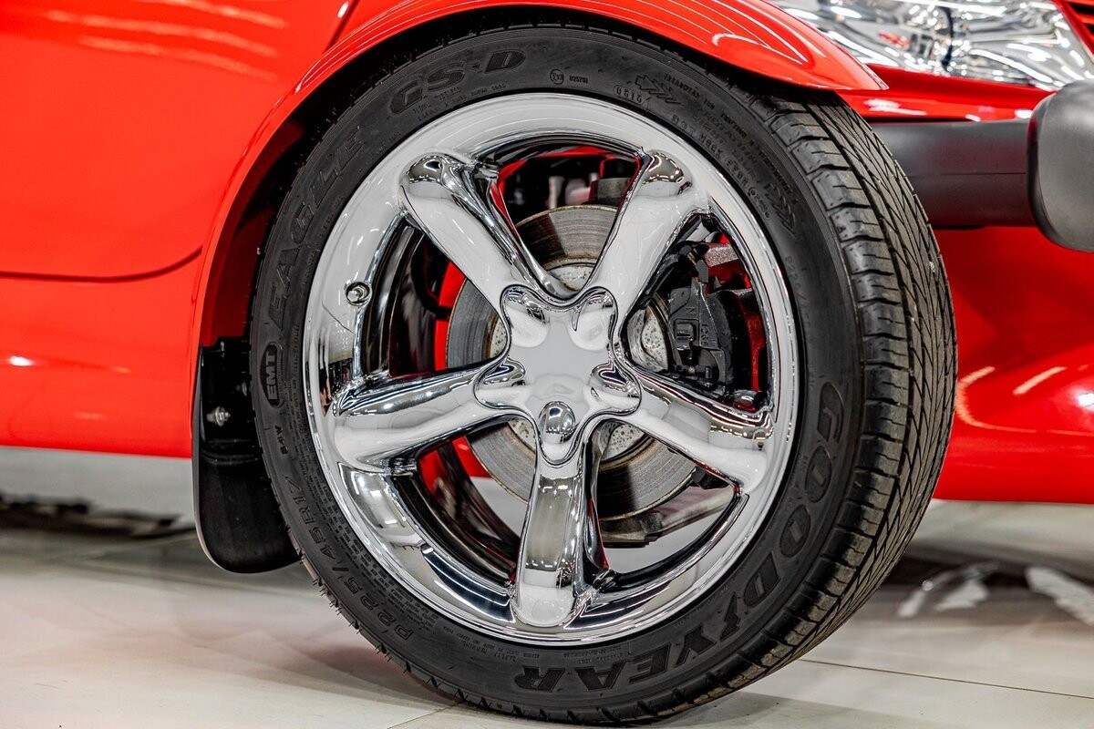 EXTERIOR: The prowler red is a very sharp color. The body is excellent, no damage anywhere that I can find. The original paint is excellent. The wheels are staggered size with 17s in front and 20s in back. The tires like new. The black cloth convertible top looks great and is very functional. It is still equipped with the factory front and rear bumpers. It literally looks like it just rolled off the assembly floor. All the exposed front suspension is immaculate.