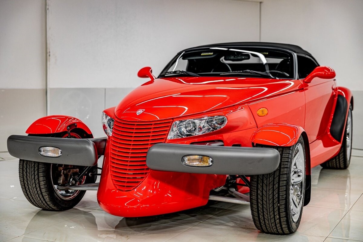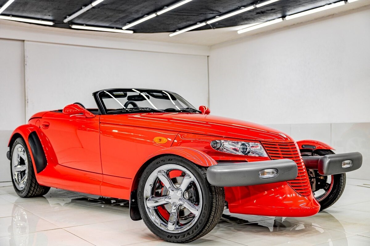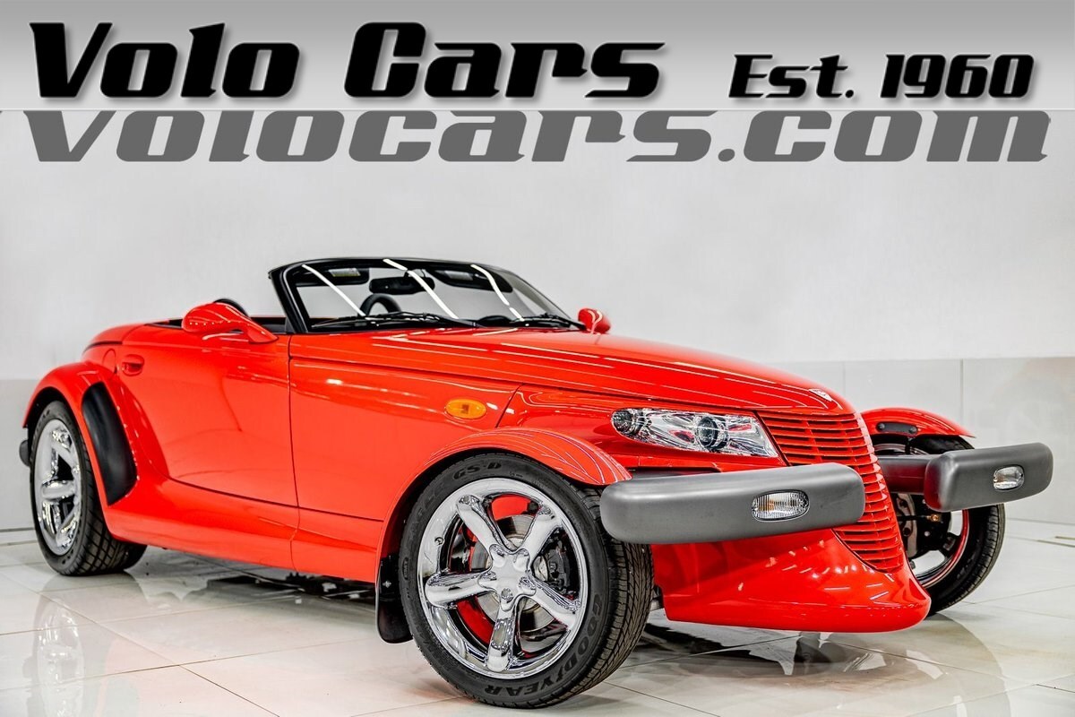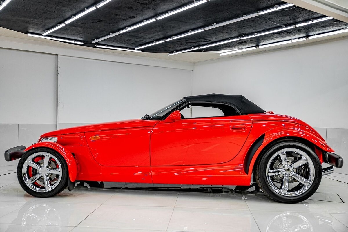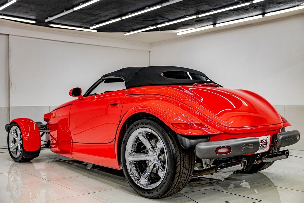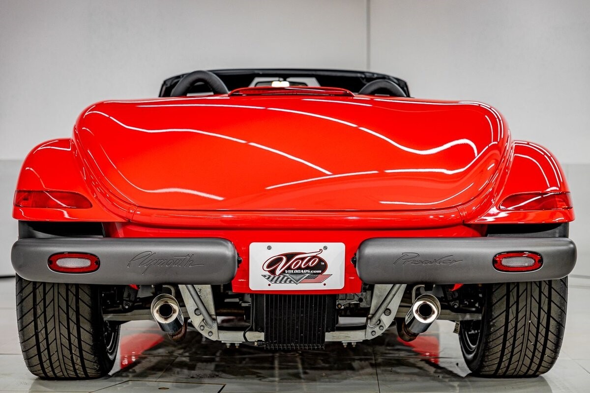 EXTERIOR: The prowler red is a very sharp color. The body is excellent, no damage anywhere that I can find. The original paint is excellent. The wheels are staggered size with 17s in front and 20s in back. The tires like new. The black cloth convertible top looks great and is very functional. It is still equipped with the factory front and rear bumpers. It literally looks like it just rolled off the assembly floor. All the exposed front suspension is immaculate.