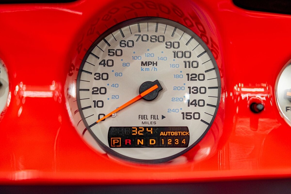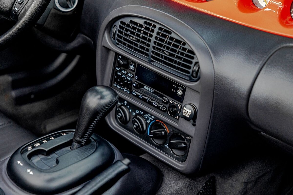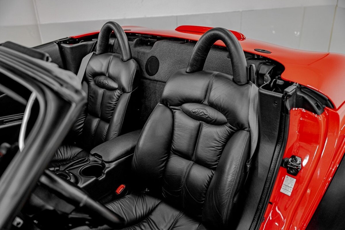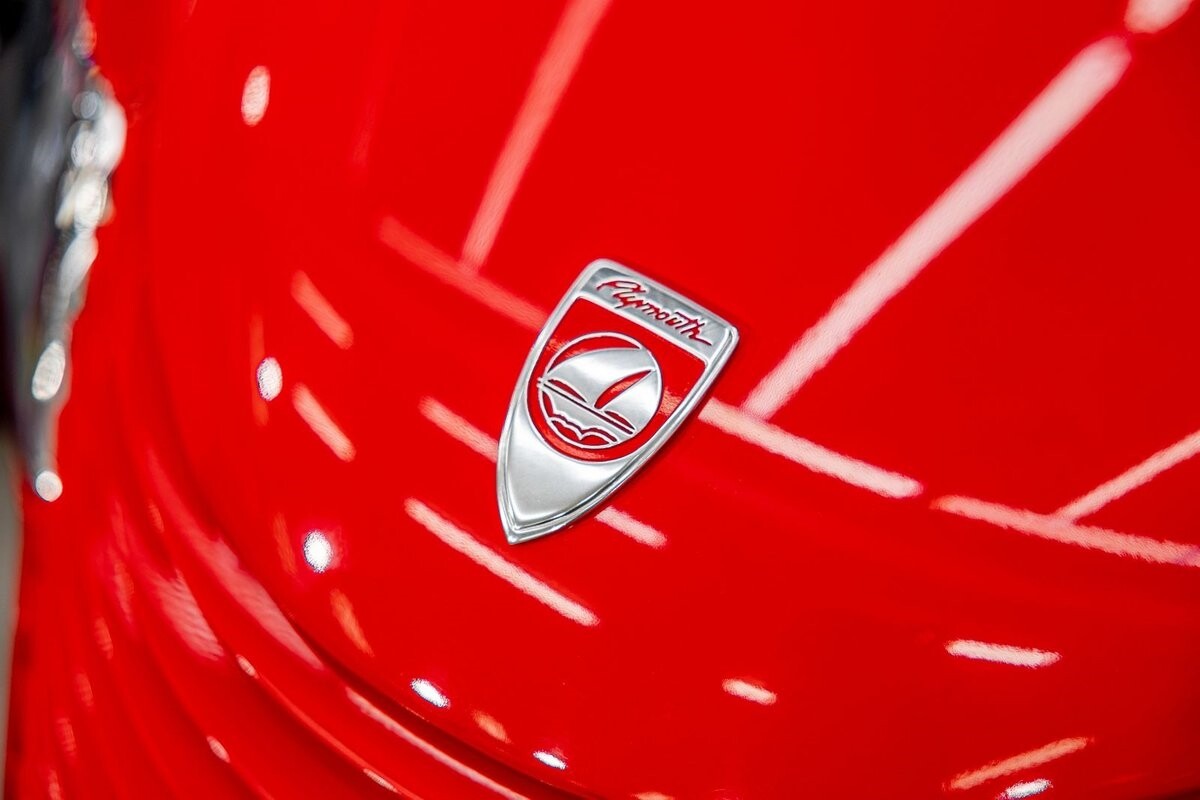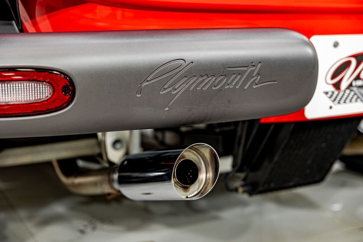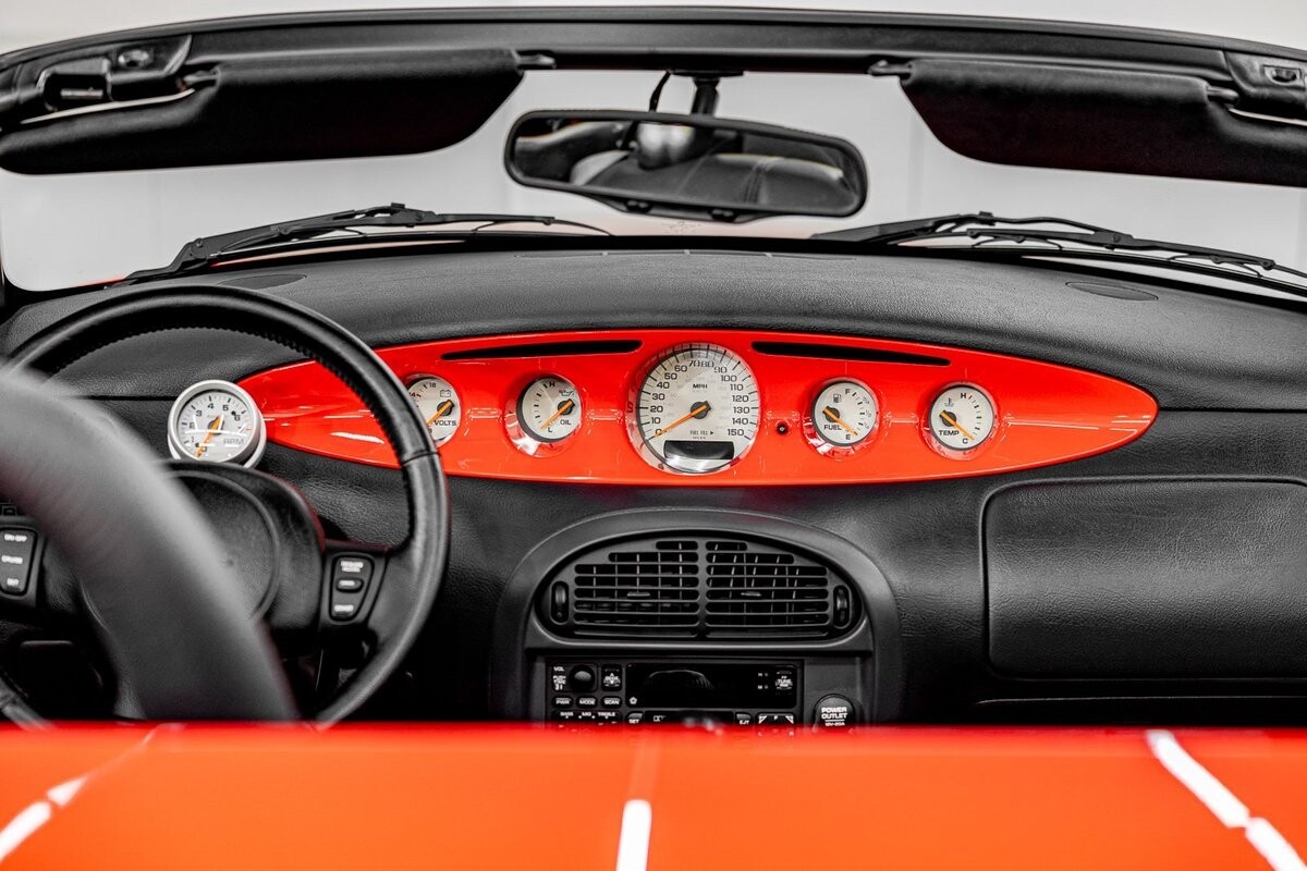 EXTERIOR: The prowler red is a very sharp color. The body is excellent, no damage anywhere that I can find. The original paint is excellent. The wheels are staggered size with 17s in front and 20s in back. The tires like new. The black cloth convertible top looks great and is very functional. It is still equipped with the factory front and rear bumpers. It literally looks like it just rolled off the assembly floor. All the exposed front suspension is immaculate.