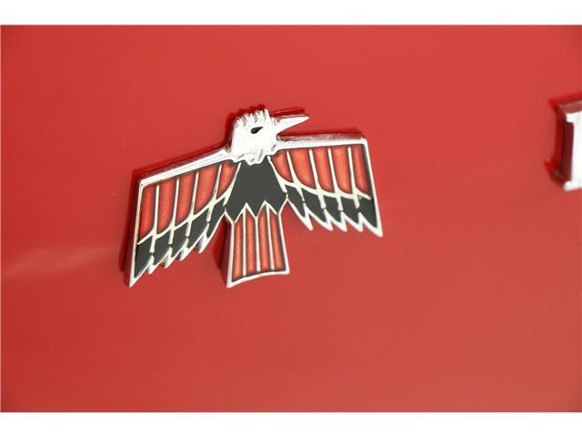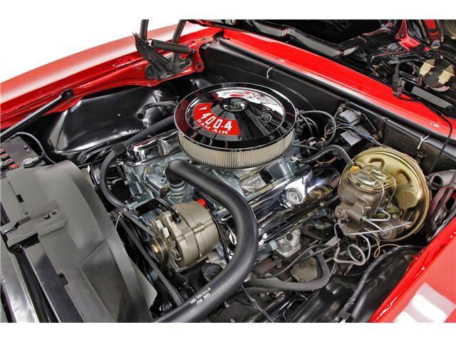 The vehicle features a Ram air hood equipped with dual scoops, a red 400 emblem situated on the sides, and a tachometer mounted on the hood. The additional badges on the vehicle are of high quality, and the steel panels are perfectly aligned and maintain consistent gaps. The entire exterior is meticulously coated in a flawlessly applied and polished Torch Red finish.
