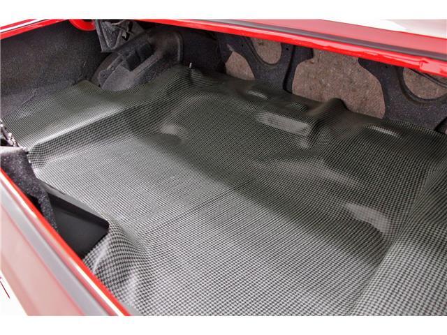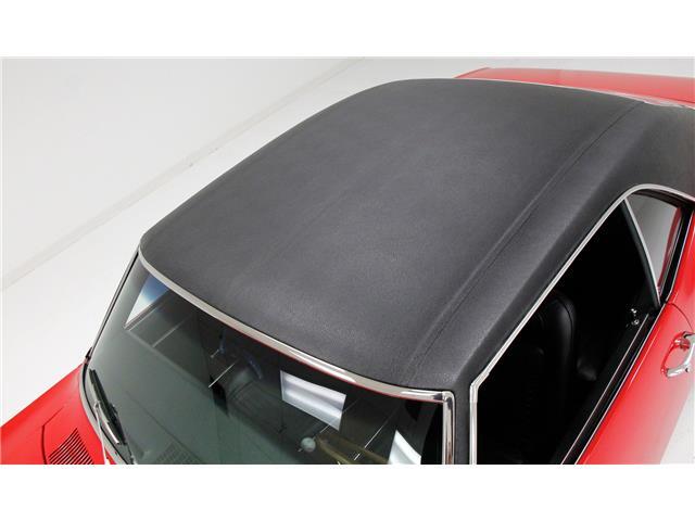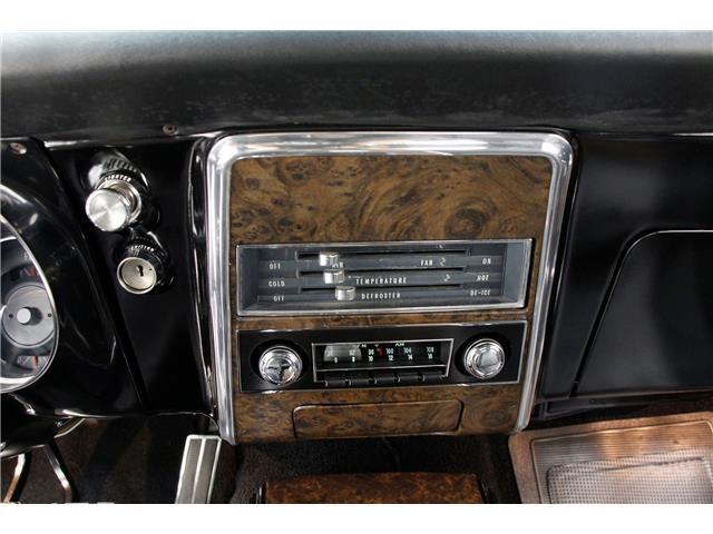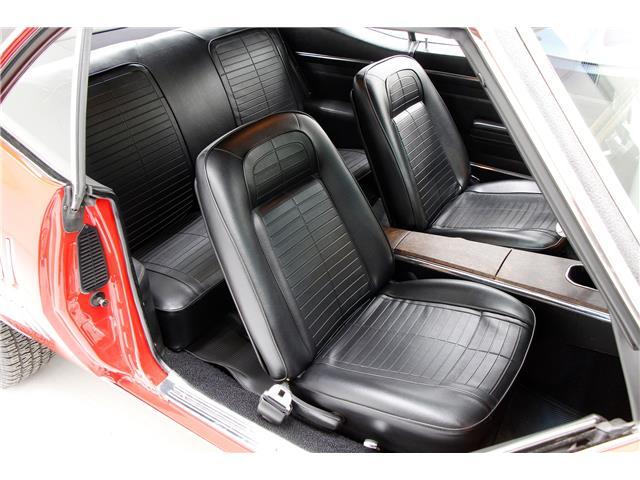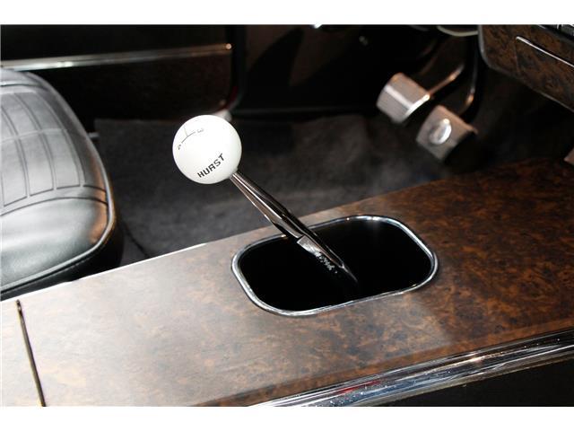 The redesigned interior features black vinyl high-back bucket seats in the front and a rear bench with faux stitched horizontal pleating centers and sleek bolsters. The door panels echo the seat design with smooth black vinyl. A wood-grained applique center console runs between the seats, housing a Hurst shifter that controls a close-ratio Muncie transmission. The angled dashboard is immaculate, showcasing new factory gauges, bezels, and switches. A wood steering wheel with a convenient tilt column adds to the sophistication of the interior. The headliner and black carpet are both flawless in appearance.