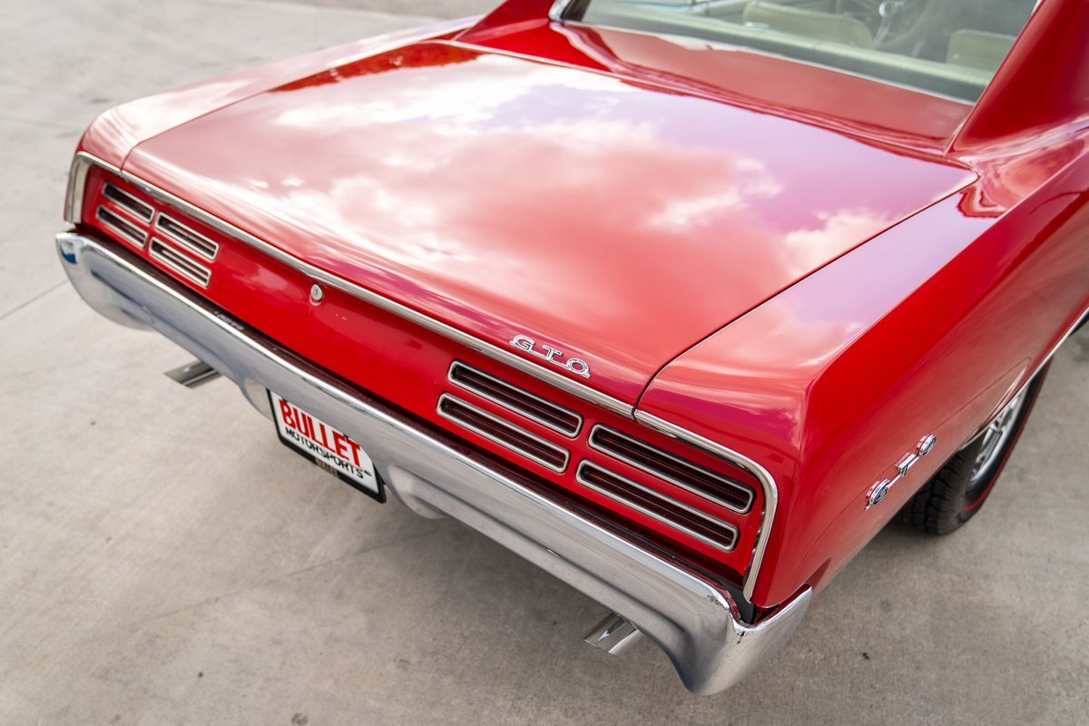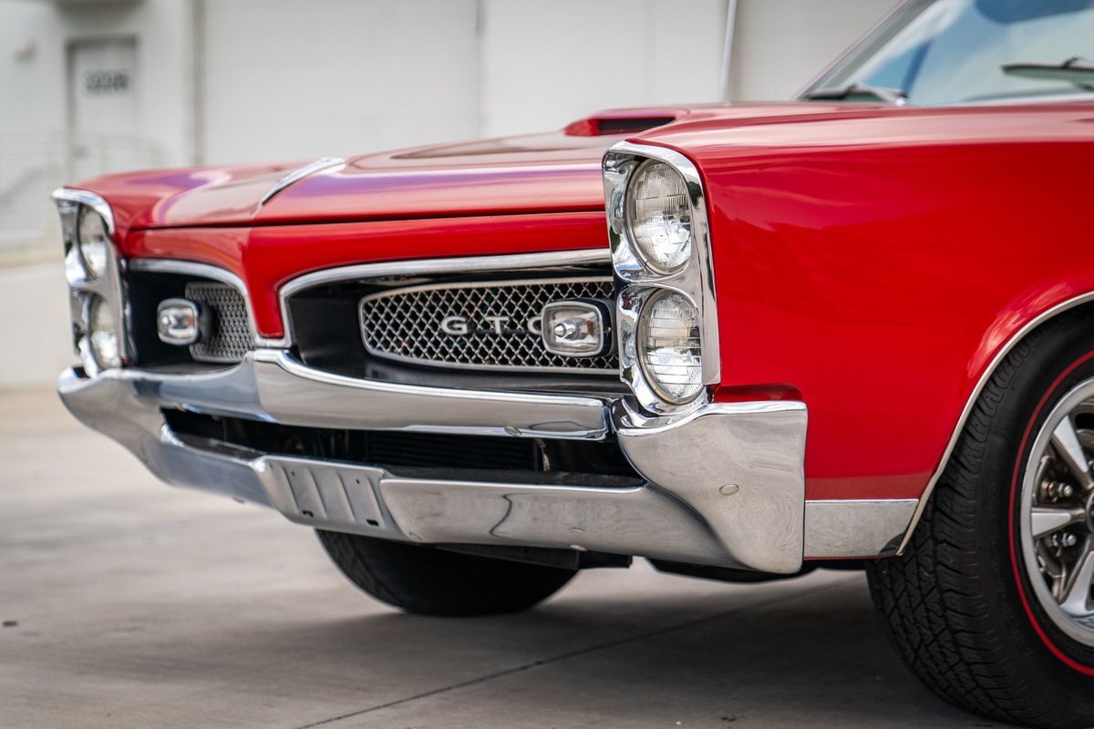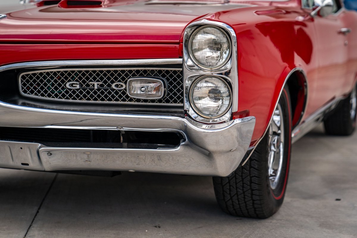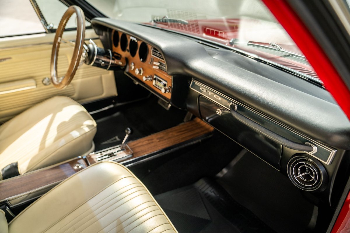 This 1967 Pontiac GTO hardtop coupe was refurbished under previous ownership and is powered by a 400ci V8 paired with a three-speed automatic transmission. The car is refinished in red over Parchment vinyl and equipped with power-assisted front disc brakes, power steering, 14" Rally II wheels with chrome trim rings, a Hurst shifter, power windows, and an aftermarket stereo.