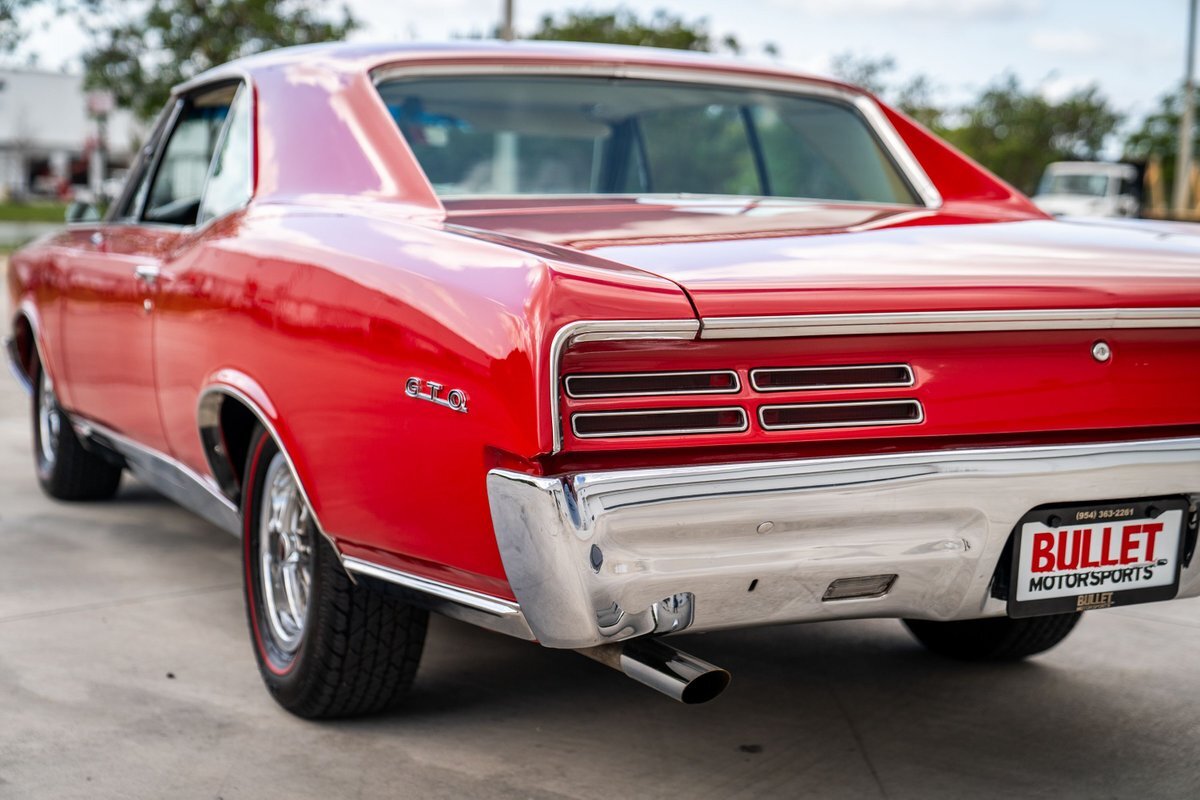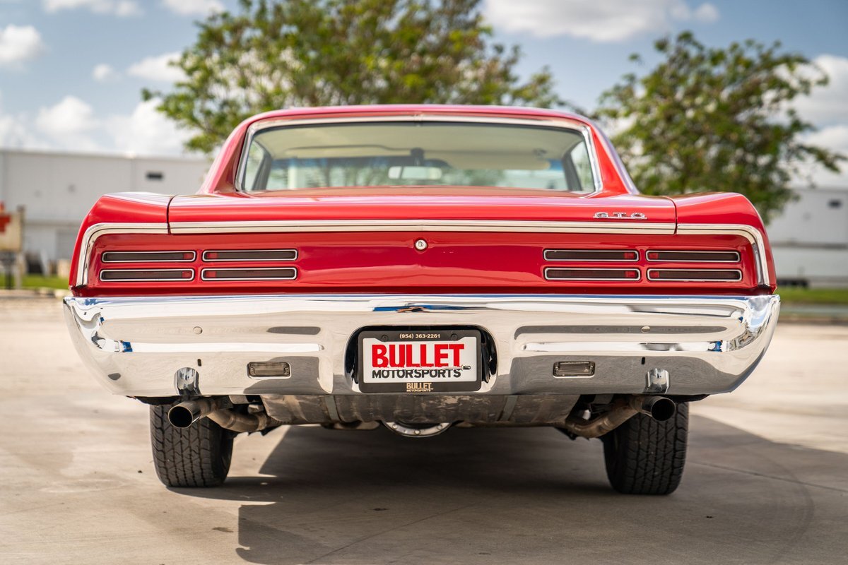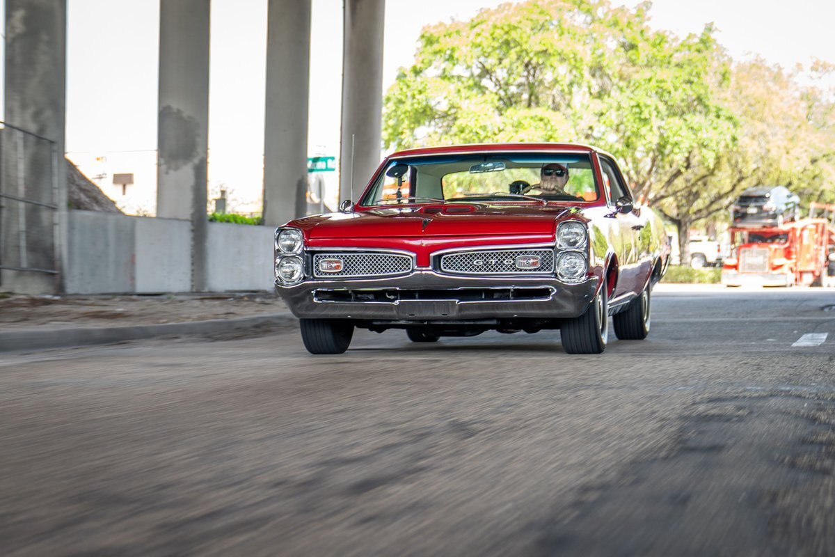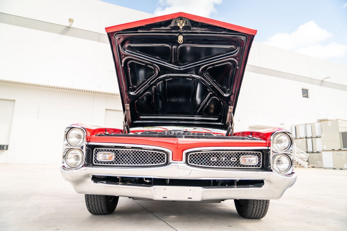 This 1967 Pontiac GTO hardtop coupe was refurbished under previous ownership and is powered by a 400ci V8 paired with a three-speed automatic transmission. The car is refinished in red over Parchment vinyl and equipped with power-assisted front disc brakes, power steering, 14" Rally II wheels with chrome trim rings, a Hurst shifter, power windows, and an aftermarket stereo.
