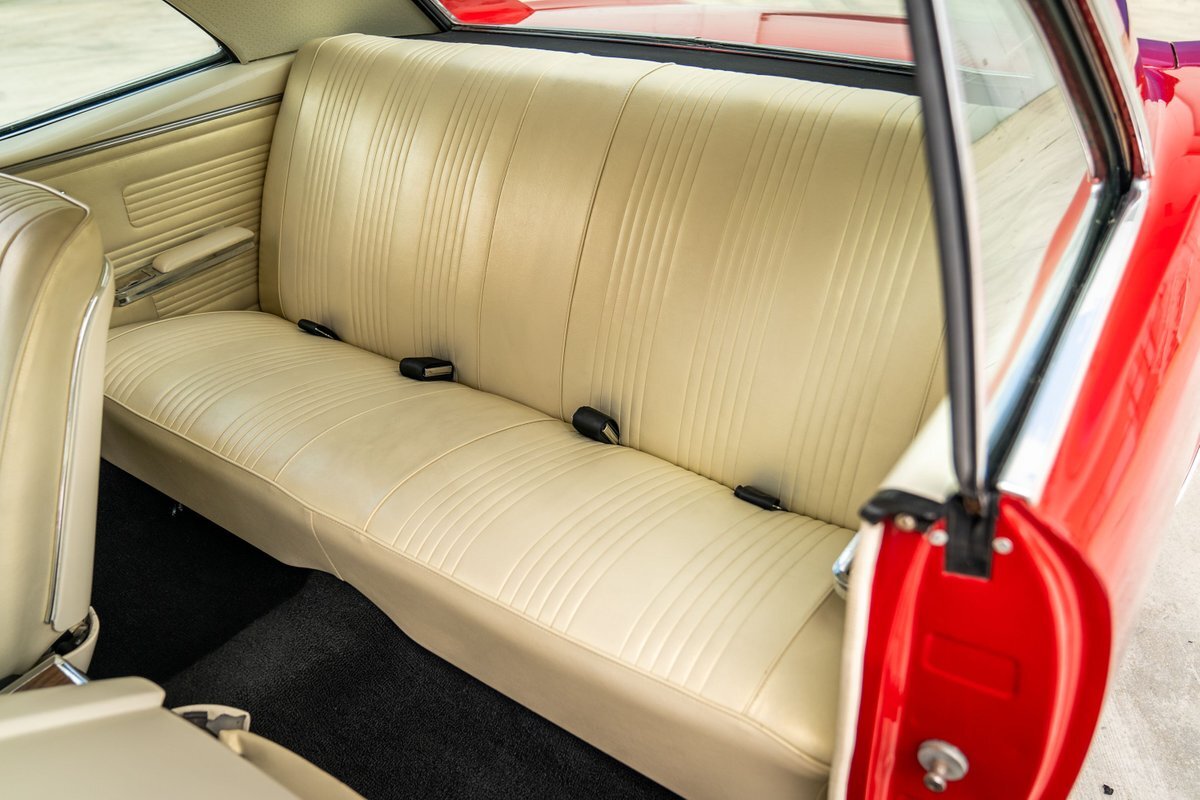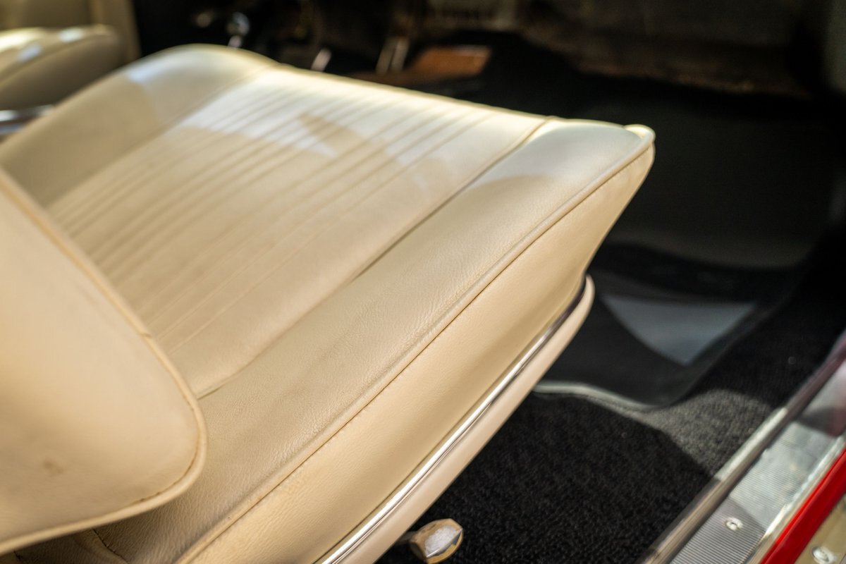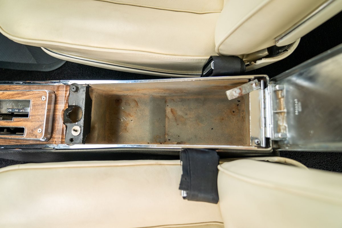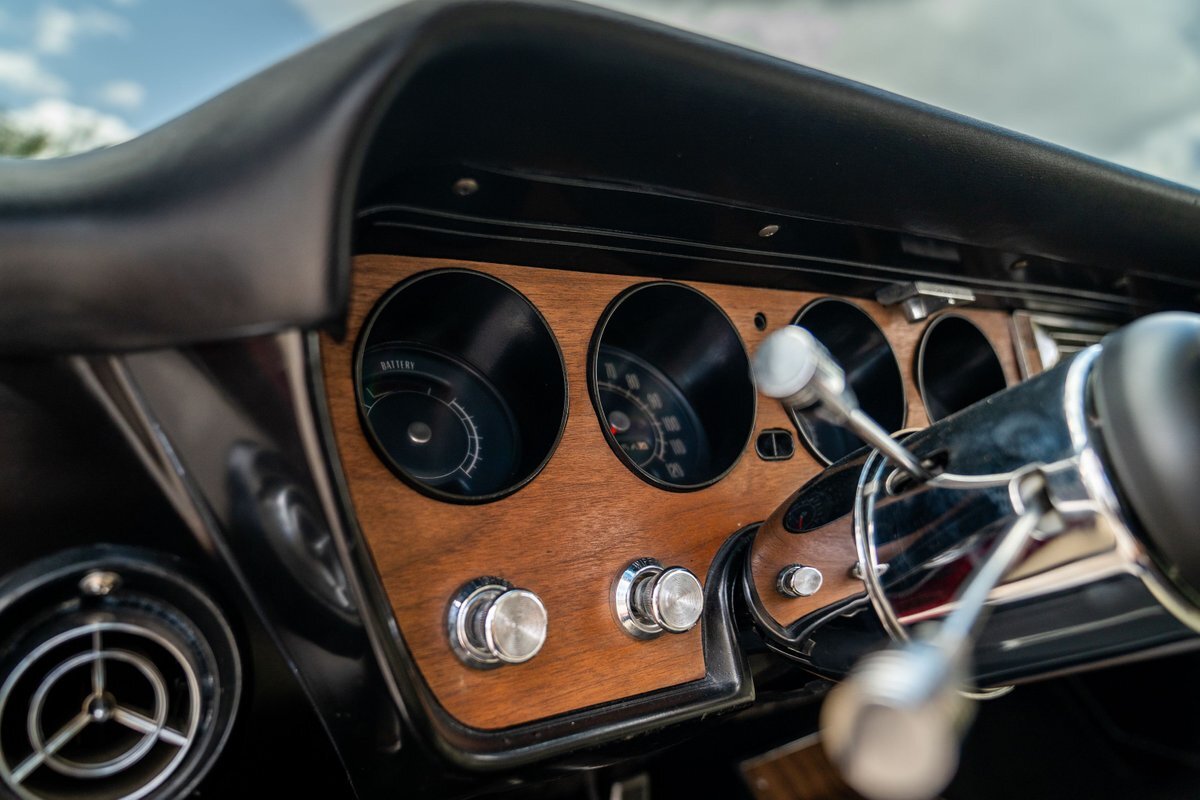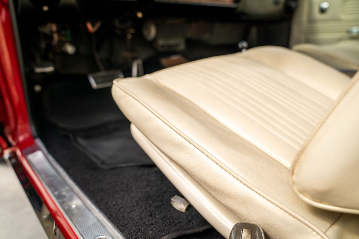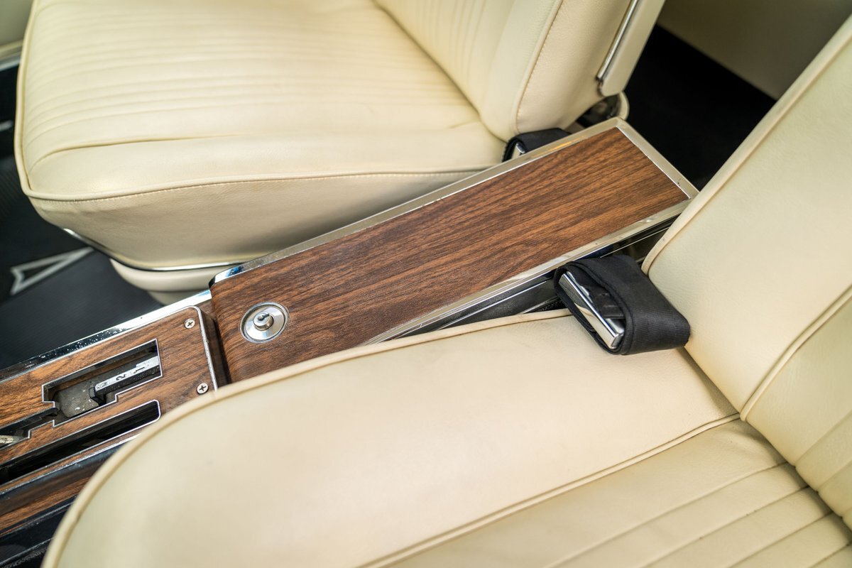 The cabin houses front bucket seats and a rear bench upholstered in Parchment vinyl, and interior appointments include a Hurst shifter, power windows, seatbelts, a full-length center console, an aftermarket AM/FM radio, and a locking glovebox. The air conditioner does not work. The wood-rimmed steering wheel fronts a 120-mph speedometer and a fuel-level gauge as well as warning lights for the battery, oil pressure, and temperature. The five-digit odometer shows 32k miles.