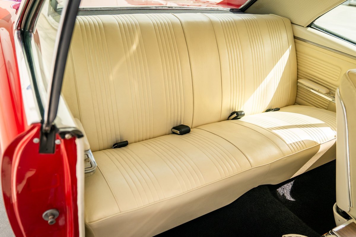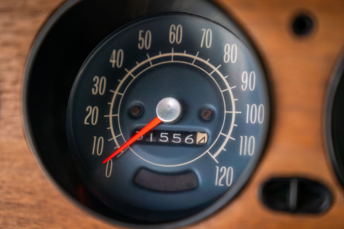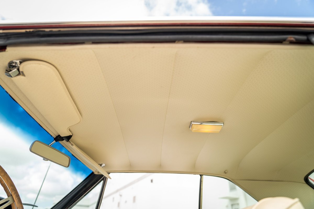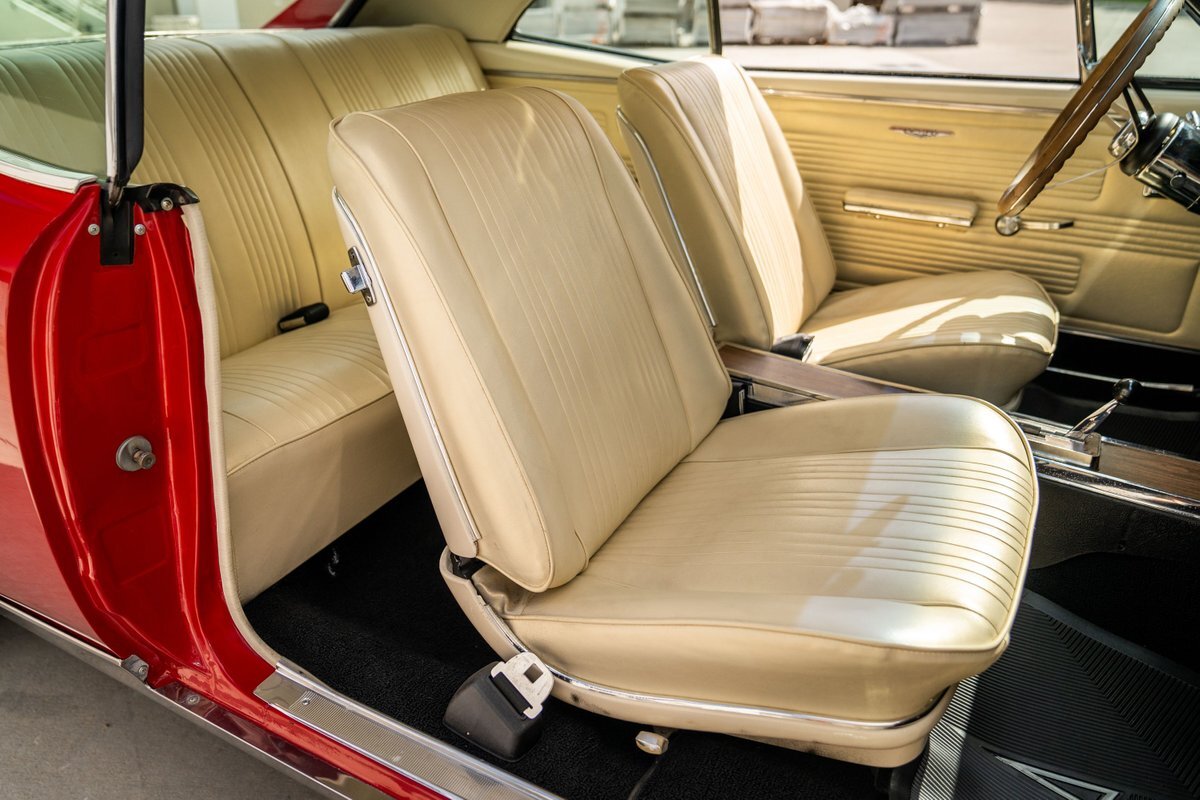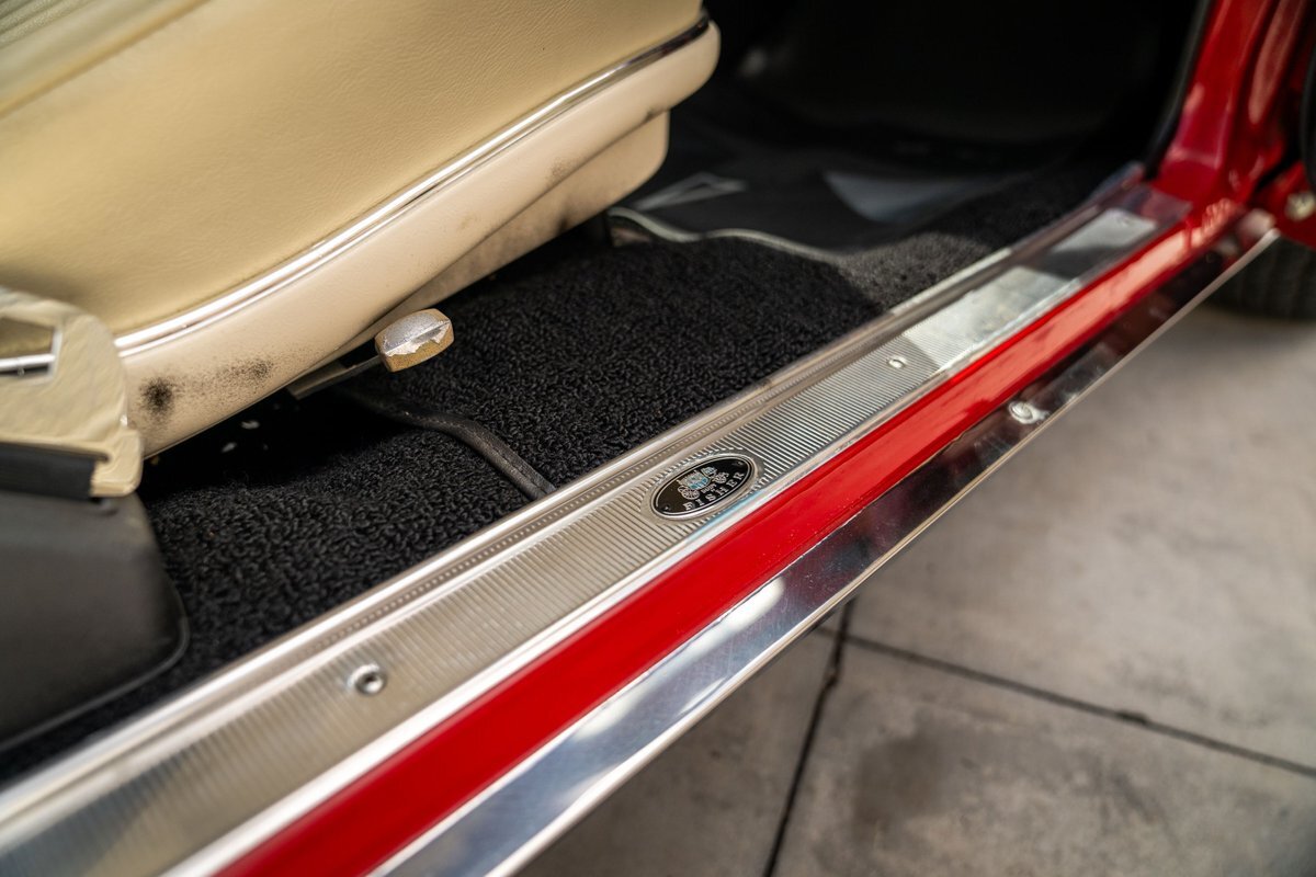 The cabin houses front bucket seats and a rear bench upholstered in Parchment vinyl, and interior appointments include a Hurst shifter, power windows, seatbelts, a full-length center console, an aftermarket AM/FM radio, and a locking glovebox. The air conditioner does not work. The wood-rimmed steering wheel fronts a 120-mph speedometer and a fuel-level gauge as well as warning lights for the battery, oil pressure, and temperature. The five-digit odometer shows 32k miles.