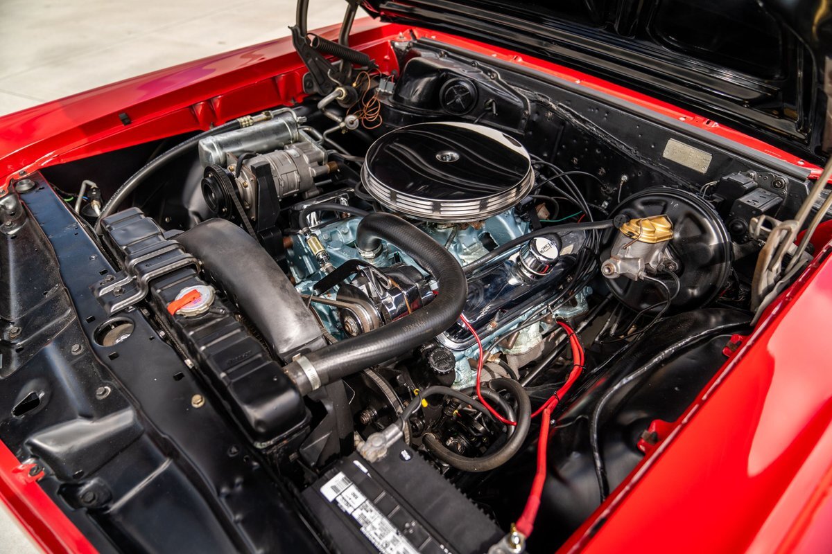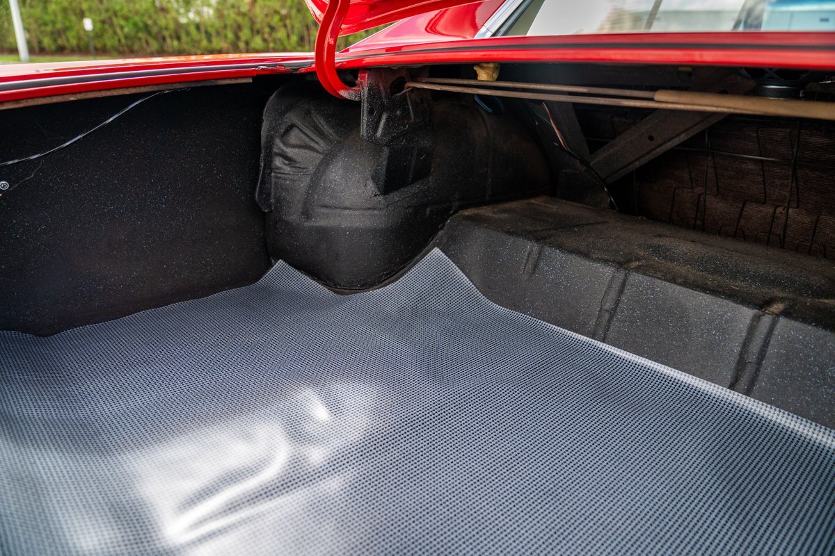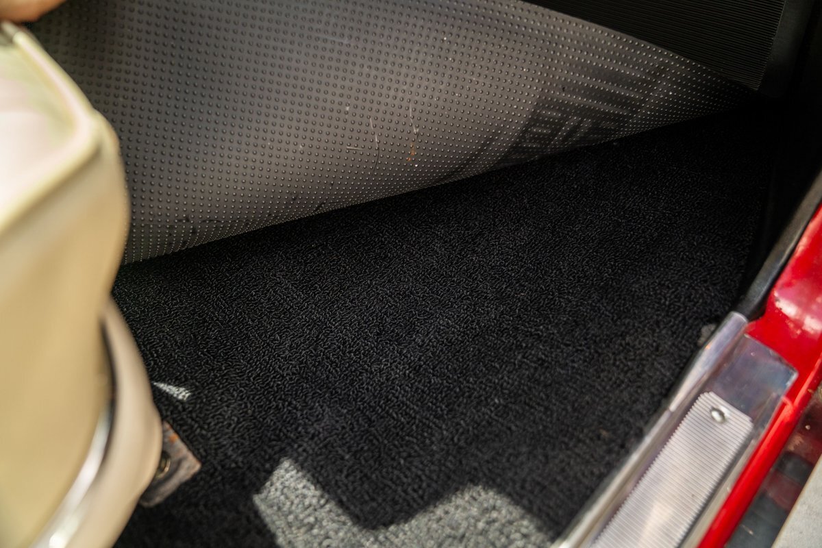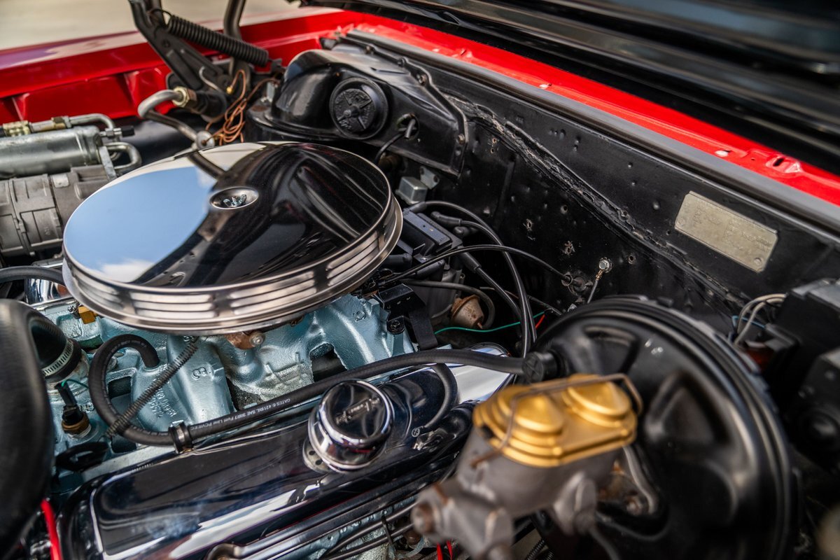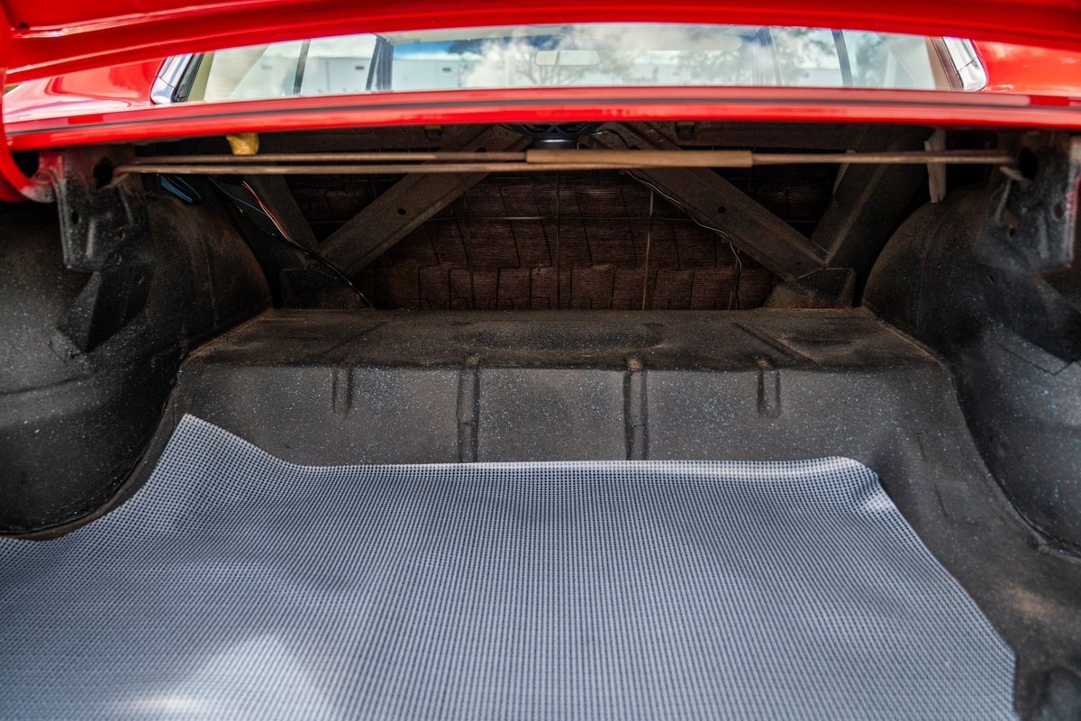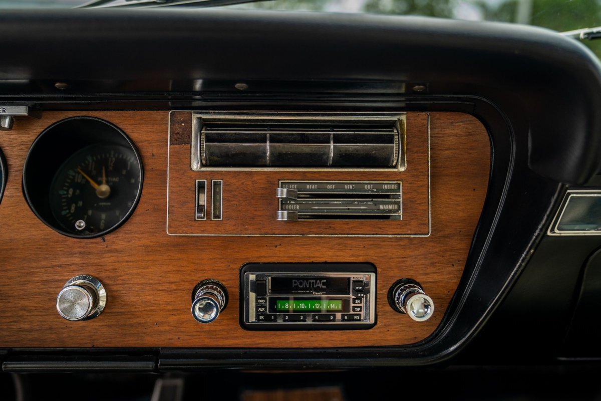 The cabin houses front bucket seats and a rear bench upholstered in Parchment vinyl, and interior appointments include a Hurst shifter, power windows, seatbelts, a full-length center console, an aftermarket AM/FM radio, and a locking glovebox. The air conditioner does not work. The wood-rimmed steering wheel fronts a 120-mph speedometer and a fuel-level gauge as well as warning lights for the battery, oil pressure, and temperature. The five-digit odometer shows 32k miles.
