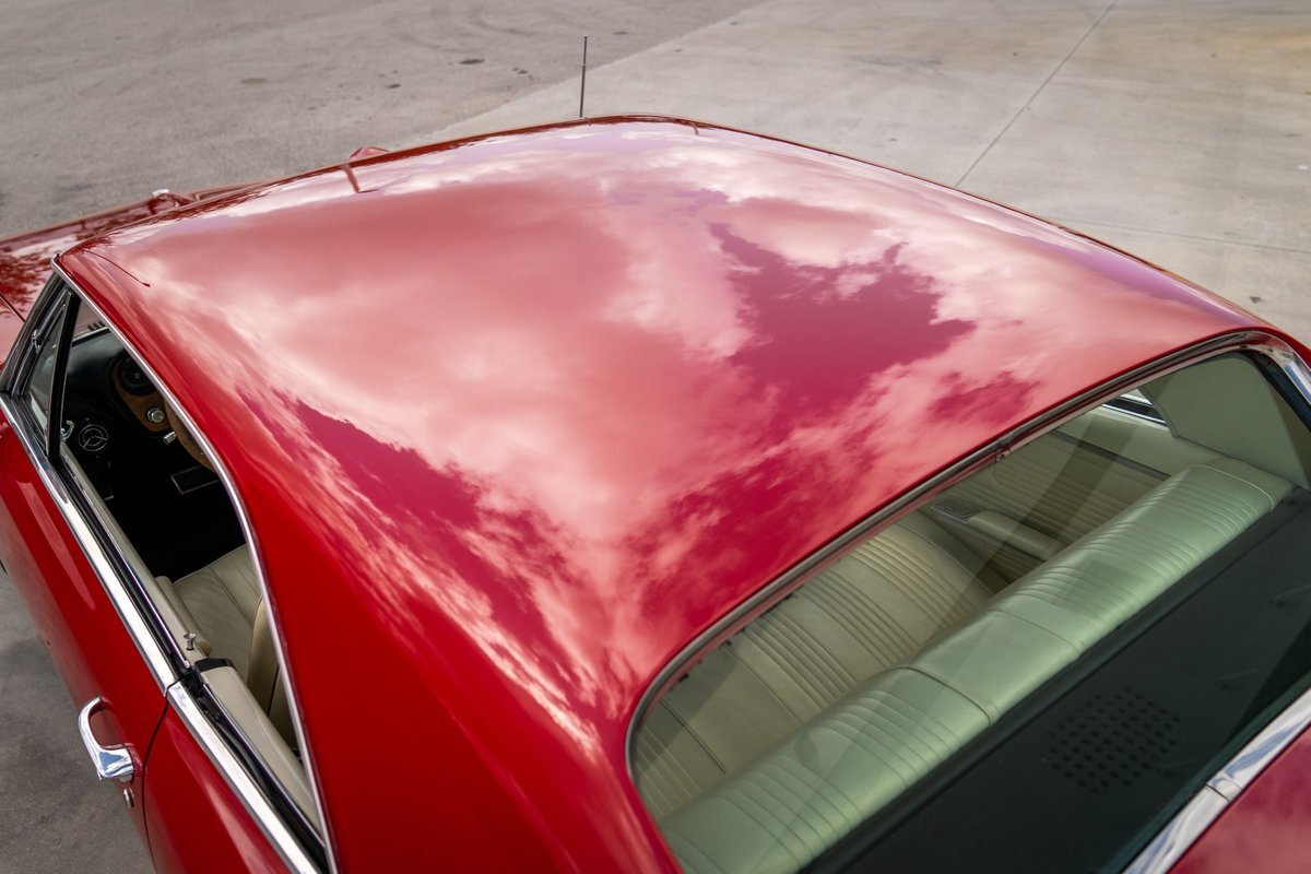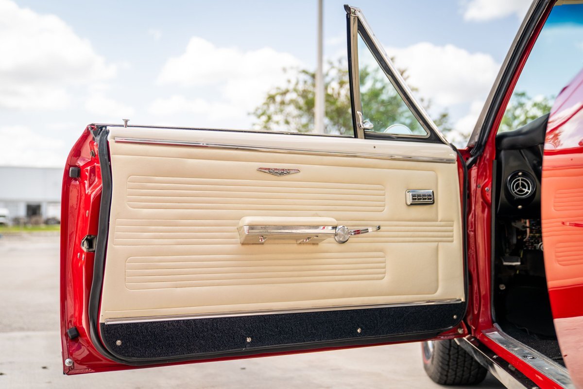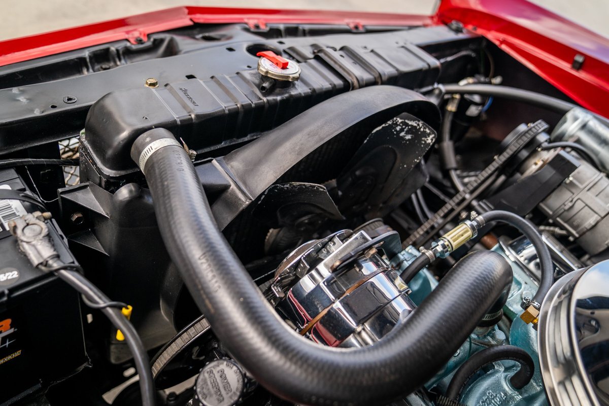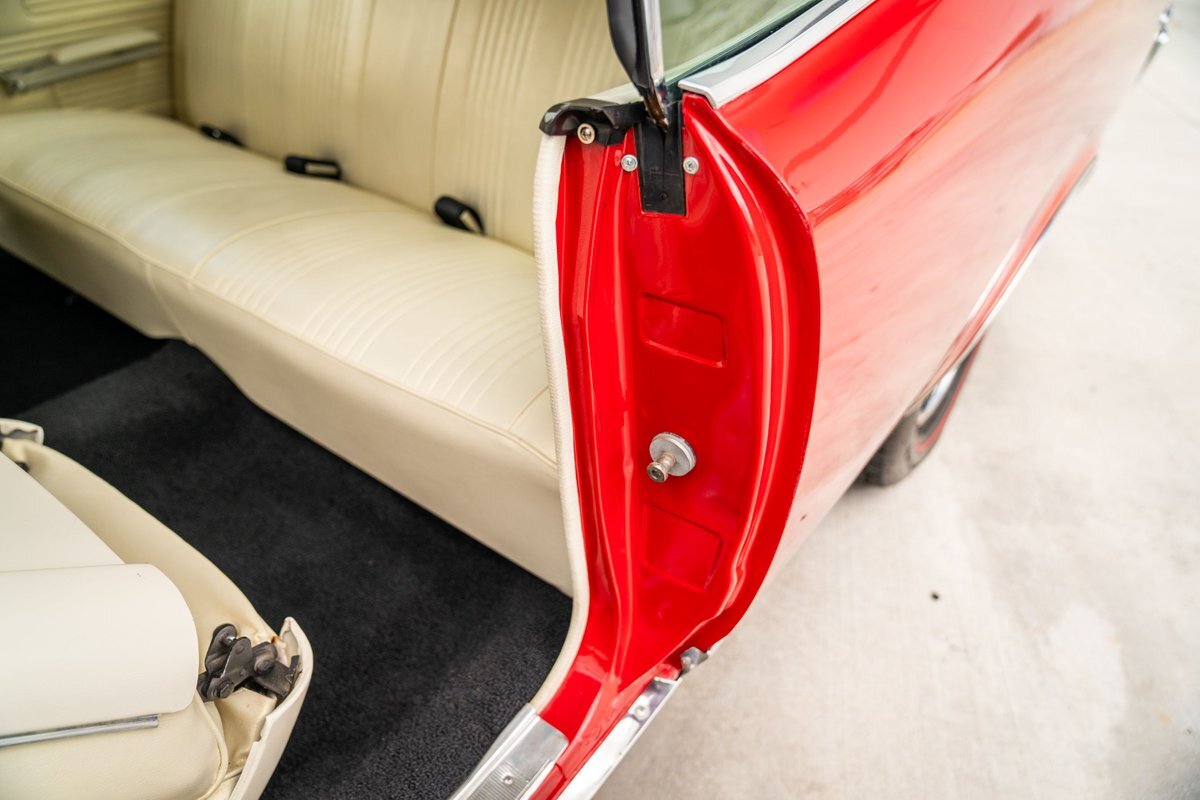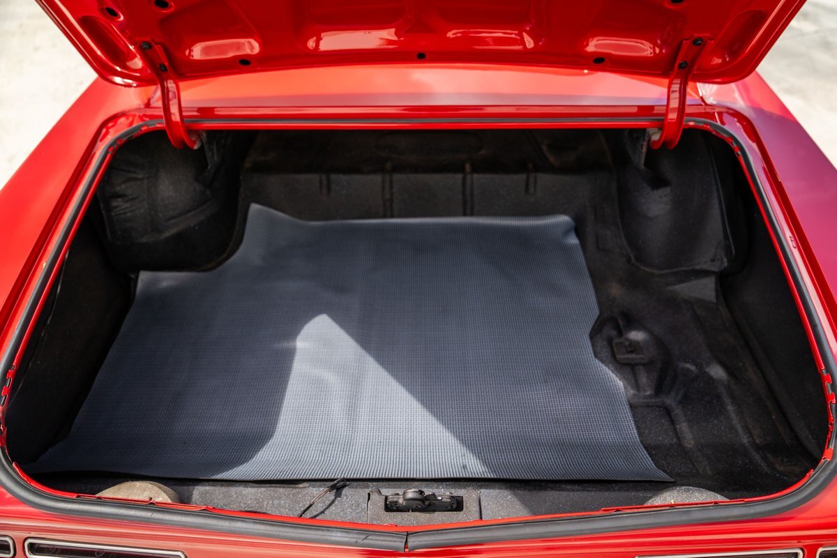 The cabin houses front bucket seats and a rear bench upholstered in Parchment vinyl, and interior appointments include a Hurst shifter, power windows, seatbelts, a full-length center console, an aftermarket AM/FM radio, and a locking glovebox. The air conditioner does not work. The wood-rimmed steering wheel fronts a 120-mph speedometer and a fuel-level gauge as well as warning lights for the battery, oil pressure, and temperature. The five-digit odometer shows 32k miles.