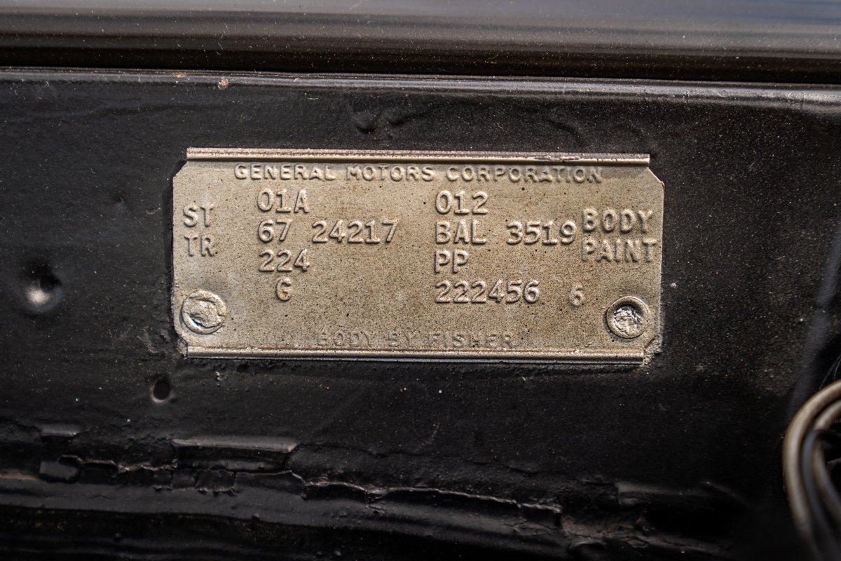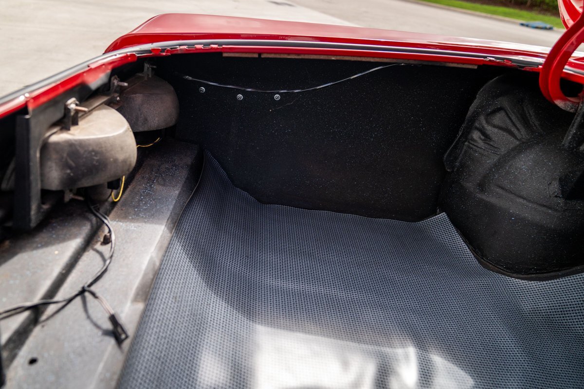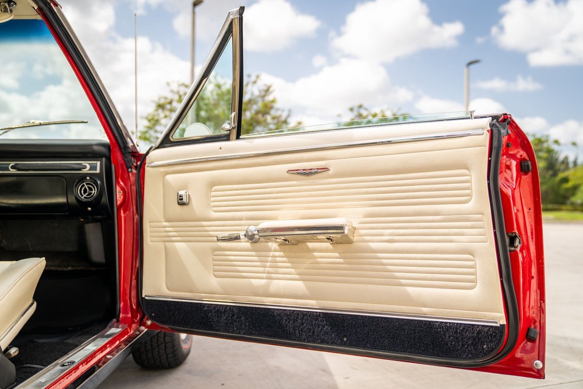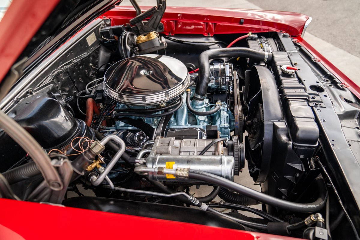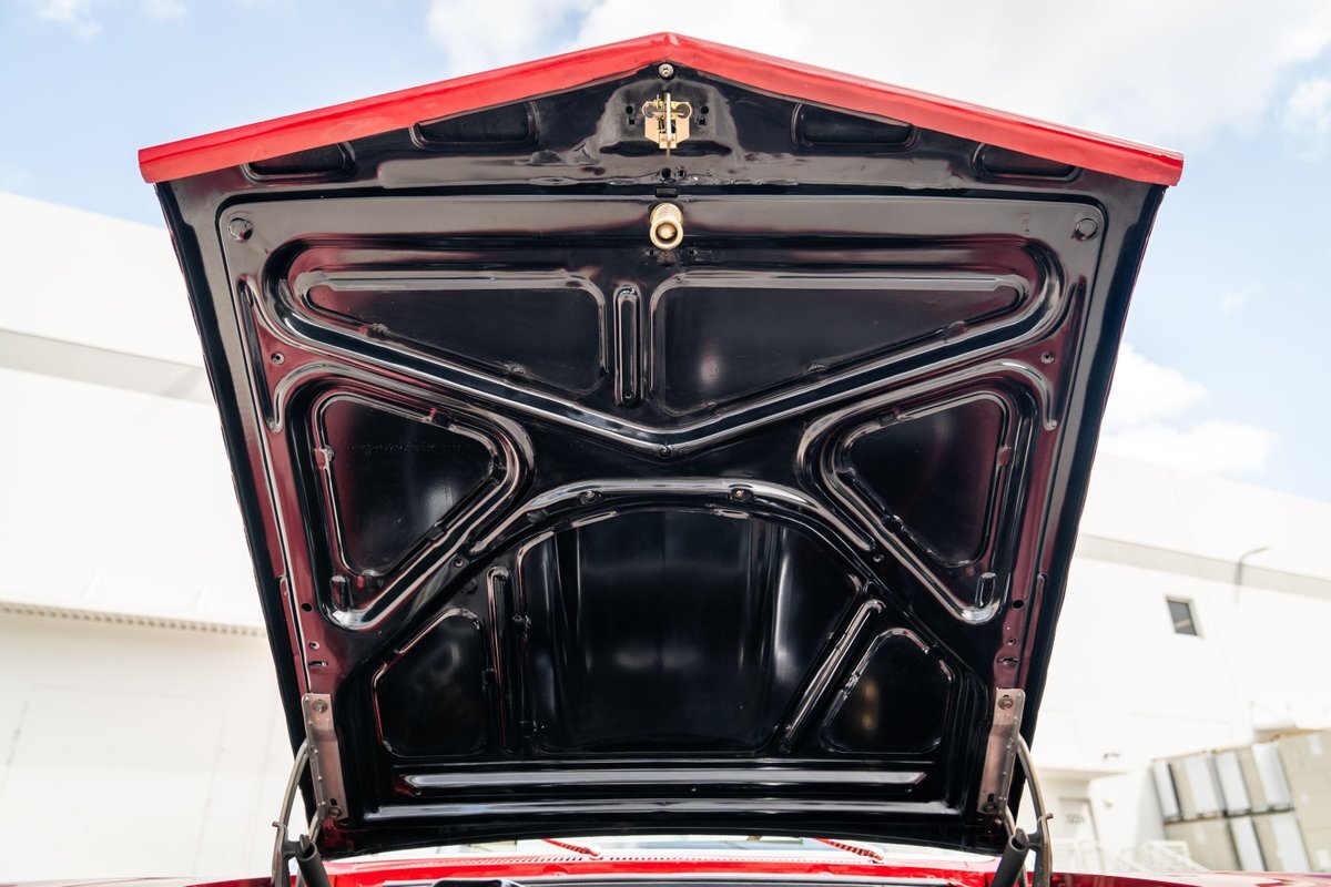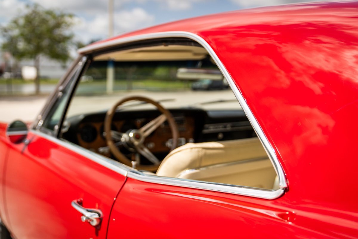 The cabin houses front bucket seats and a rear bench upholstered in Parchment vinyl, and interior appointments include a Hurst shifter, power windows, seatbelts, a full-length center console, an aftermarket AM/FM radio, and a locking glovebox. The air conditioner does not work. The wood-rimmed steering wheel fronts a 120-mph speedometer and a fuel-level gauge as well as warning lights for the battery, oil pressure, and temperature. The five-digit odometer shows 32k miles.