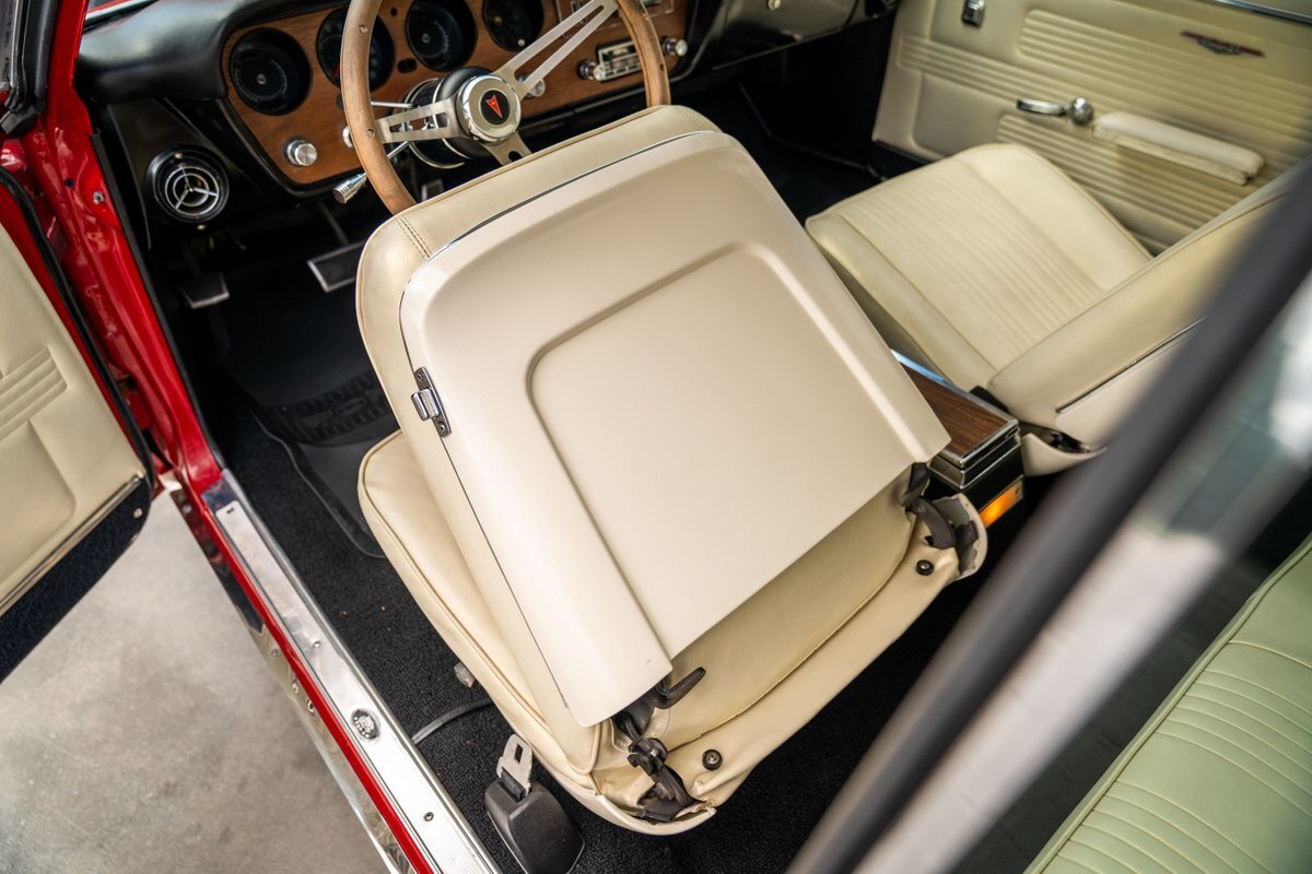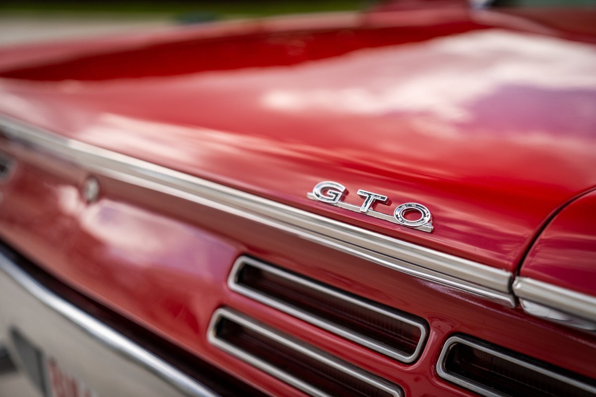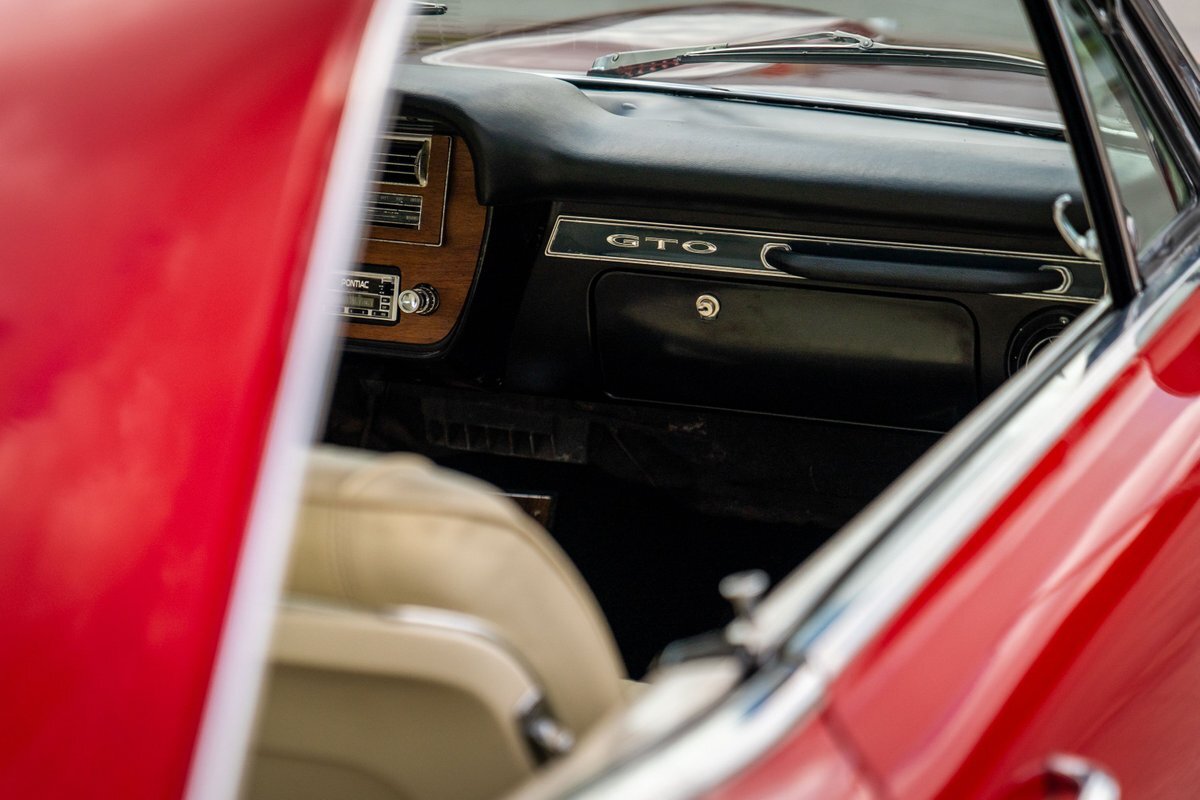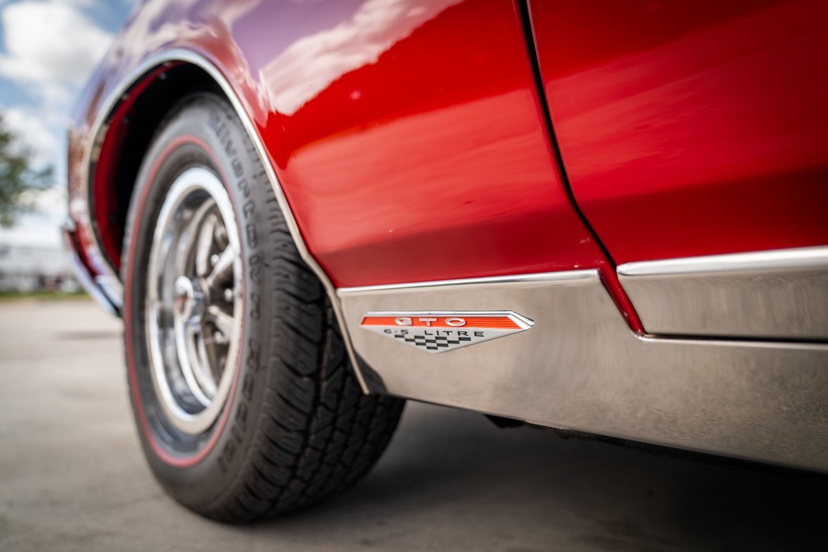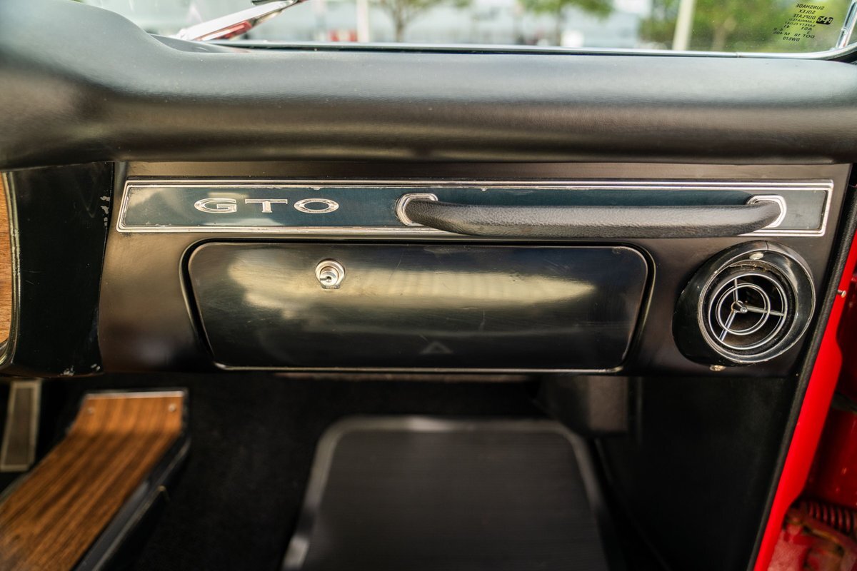 The car was finished at the factory in Silverglaze (P), and it was refinished in red under previous ownership. Features include stacked headlights, a hood scoop, dual side mirrors, GTO badging, and chrome trim on the grille, bumpers, window surrounds, and rocker panels. Paint imperfections are discussed in the video below.
