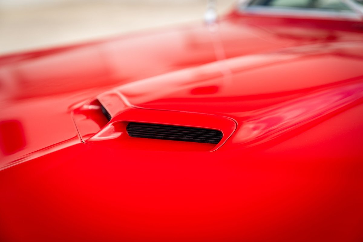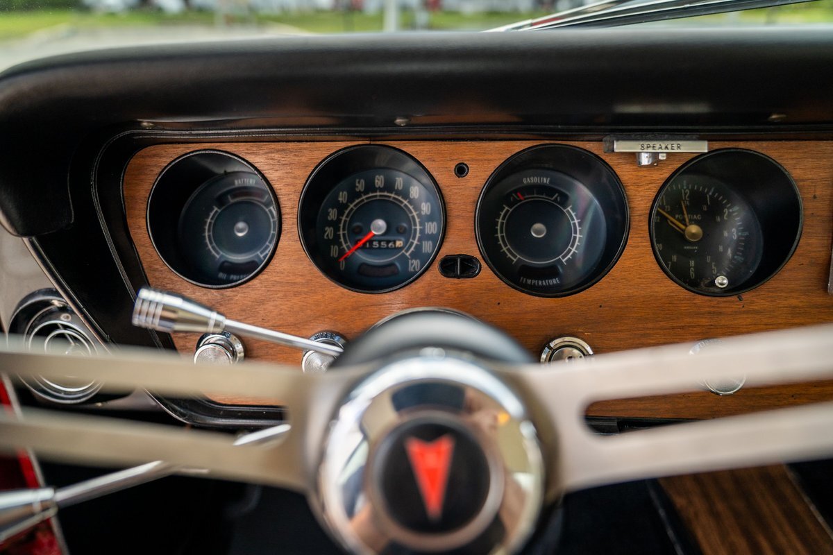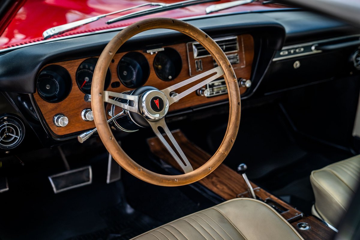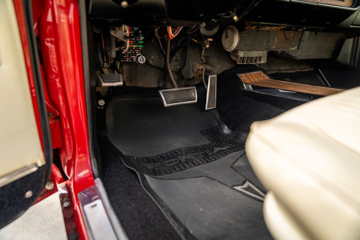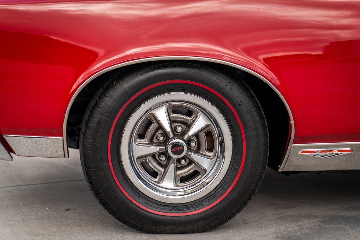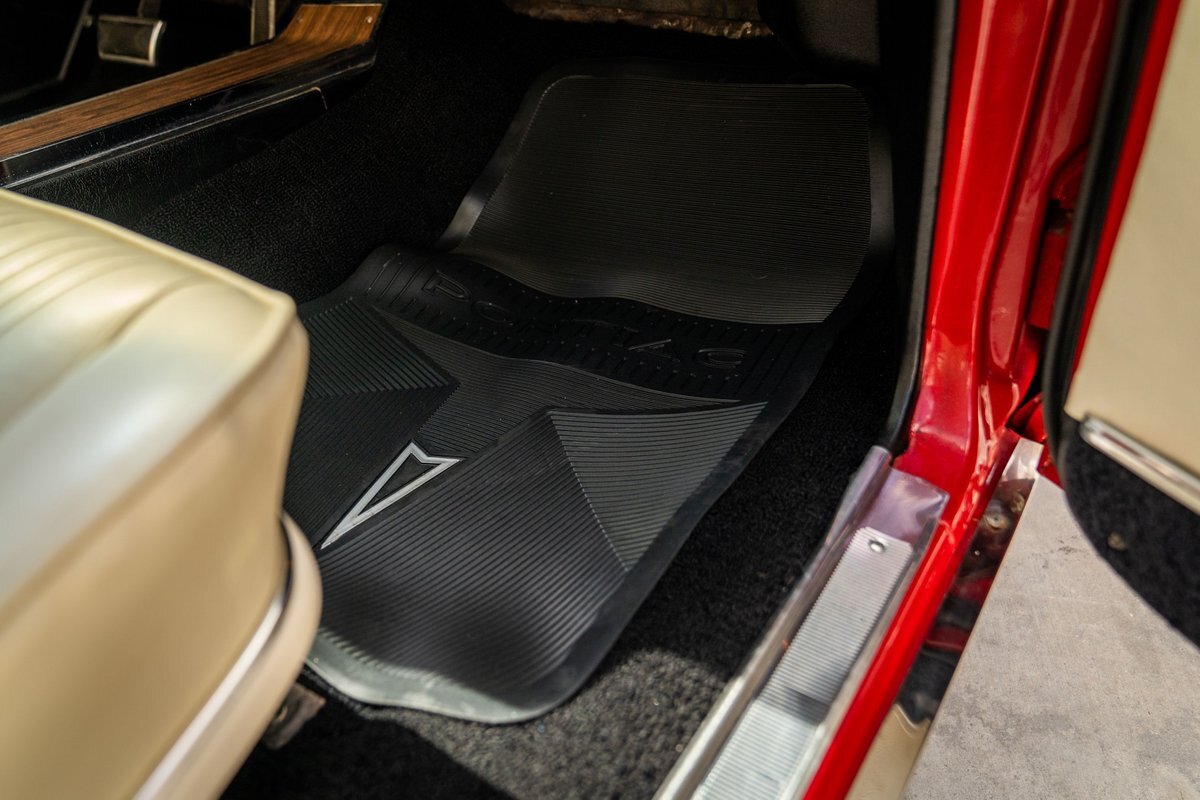 The car was finished at the factory in Silverglaze (P), and it was refinished in red under previous ownership. Features include stacked headlights, a hood scoop, dual side mirrors, GTO badging, and chrome trim on the grille, bumpers, window surrounds, and rocker panels. Paint imperfections are discussed in the video below.