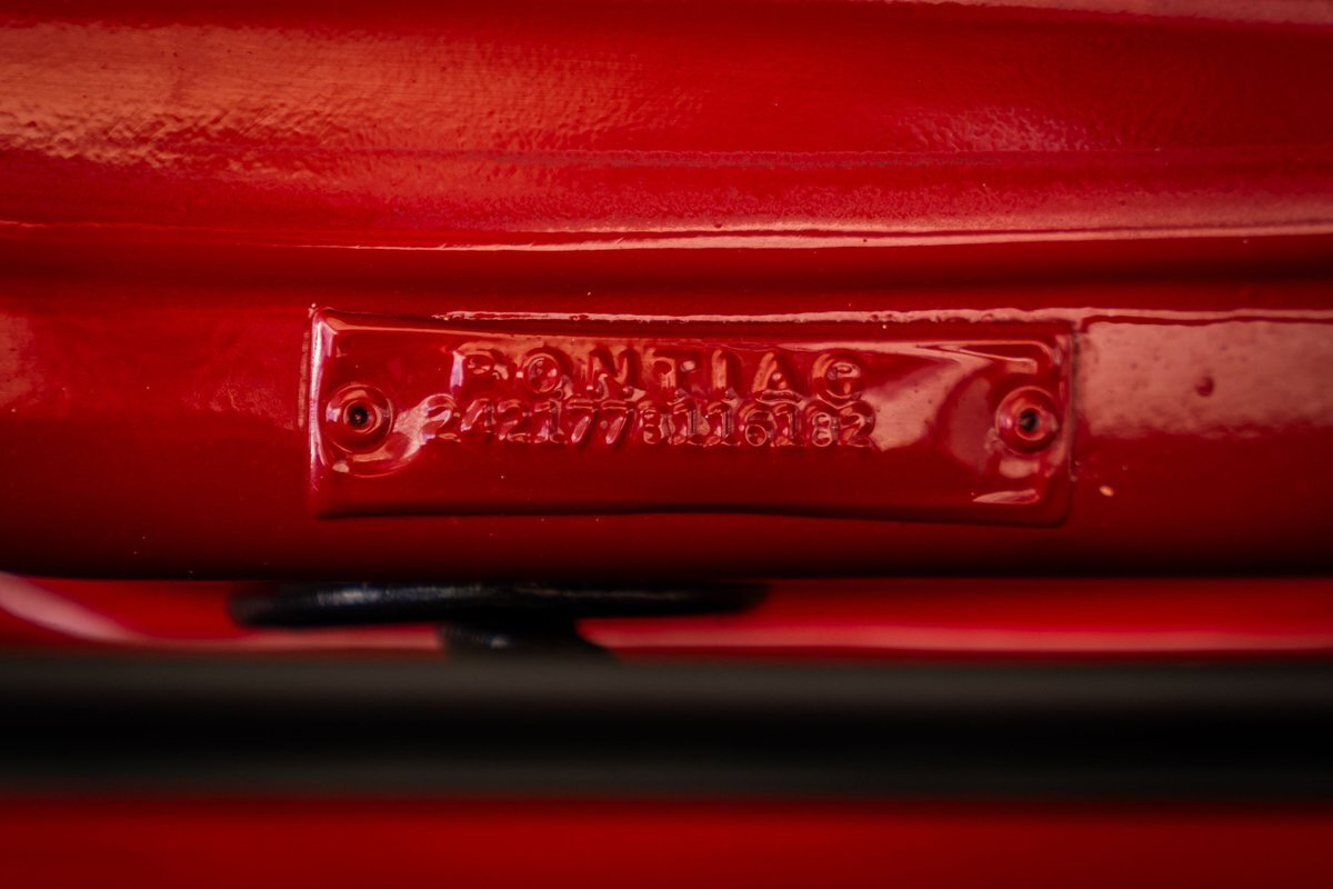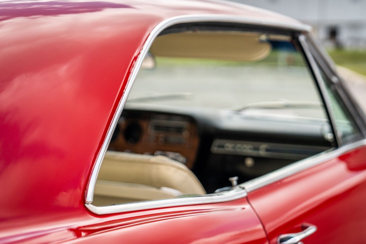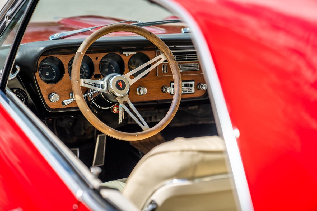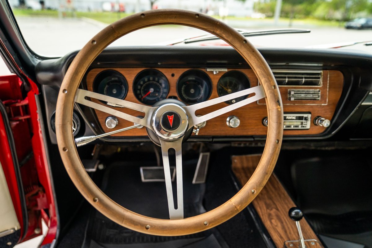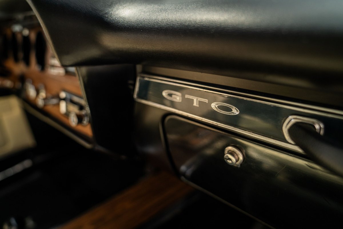 The car was finished at the factory in Silverglaze (P), and it was refinished in red under previous ownership. Features include stacked headlights, a hood scoop, dual side mirrors, GTO badging, and chrome trim on the grille, bumpers, window surrounds, and rocker panels. Paint imperfections are discussed in the video below.
