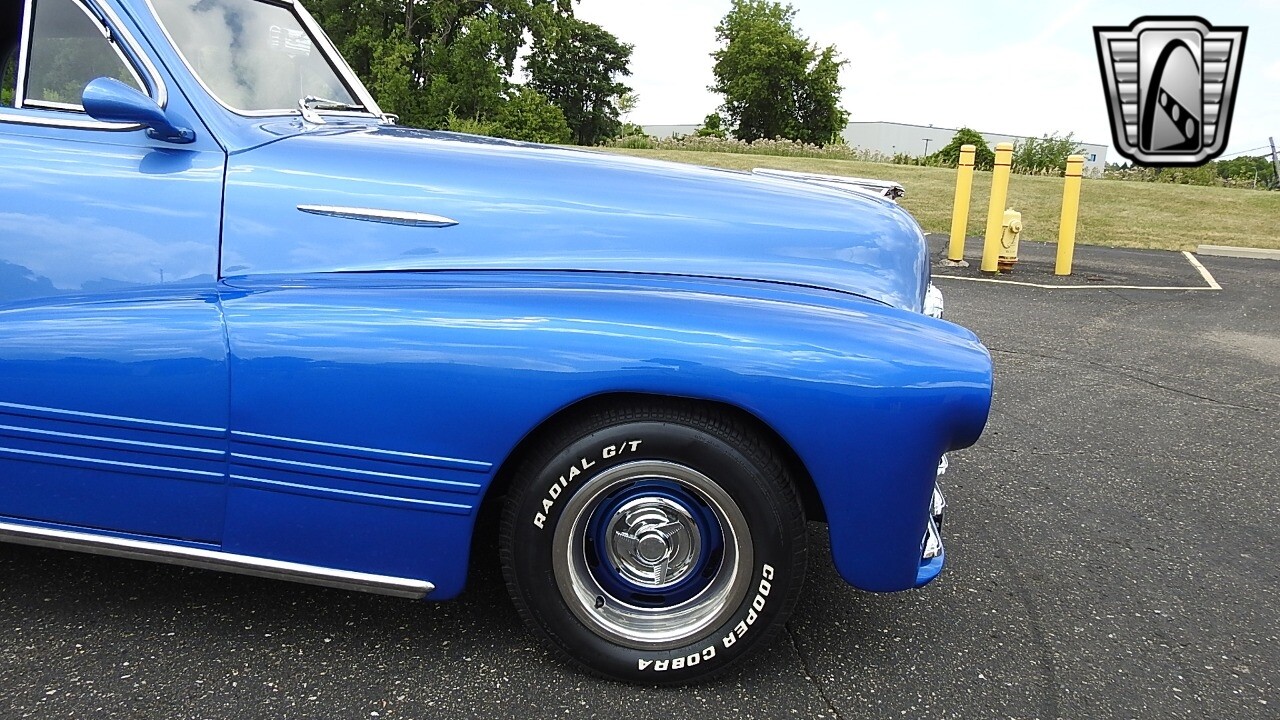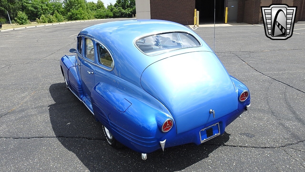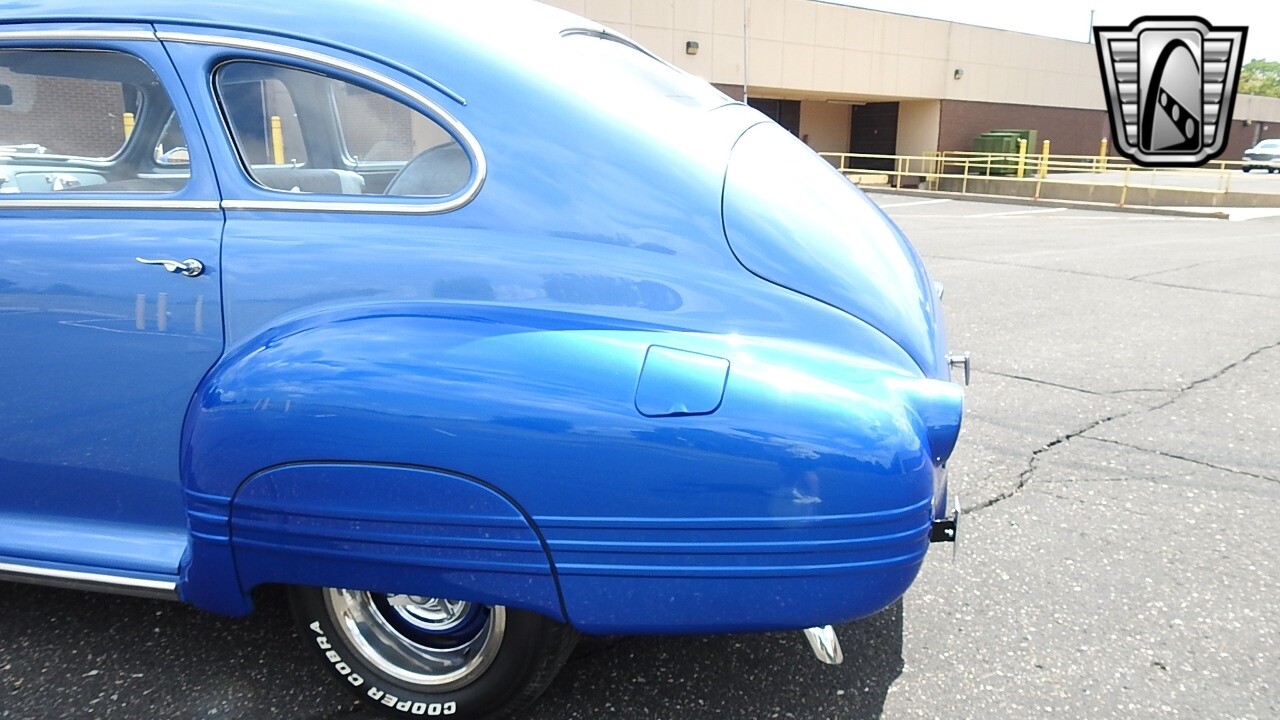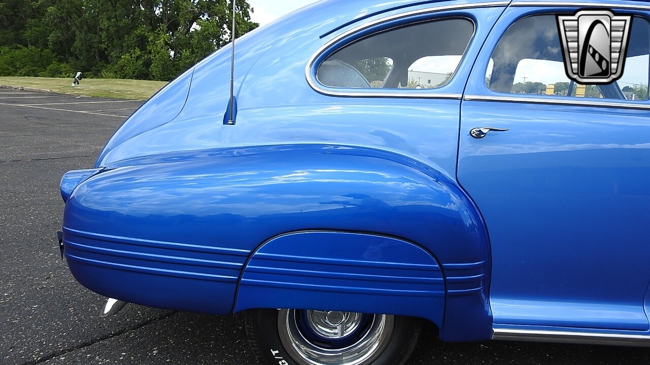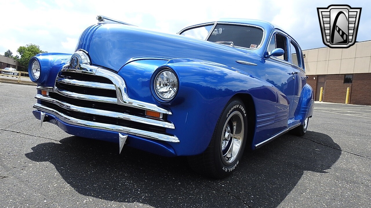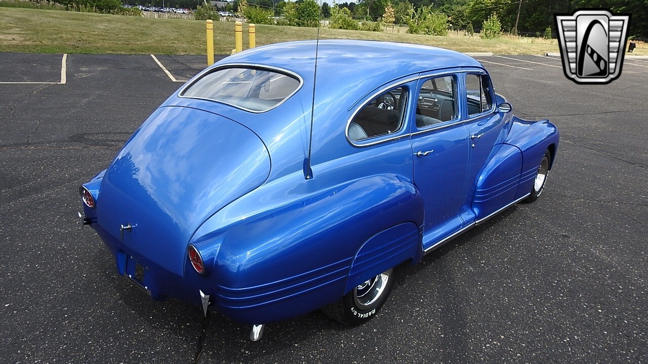 Gateway Classic Cars is proud to present this 1947 Pontiac Streamliner. Powering this blue meanie is a pontiac 350 v8 with a 200 r4 transmission with an overdrive gear. Behind the transmission is a 8.5 10-bolt rear end. This steamliner has had a full restoration, including some modern touches. The front sub frame was done with a Mustang II power rack and pinion steering. On the inside, you will be greeted with a custom made bullet instrument panel, a tilt steering column with a boomerang steering wheel. You can play any kind of tunes you like with the retro sound radio with an AUX port. Front and rear 6x9 Pioneer speakers, custom made kick panels and bullet door handles. Looking at this Streamliner from the outside, you will notice the front and rear aluminum bumper caps with Pontiac logos. The customization's continue on the outside with door and trunk handles from a 34 Ford Roadster, frenched power antenna, shaved decklid, 41 Ford led fluted lamps in the front, leaded in 49 Lincoln taillamps in the rear, with custom front and rear roll pans. Lots of chrome everywhere! Everything from the paint to the interior are in very good condition, so don't let this one pass you up!.