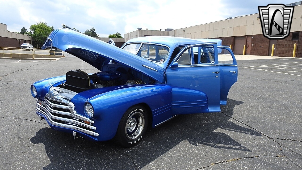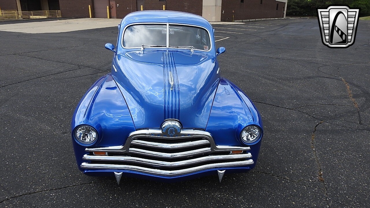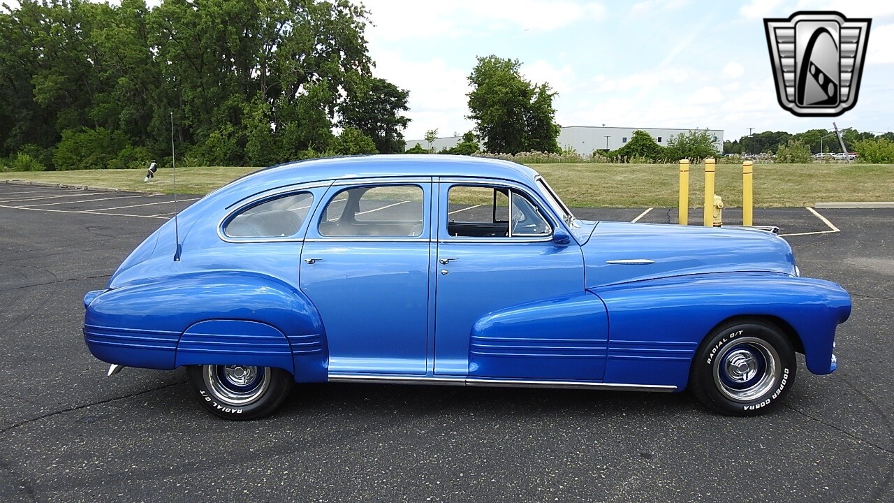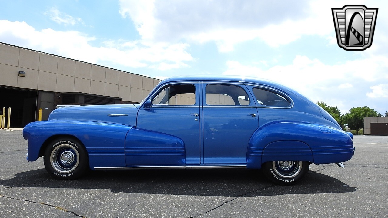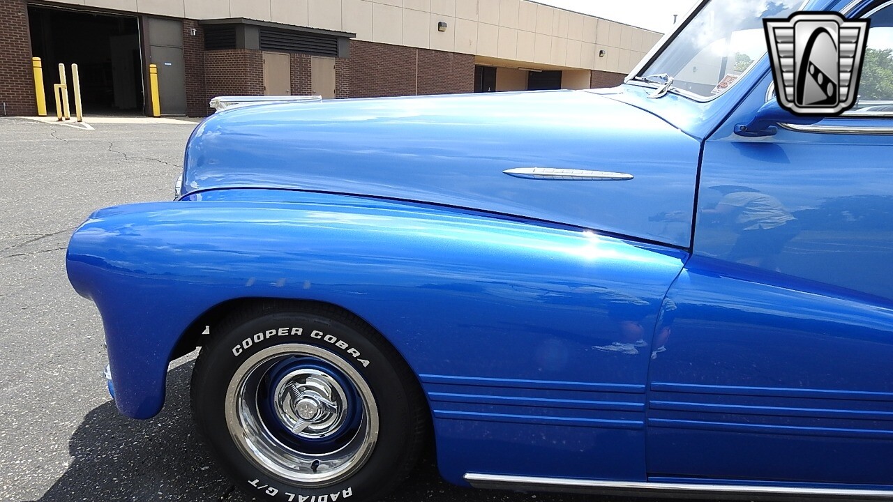 Gateway Classic Cars is proud to present this 1947 Pontiac Streamliner. Powering this blue meanie is a pontiac 350 v8 with a 200 r4 transmission with an overdrive gear. Behind the transmission is a 8.5 10-bolt rear end. This steamliner has had a full restoration, including some modern touches. The front sub frame was done with a Mustang II power rack and pinion steering. On the inside, you will be greeted with a custom made bullet instrument panel, a tilt steering column with a boomerang steering wheel. You can play any kind of tunes you like with the retro sound radio with an AUX port. Front and rear 6x9 Pioneer speakers, custom made kick panels and bullet door handles. Looking at this Streamliner from the outside, you will notice the front and rear aluminum bumper caps with Pontiac logos. The customization's continue on the outside with door and trunk handles from a 34 Ford Roadster, frenched power antenna, shaved decklid, 41 Ford led fluted lamps in the front, leaded in 49 Lincoln taillamps in the rear, with custom front and rear roll pans. Lots of chrome everywhere! Everything from the paint to the interior are in very good condition, so don't let this one pass you up!.